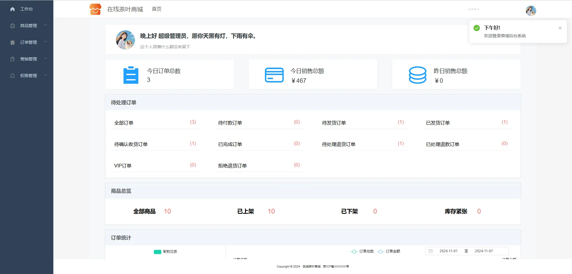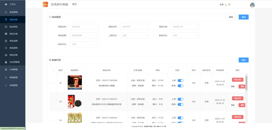本系统是基于SpringBoot和Vue等技术栈实现的一个在线茶叶商城系统,它适用于B2C、单商户、自营商城模式,支持私域流量运营和闭环交易,能够满足个性化茶叶消费场景,可以有效降低商家的运营成本,提高销售转化率,同时提升用户购物的便捷性和满意度,实现商家与消费者的双赢。整体来看,本系统能够实现茶叶的在线交易完整业务流程,具备较高的实用价值和推广潜力。
