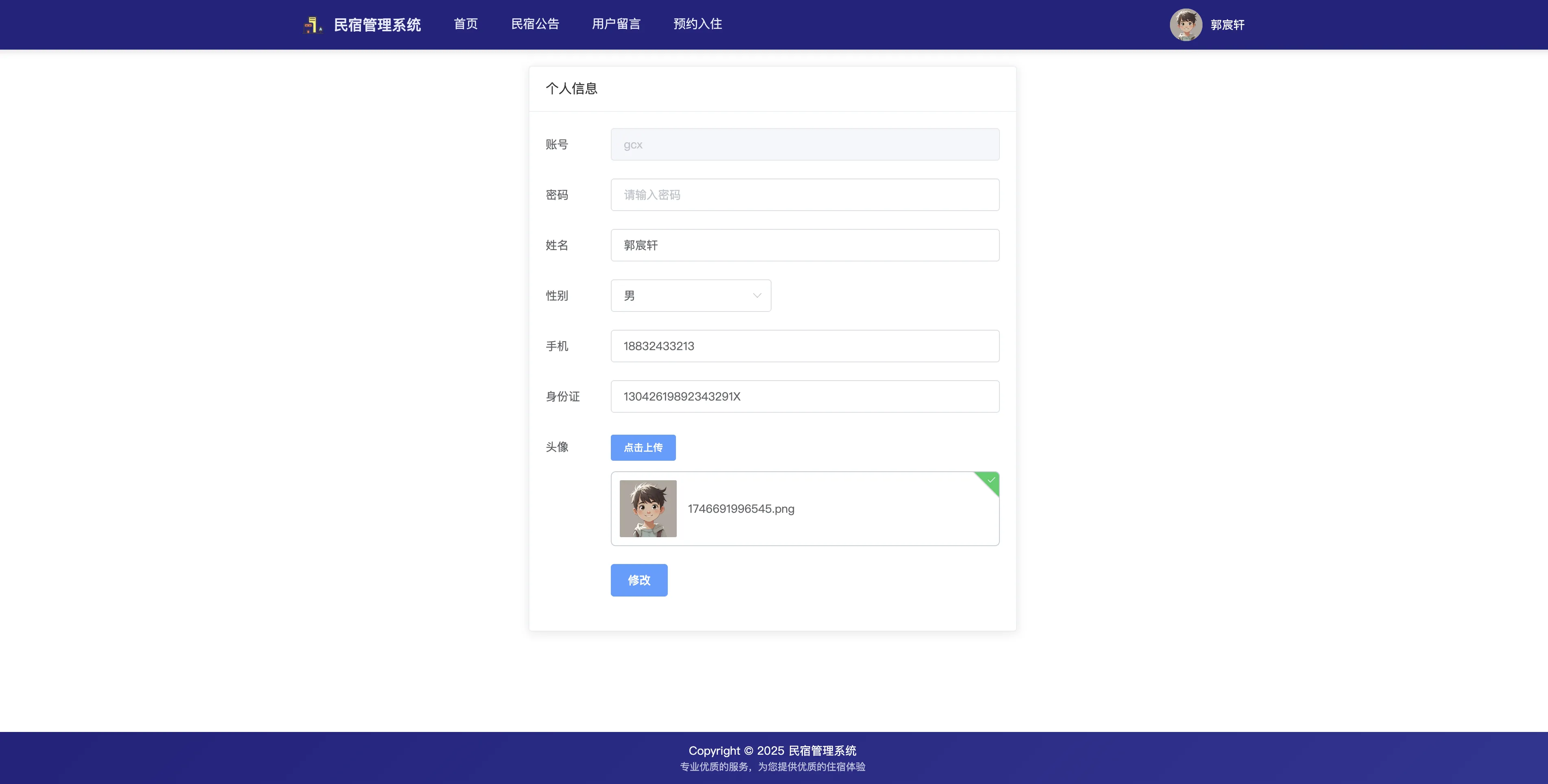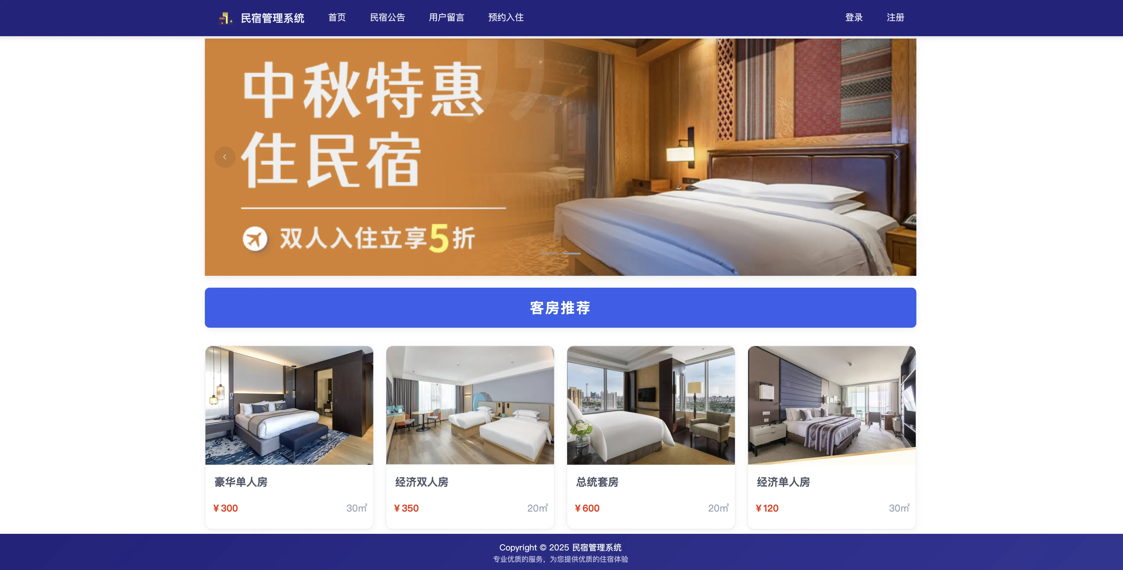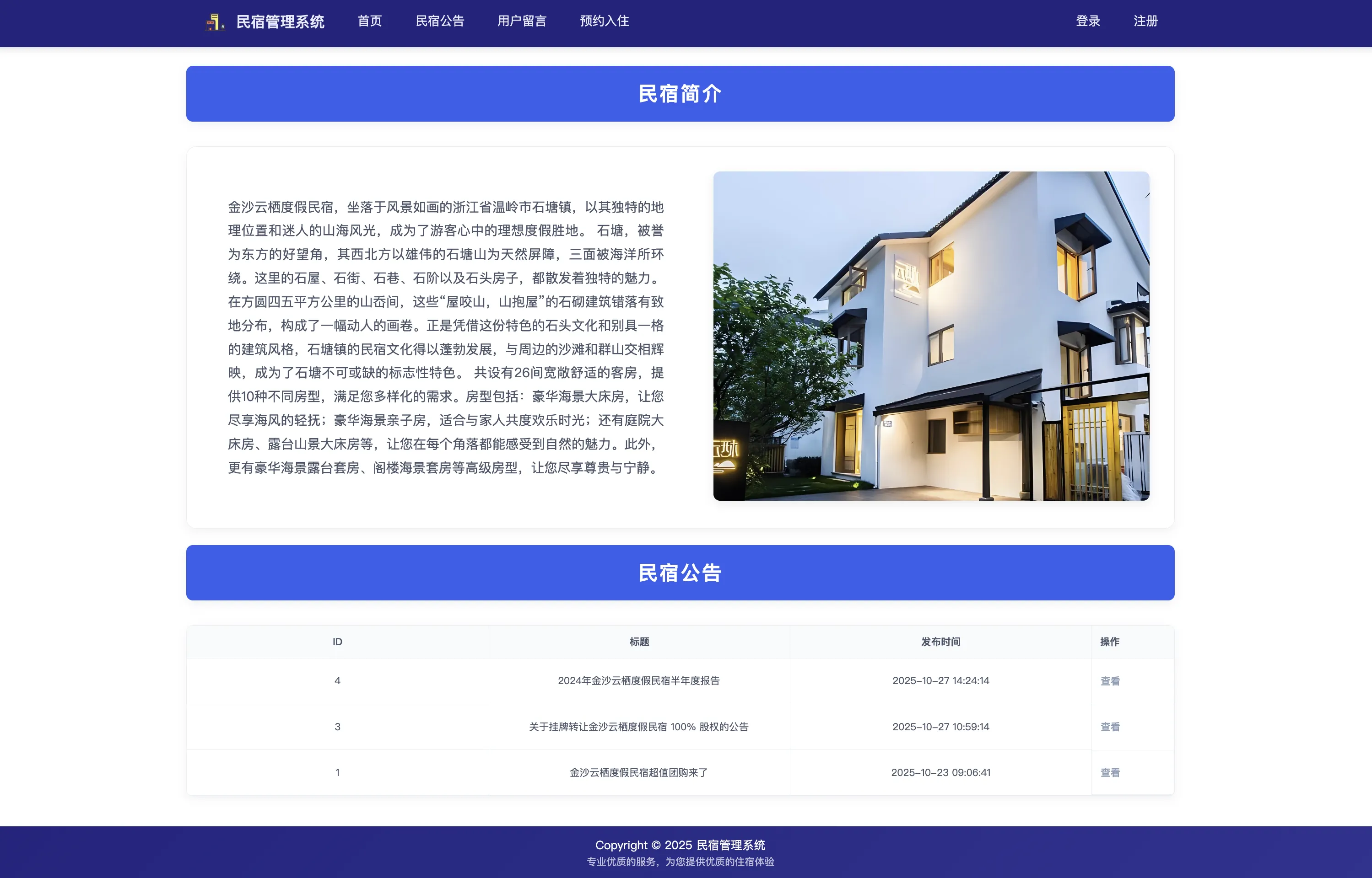 本系统支持管理员与普通用户两类角色权限,管理员可进行房型管理、房间管理、用户预约管理、入住管理、留言管理、公告发布等操作;普通用户则可注册登录、查看公告、在线预约、留言互动、查看入住记录等。本系统功能设计简洁合理,涵盖了典型的民宿业务流程,具有良好的实用性与扩展性,也适用于高校学生作为毕业设计、课程设计课题选型。