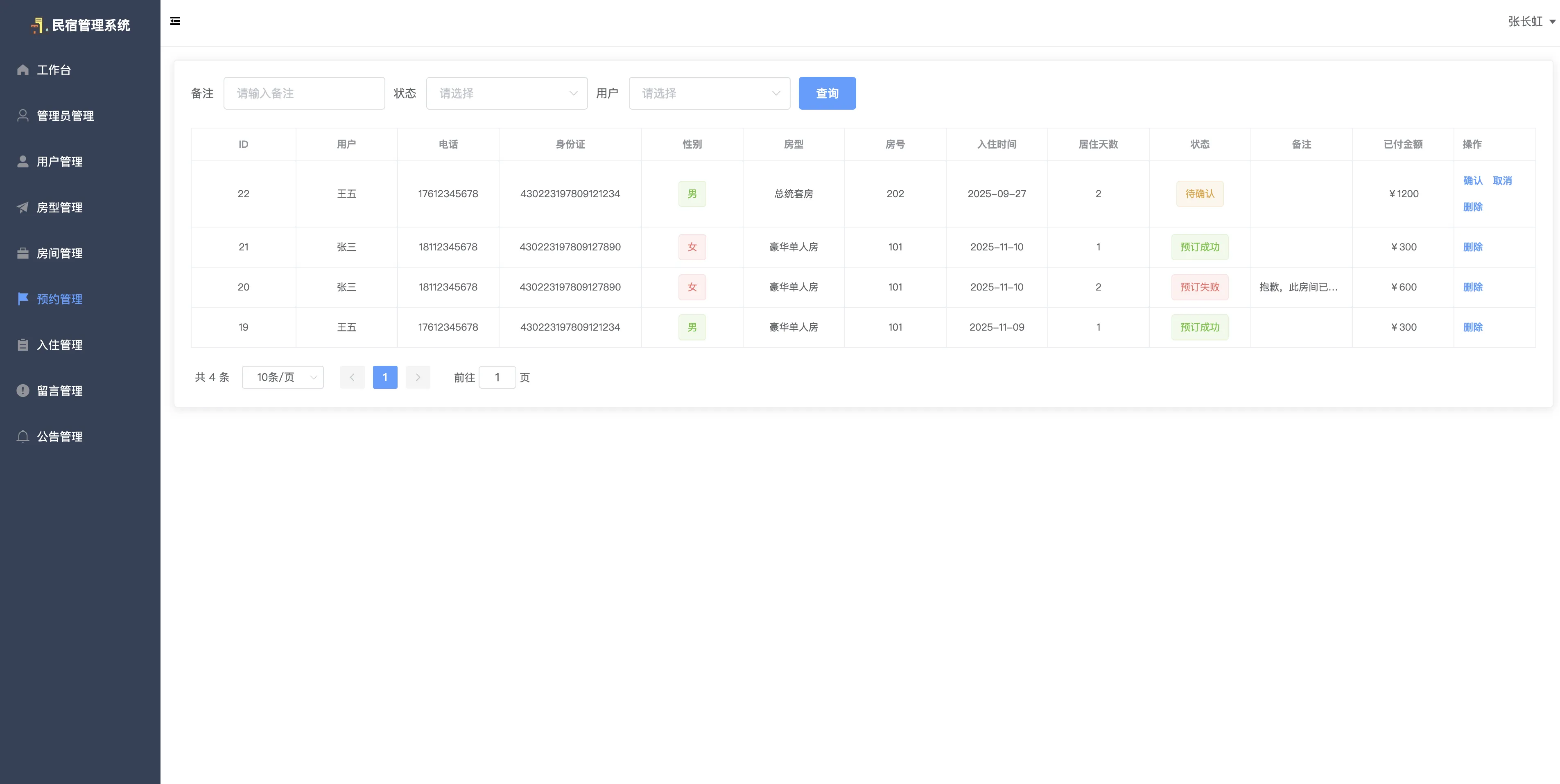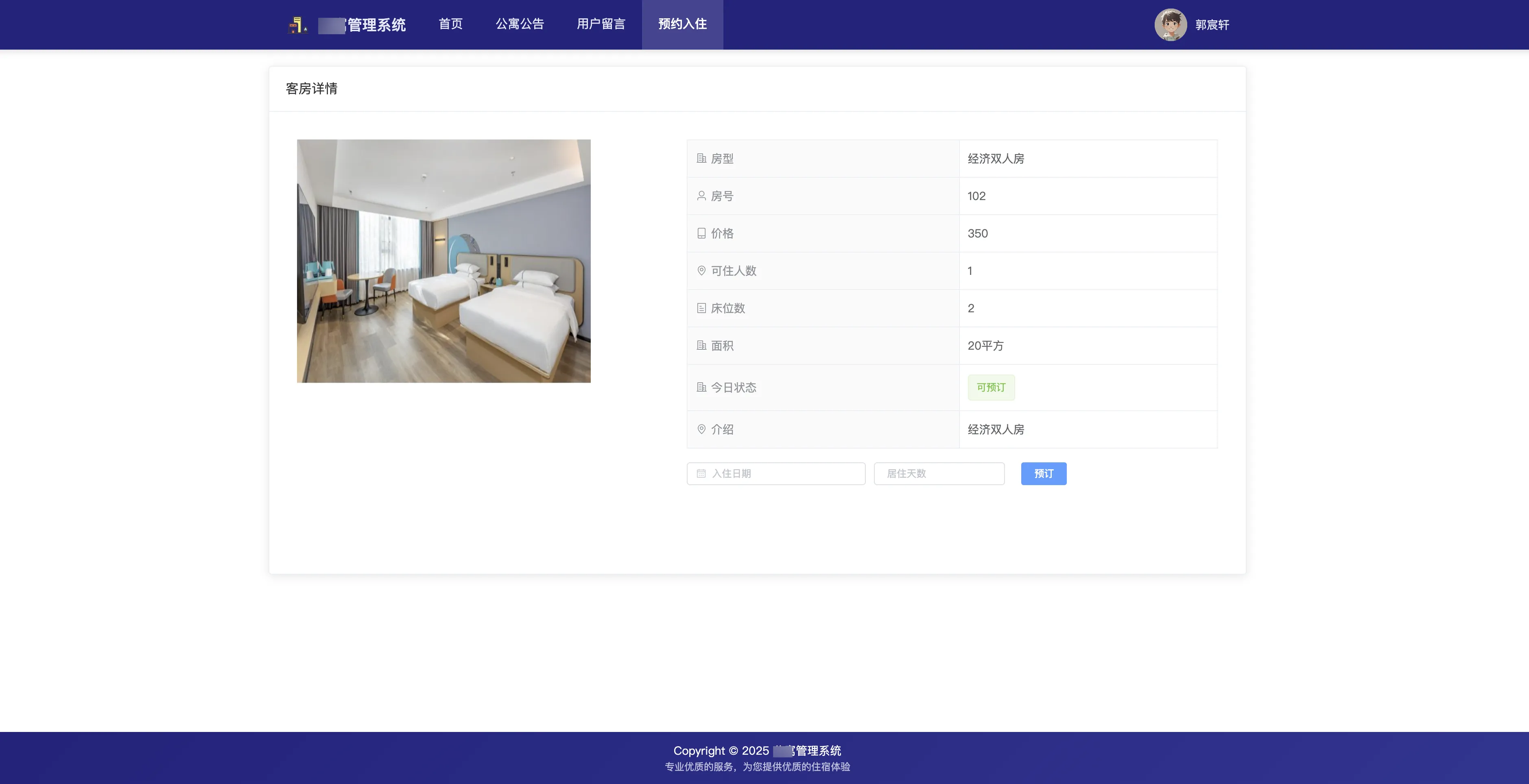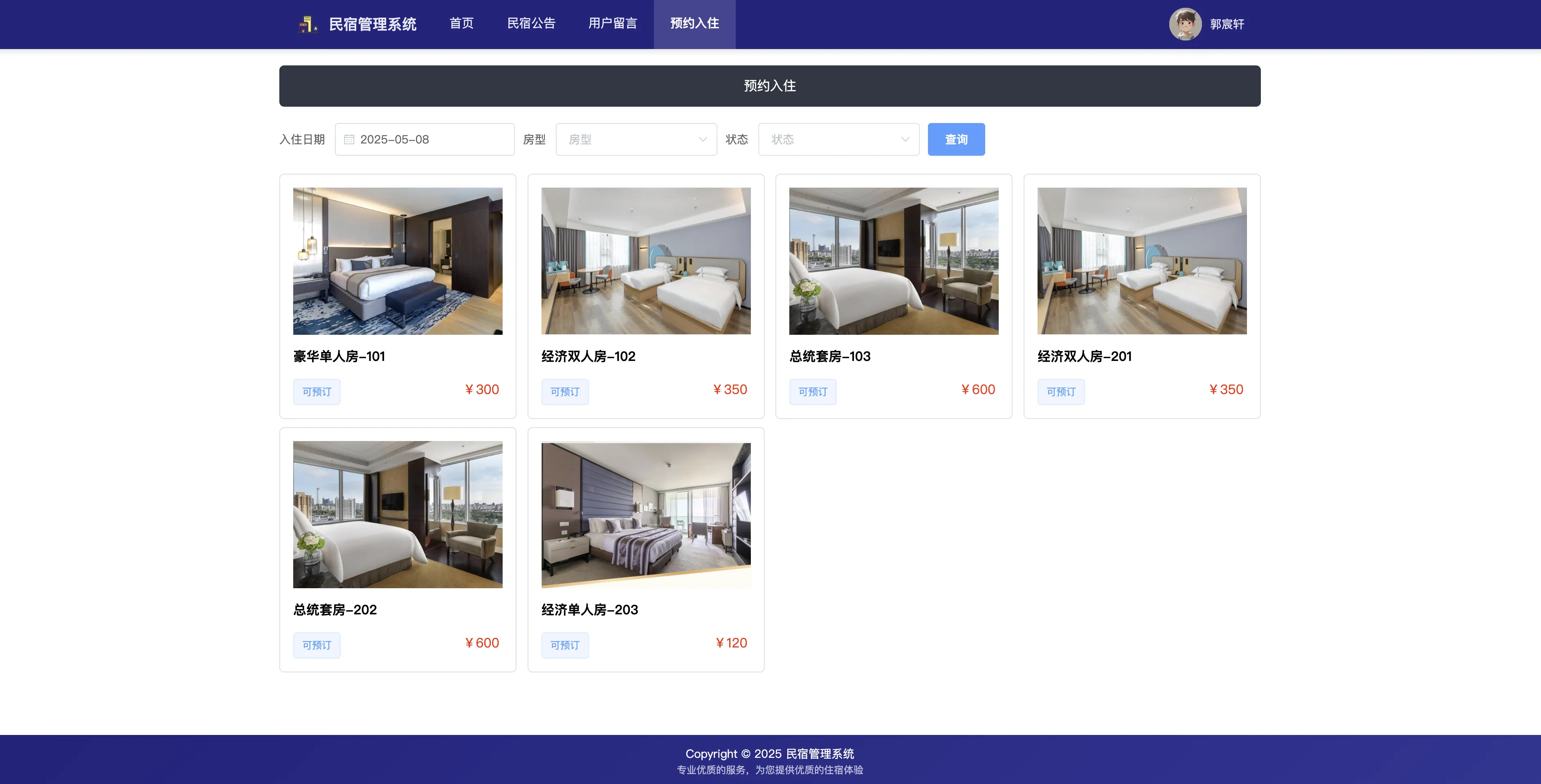 本系统支持管理员与普通用户两类角色权限,管理员可进行房型管理、房间管理、用户预约管理、入住管理、留言管理、公告发布等操作;普通用户则可注册登录、查看公告、在线预约、留言互动、查看入住记录等。本系统功能设计简洁合理,涵盖了典型的民宿业务流程,具有良好的实用性与扩展性,也适用于高校学生作为毕业设计、课程设计课题选型。