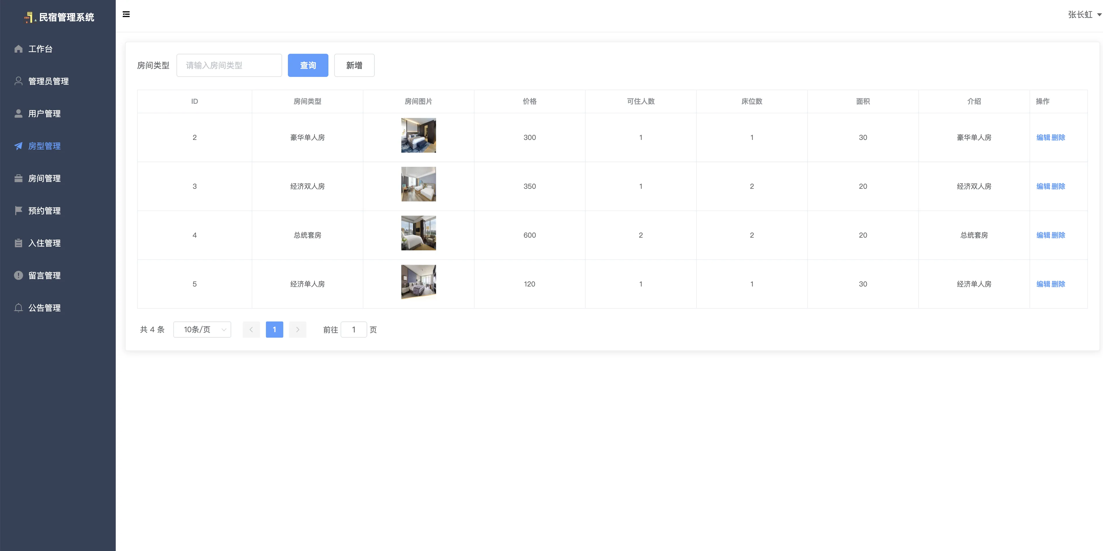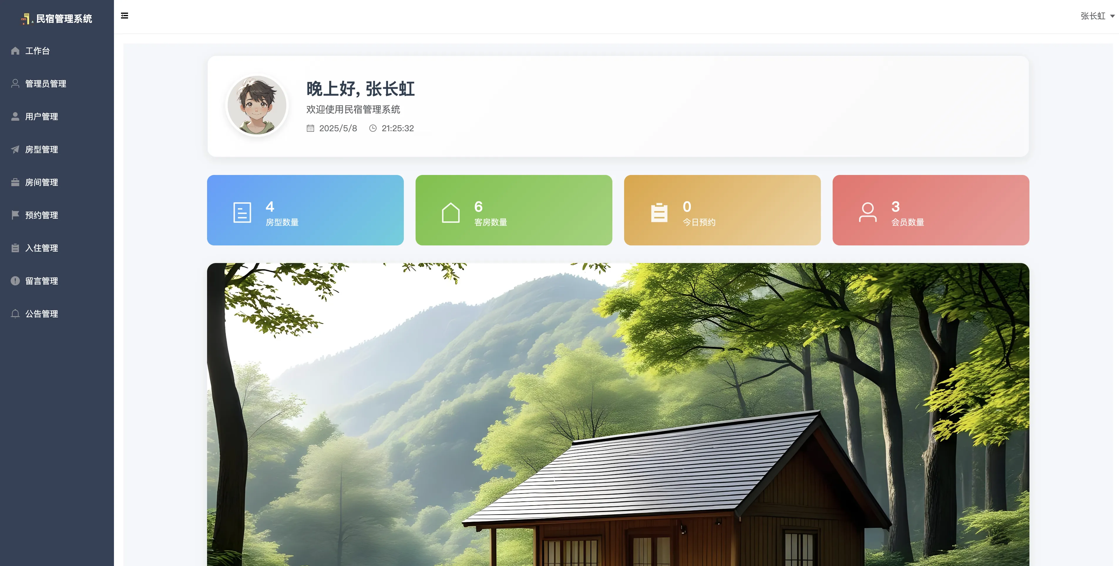 本项目是一款基于 SpringBoot 与 Vue 技术栈开发的民宿管理系统,采用前后端分离开发模式,整体系统架构为 B/S 架构,后端使用 SpringBoot 构建 RESTful API,前端采用 Vue 实现交互界面,数据存储使用 MySQL 数据库。本系统主要面向中小型民宿经营者或平台方,提供一套完整的信息化管理解决方案。