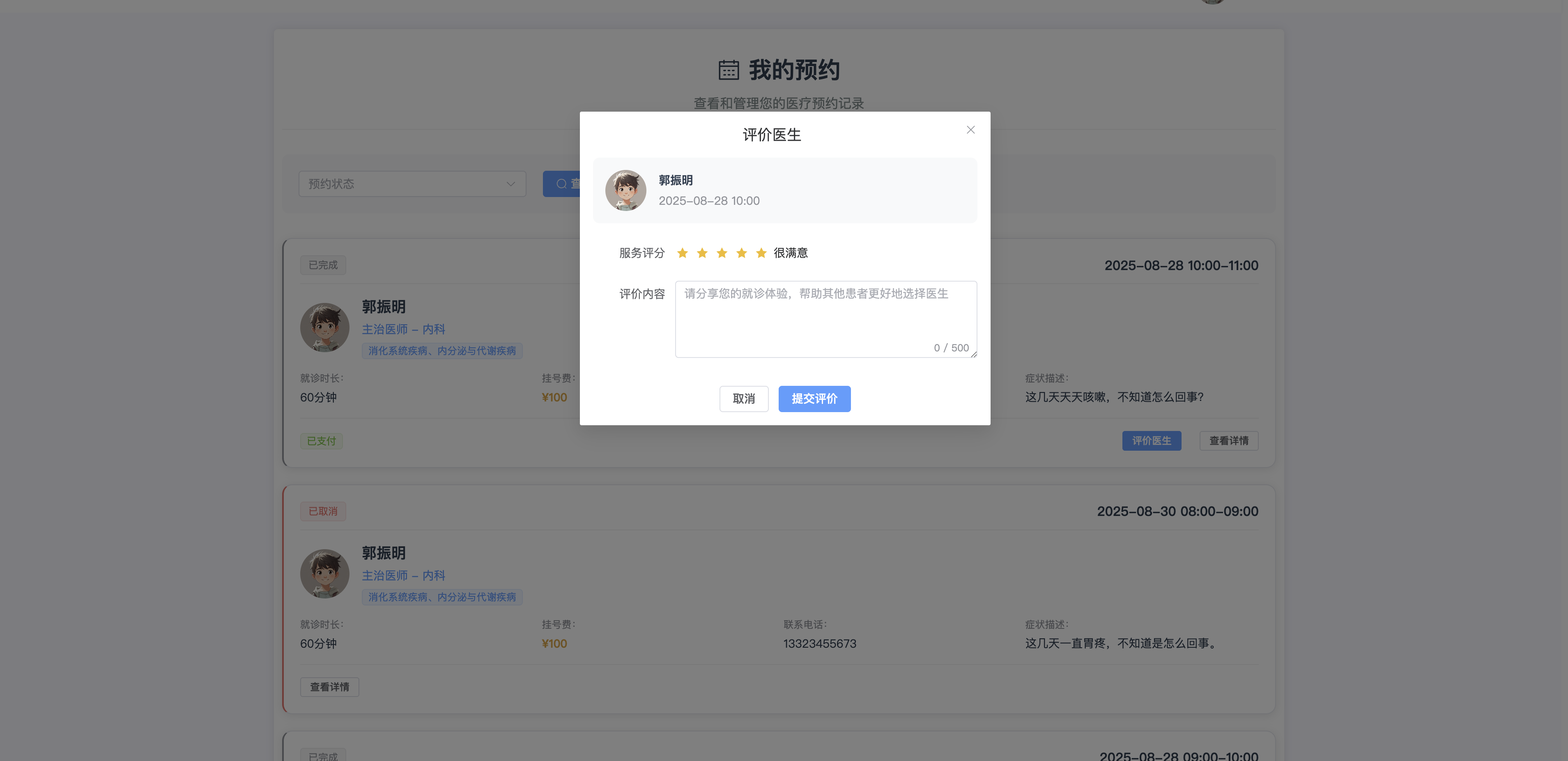 本系统分为患者、医生、管理员三种角色,功能划分清晰,业务逻辑完整: