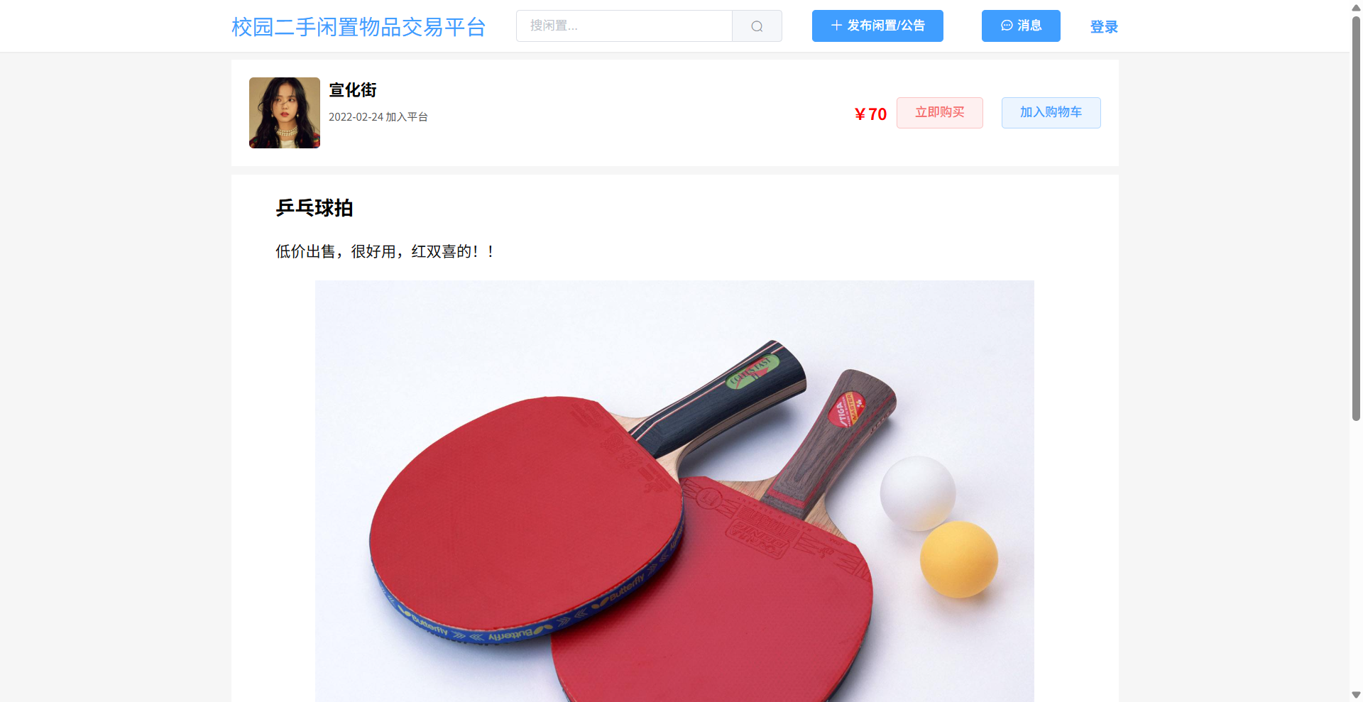 - 闲置物品详情:查看物品详细信息,包括图片展示、价格、描述、发布者信息等;支持立即购买和加入购物车功能;提供留言互动功能,可与卖家和其他用户交流。