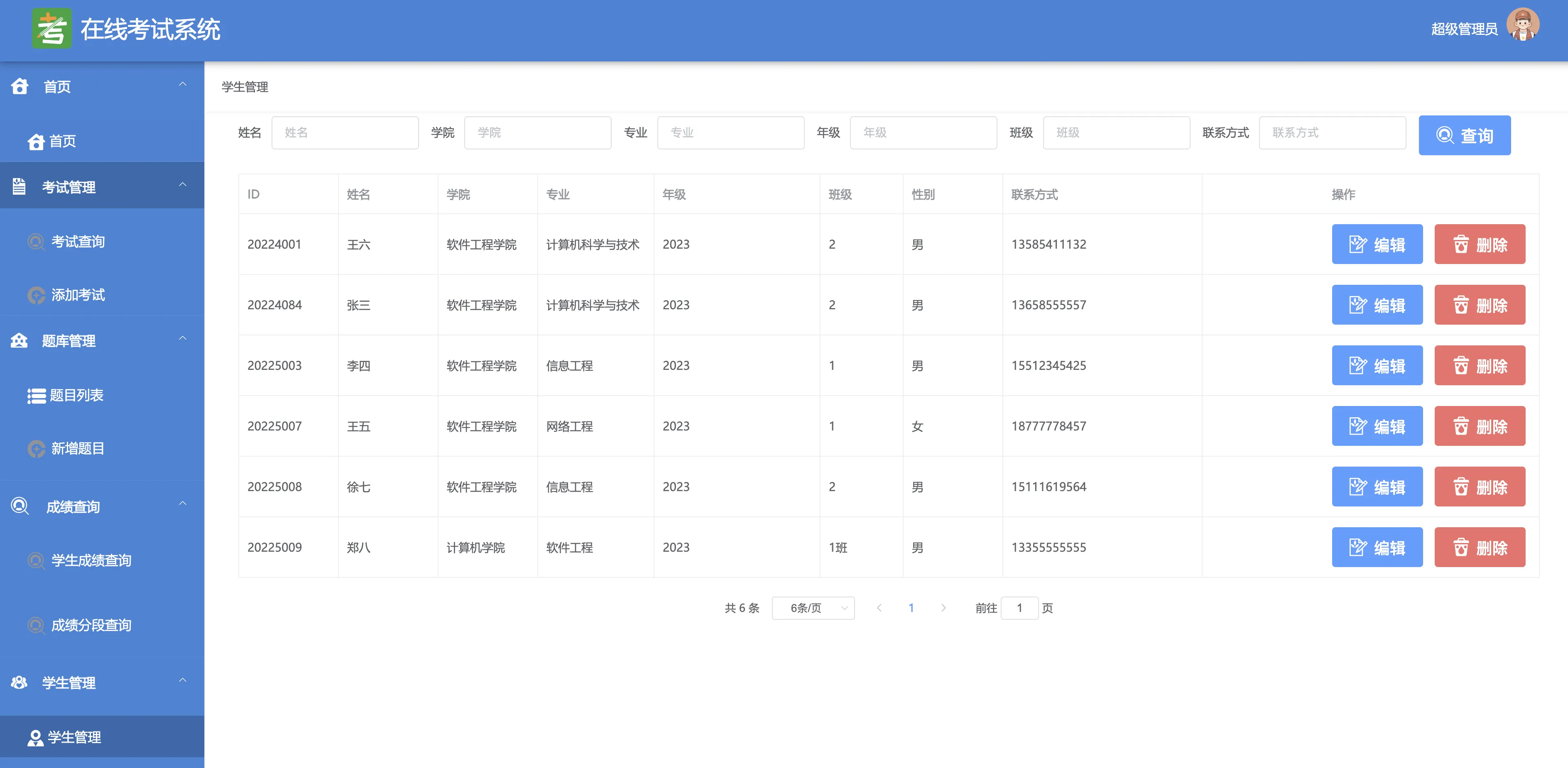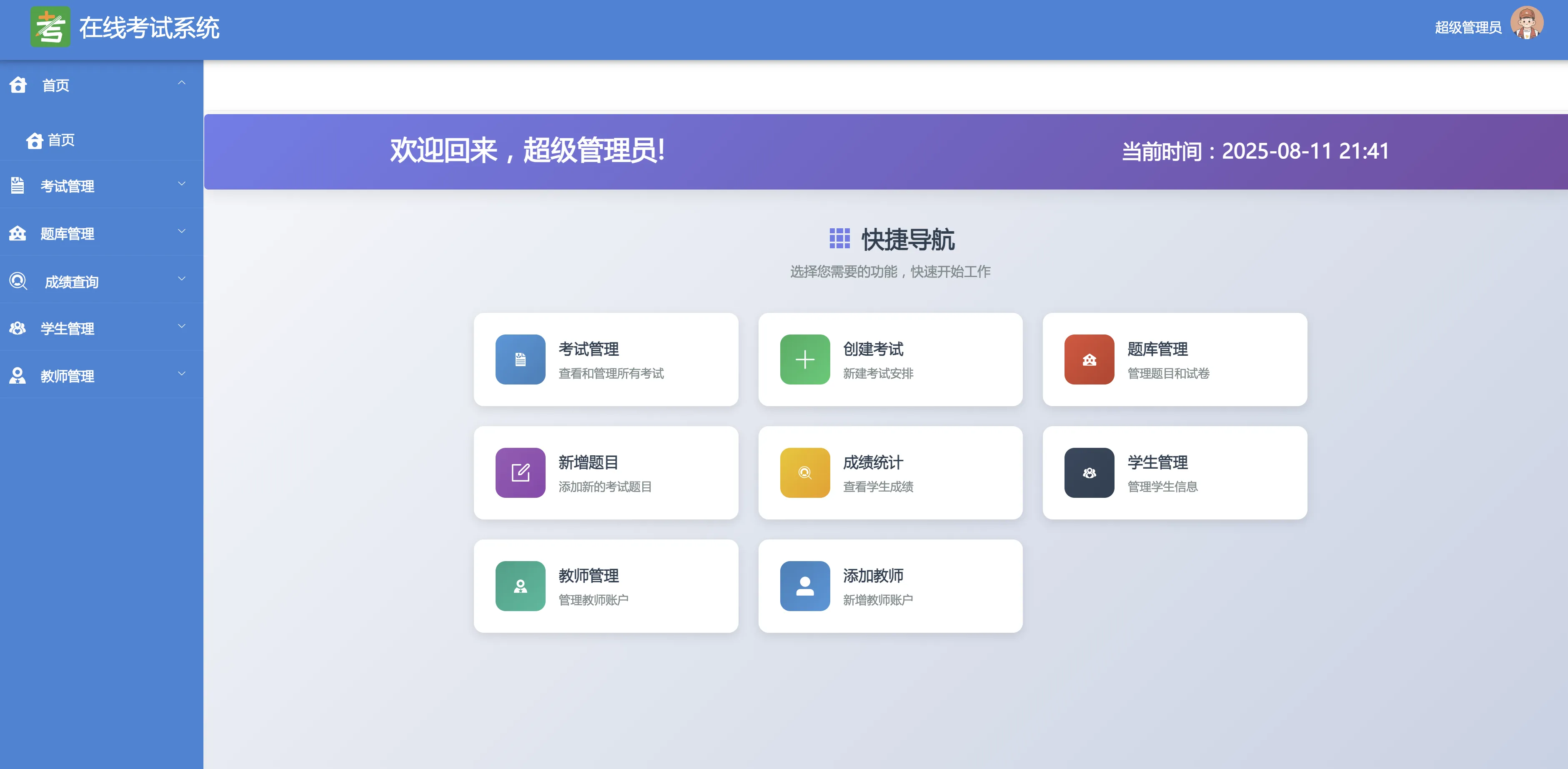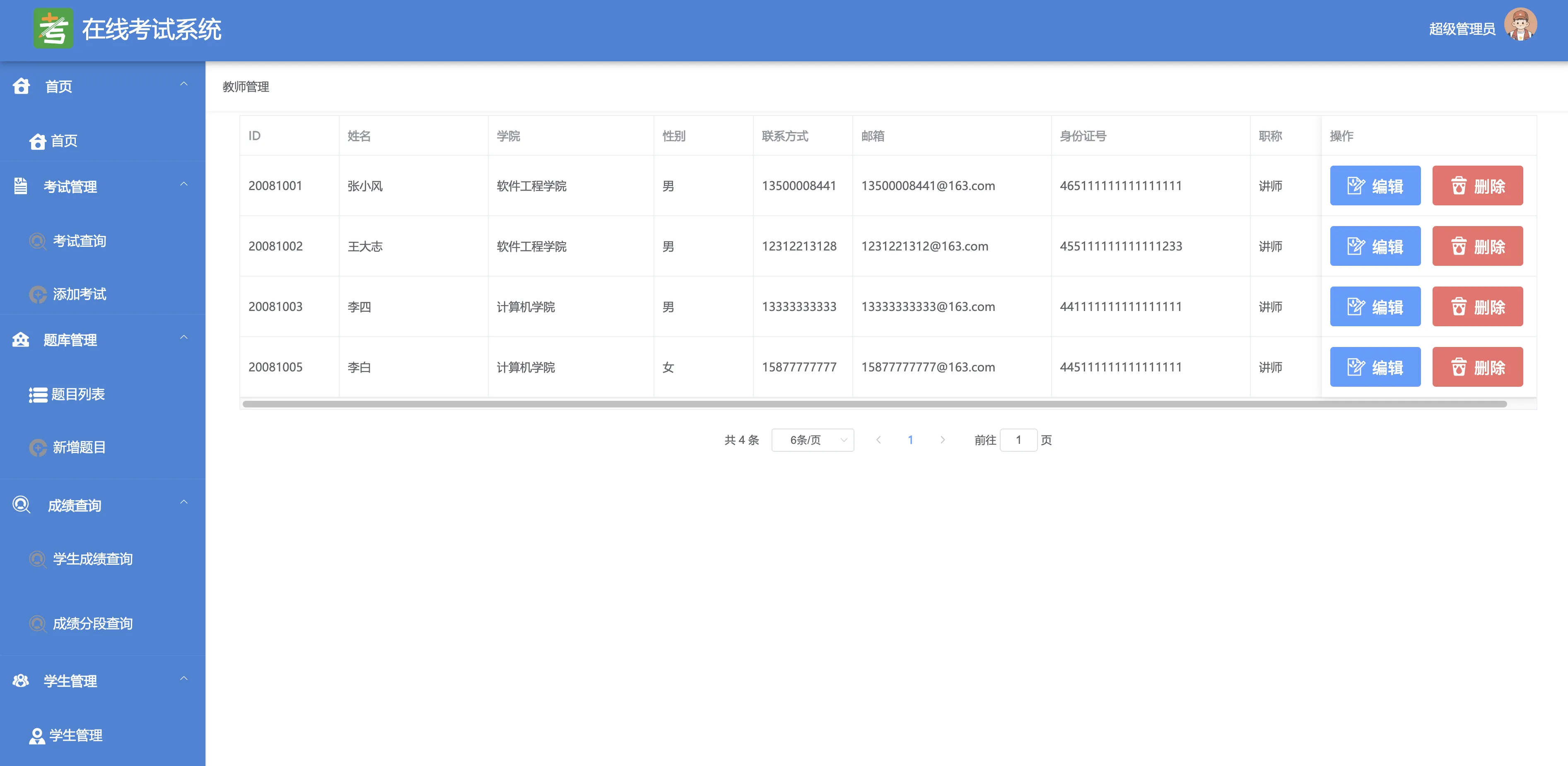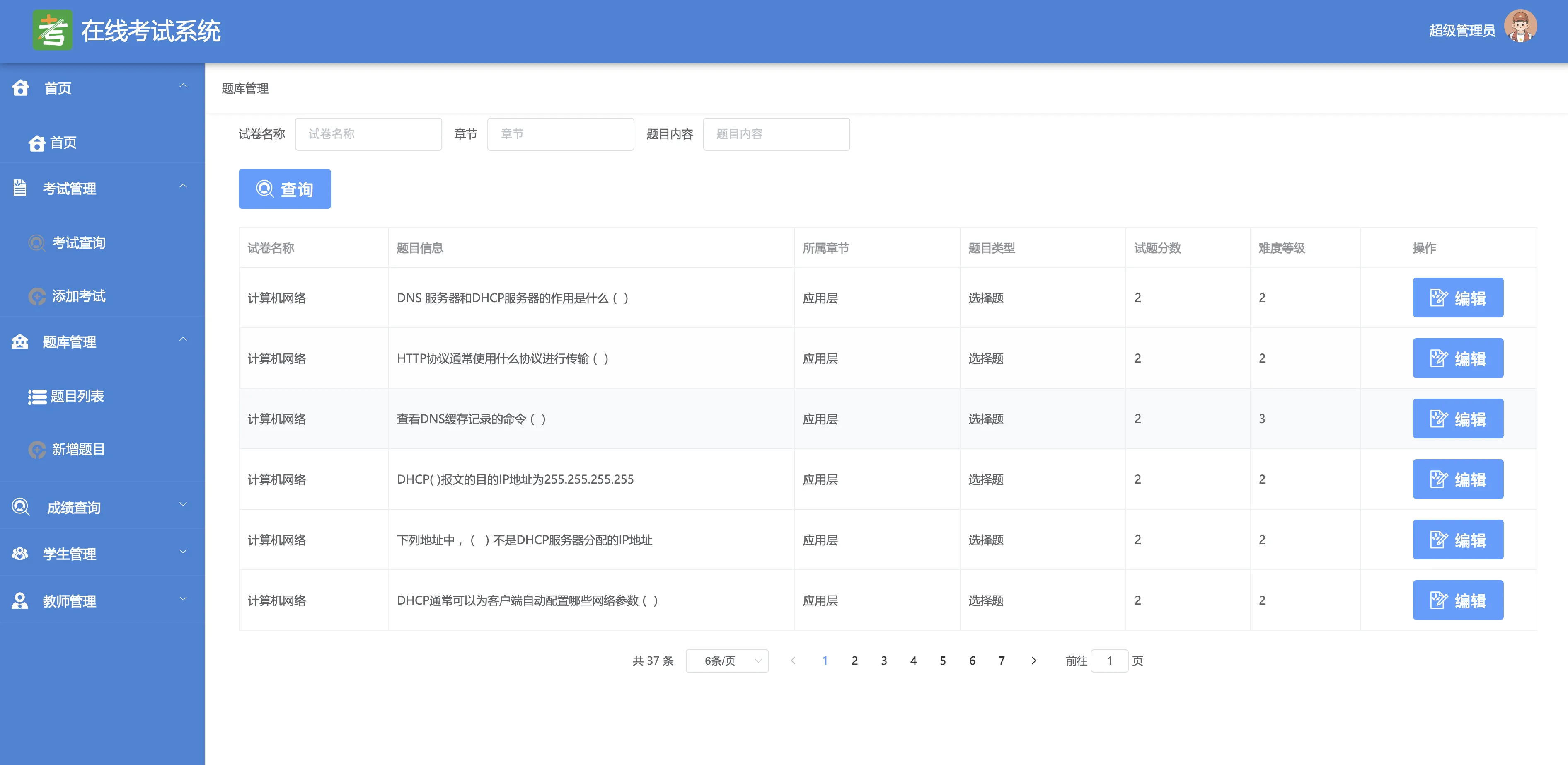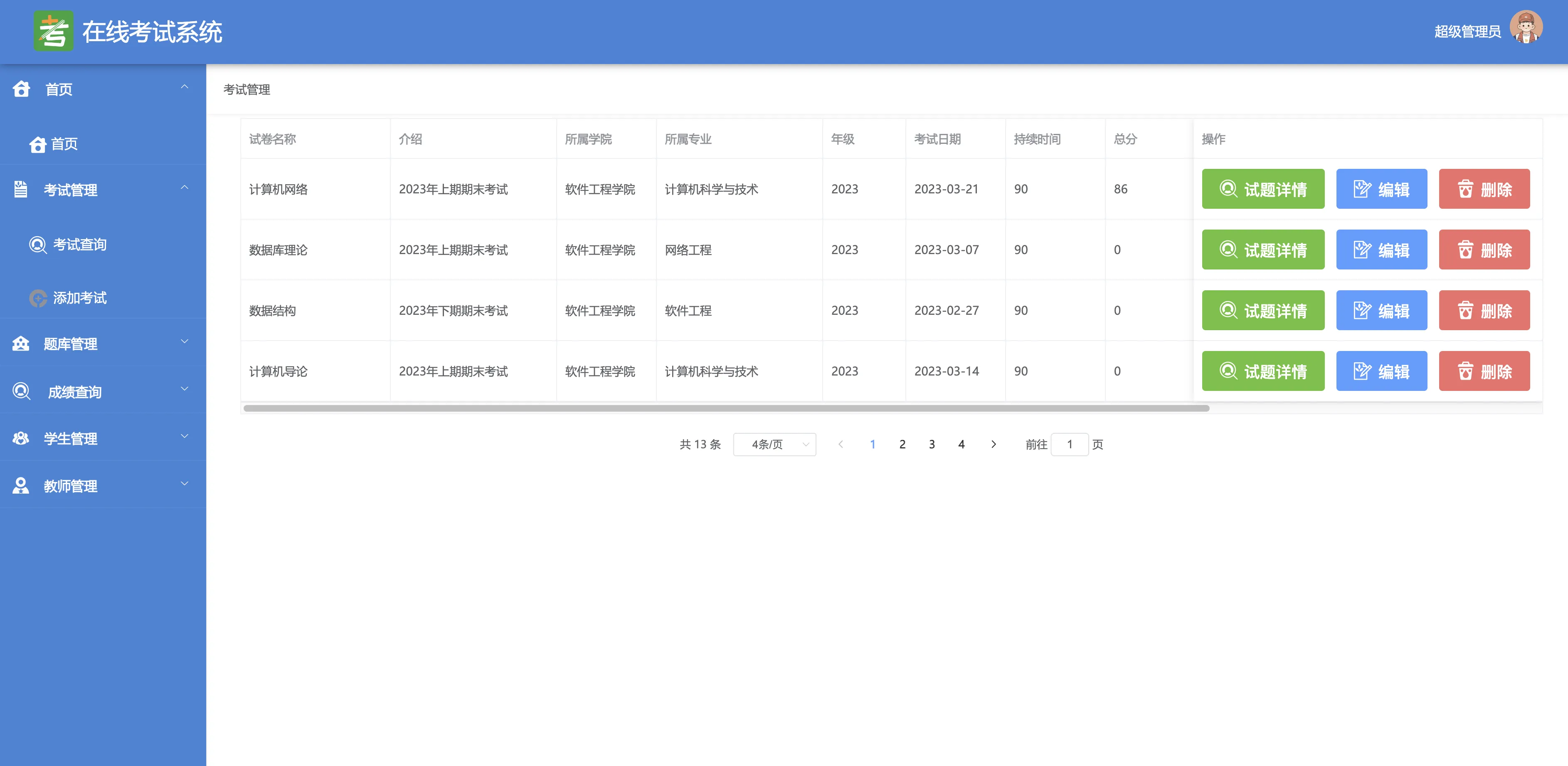 - 考试查询: 查看所有已创建的考试,支持试题详情查看、考试信息编辑、考试删除等操作。