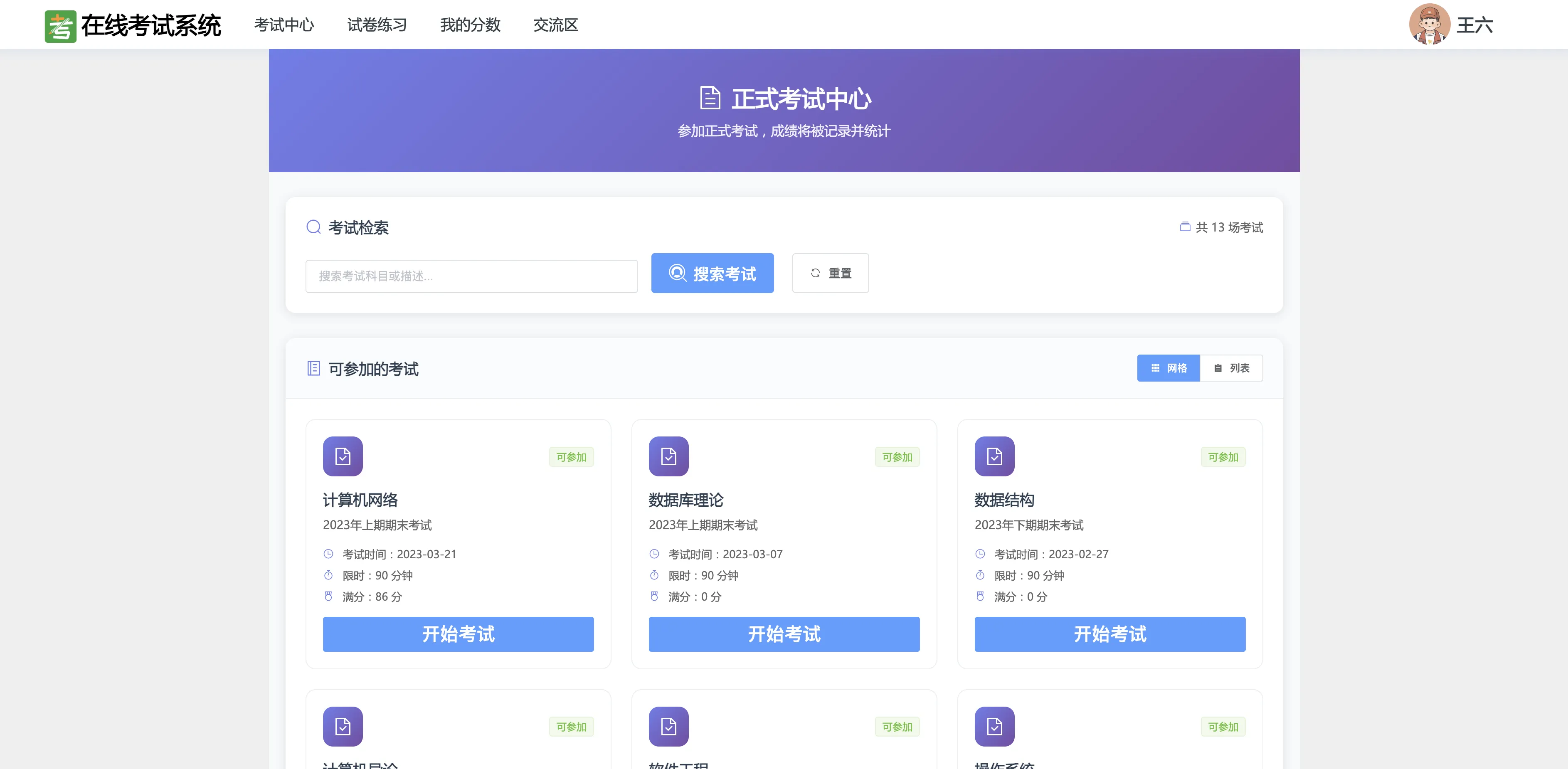 - 考试中心: 查看可参加的正式考试列表,支持按考试科目搜索,显示考试详细信息(考试时间、总分等),点击开始考试进入答题界面。