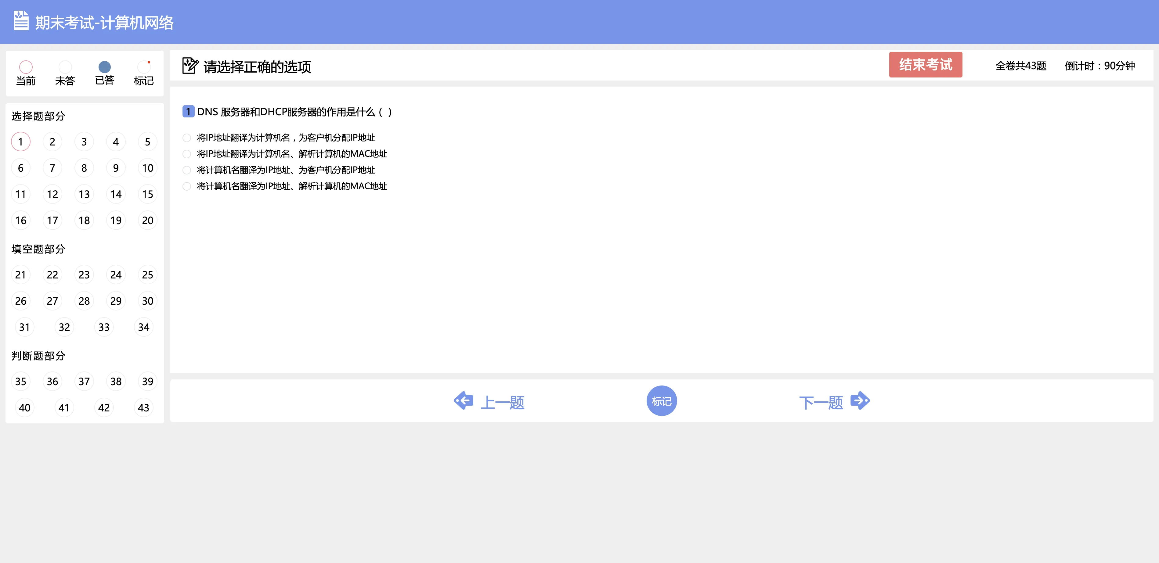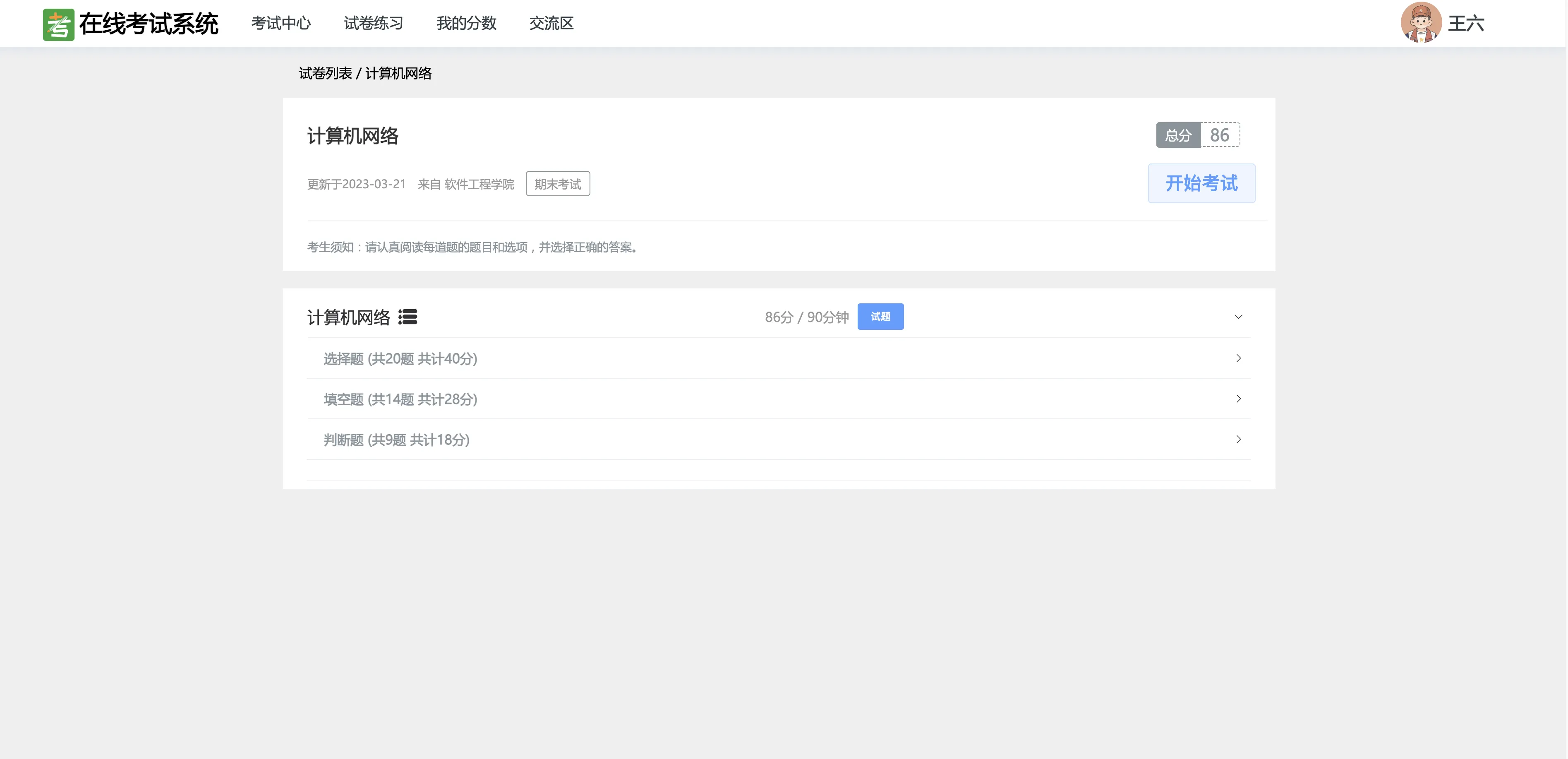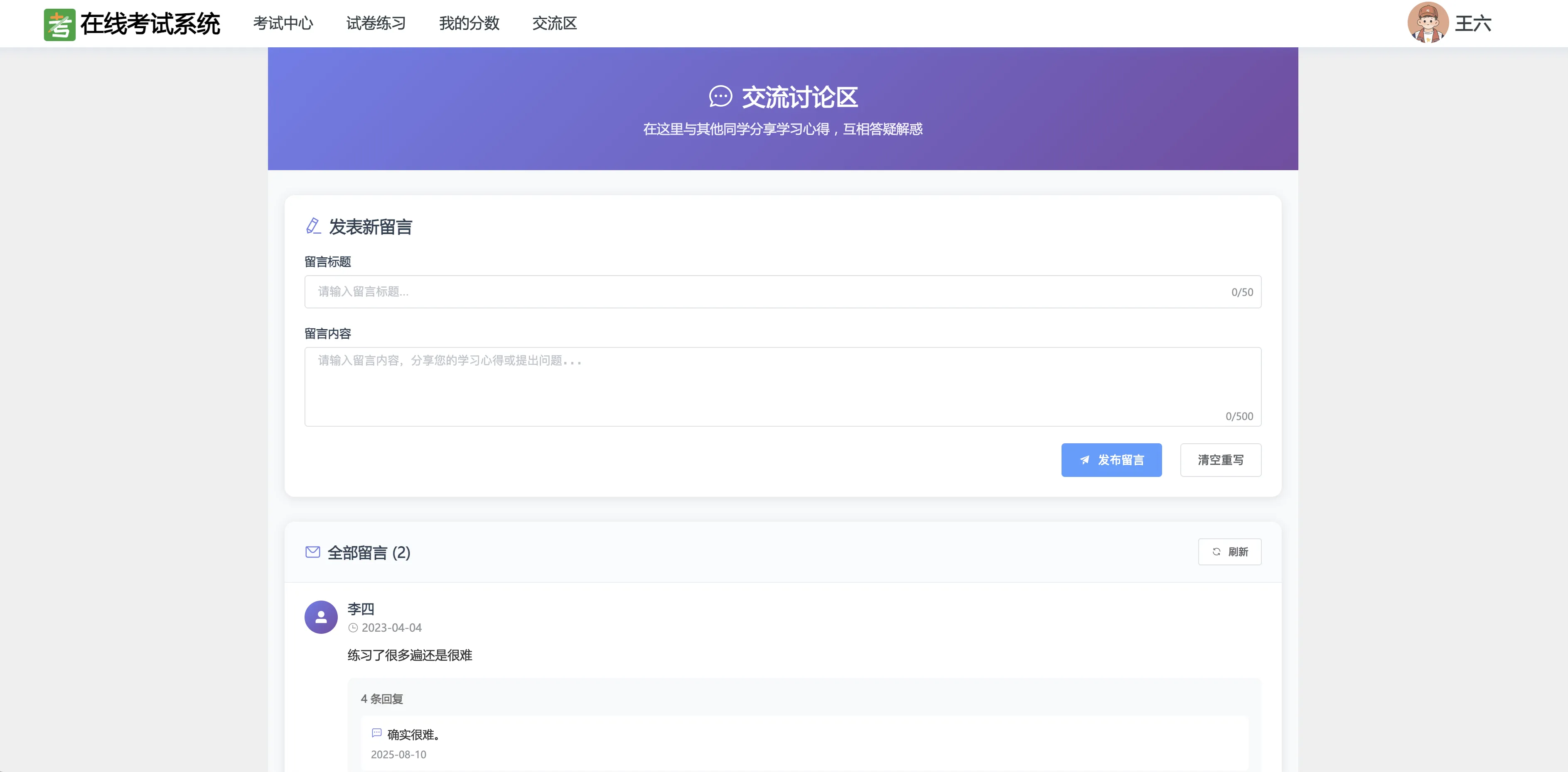 - 在线答题: 支持选择题、填空题、判断题三种题型的在线答题,实时计算得分。