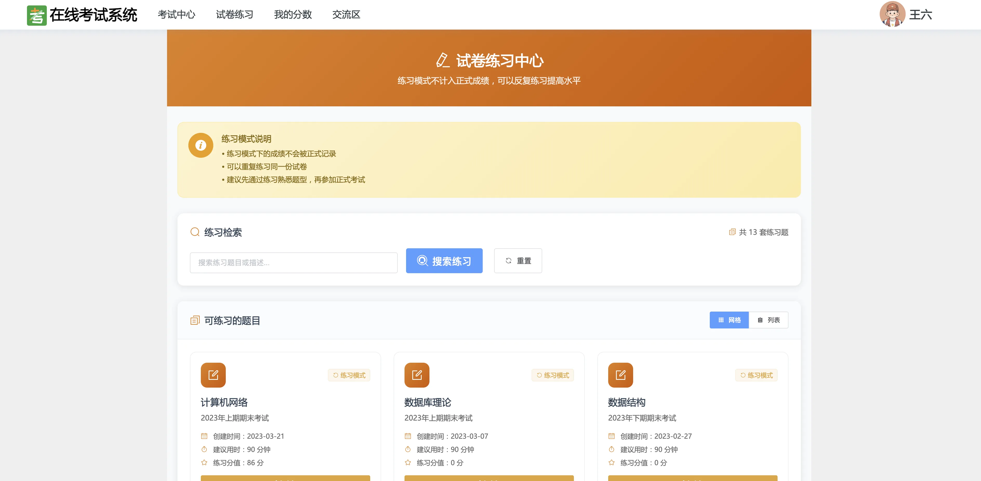 - 试卷练习: 练习模式下参加考试,成绩不会被记录,适合学生自我检测和复习巩固,支持重复练习。
