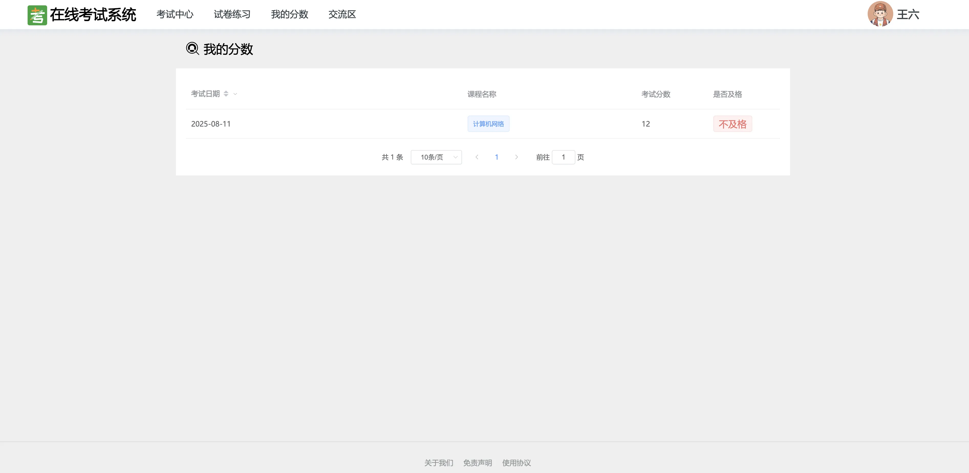 - 我的分数: 查看个人历史考试成绩,支持分页查询。