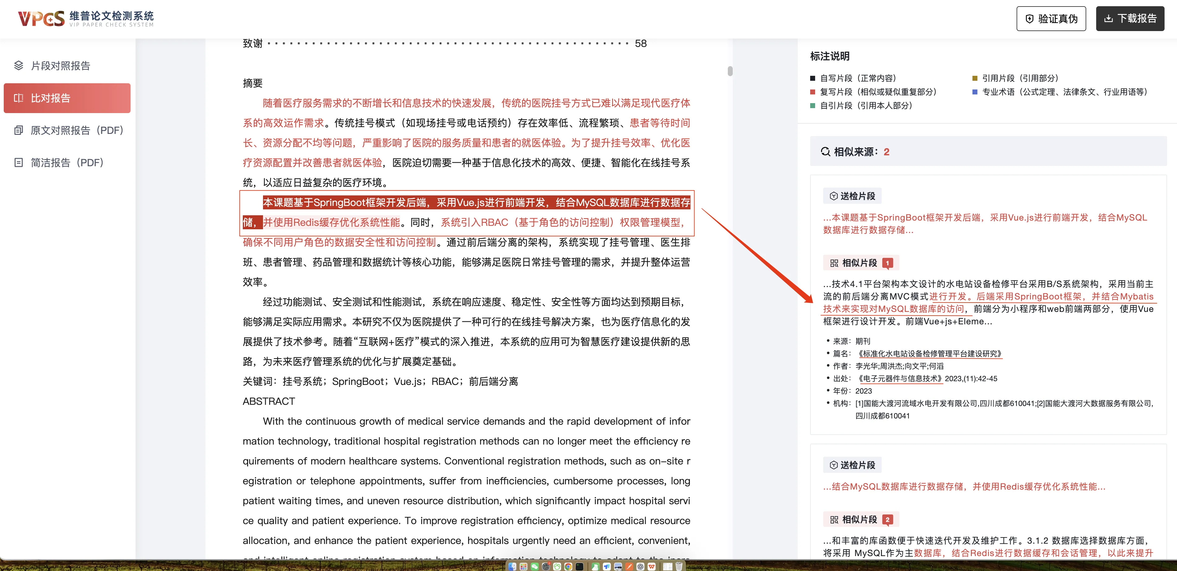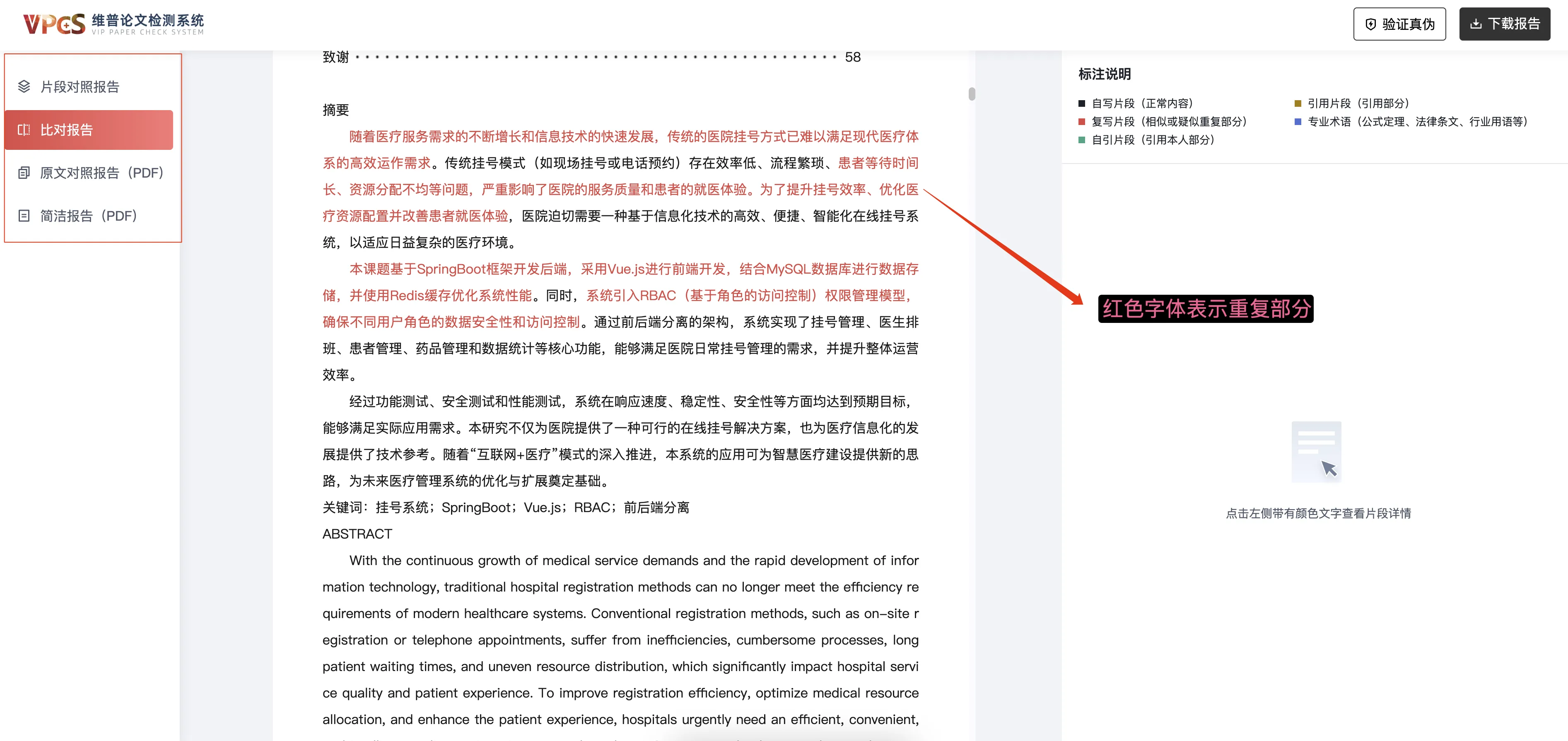 如果通过维普或知网进行查重后,它会给出一份详细的查重报告,报告中会包含一份原文对照报告,如下图中的红色字体就表示可能与其它论文有相似之处。