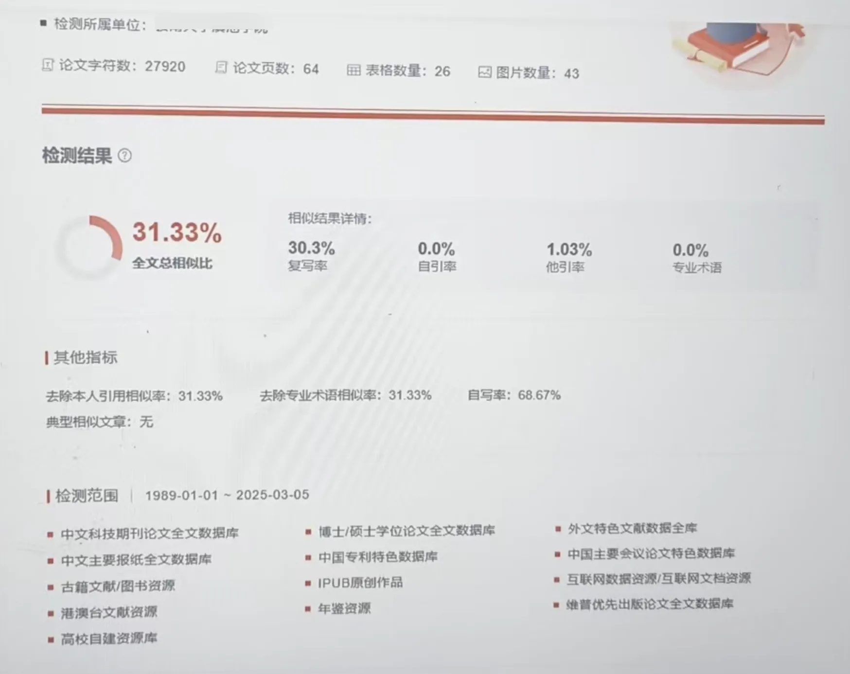 2025年3月7日上午,第一次论文查重率为 31.33%,没有过,因为他们学校要求 20% 以下。