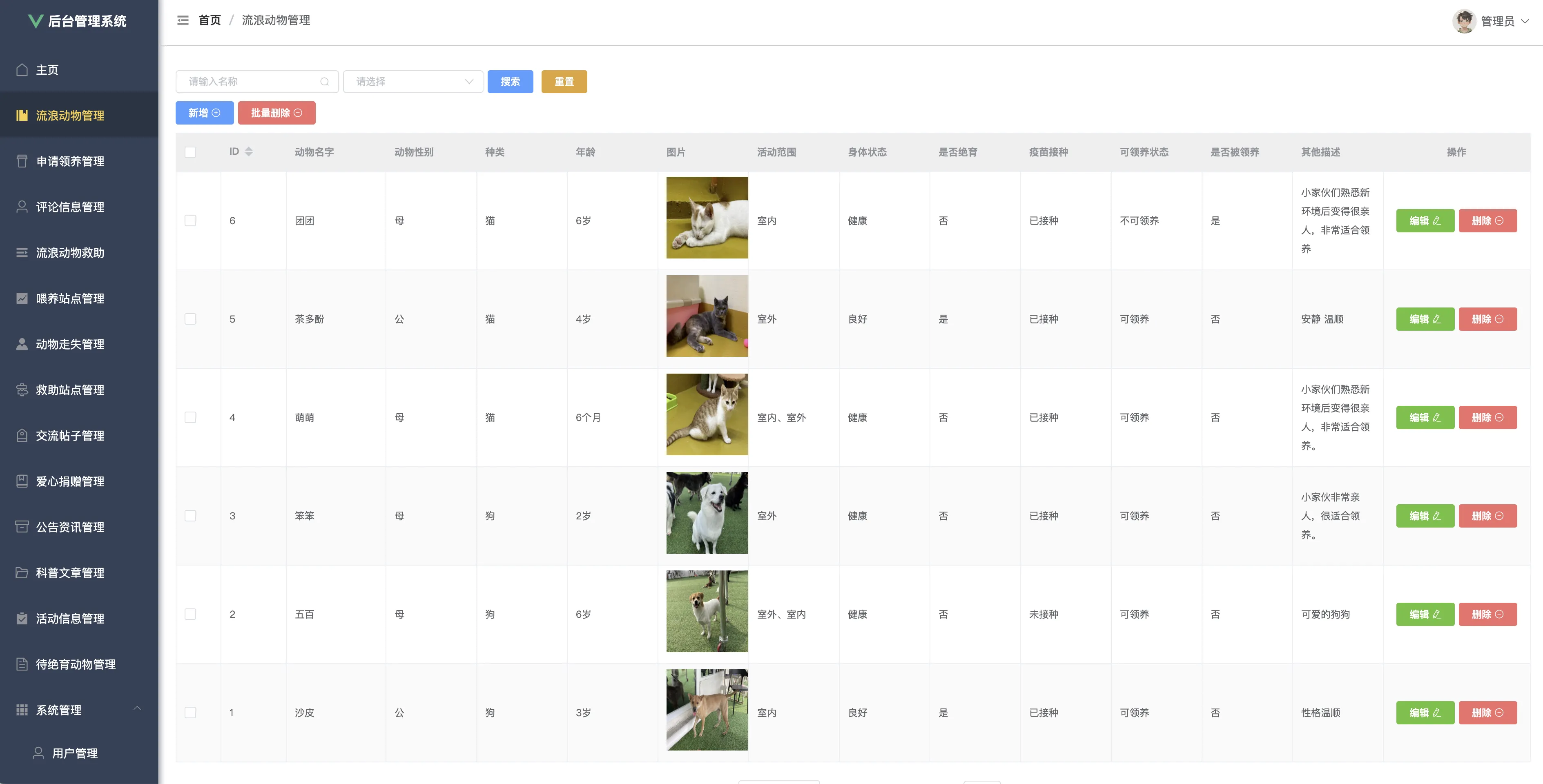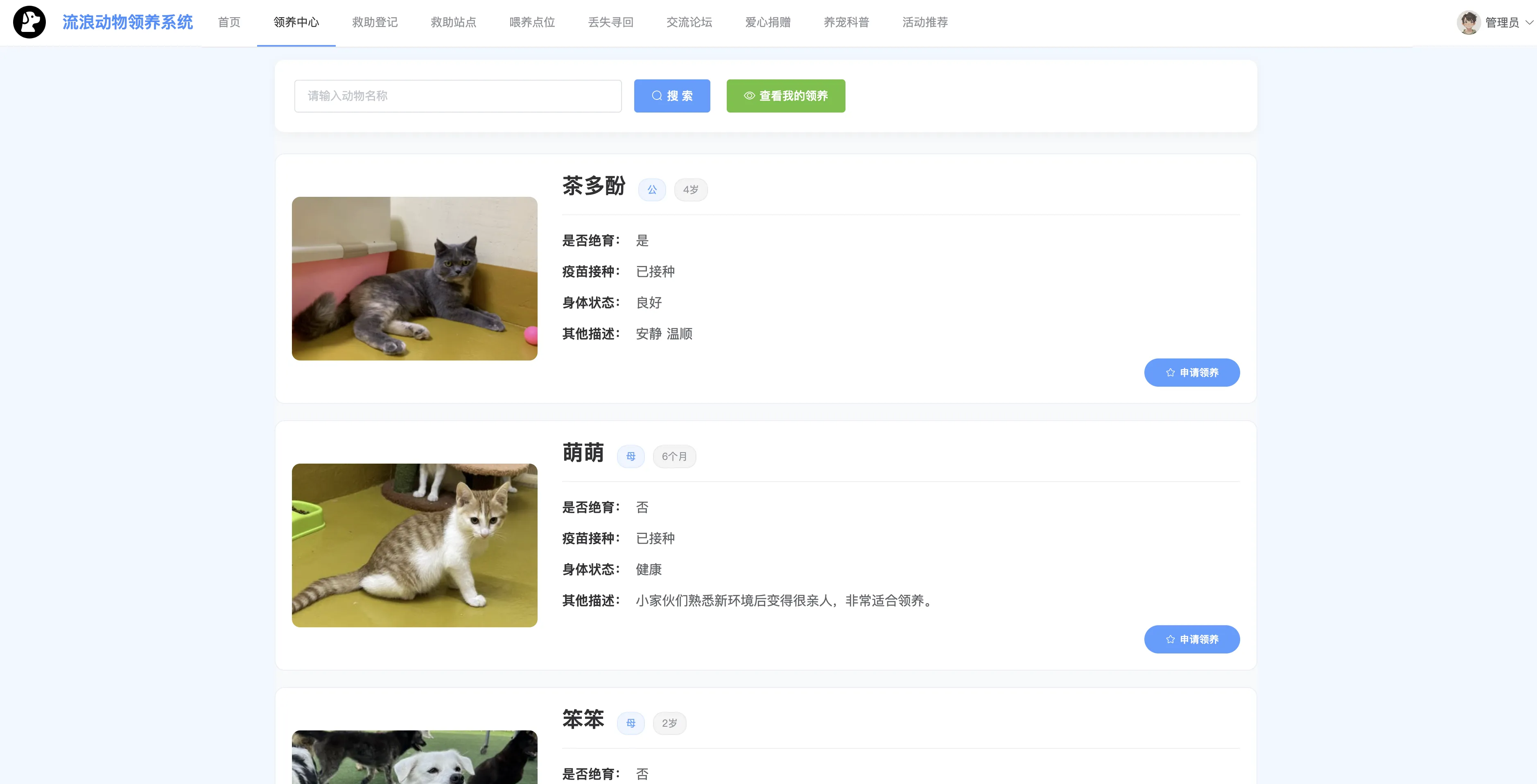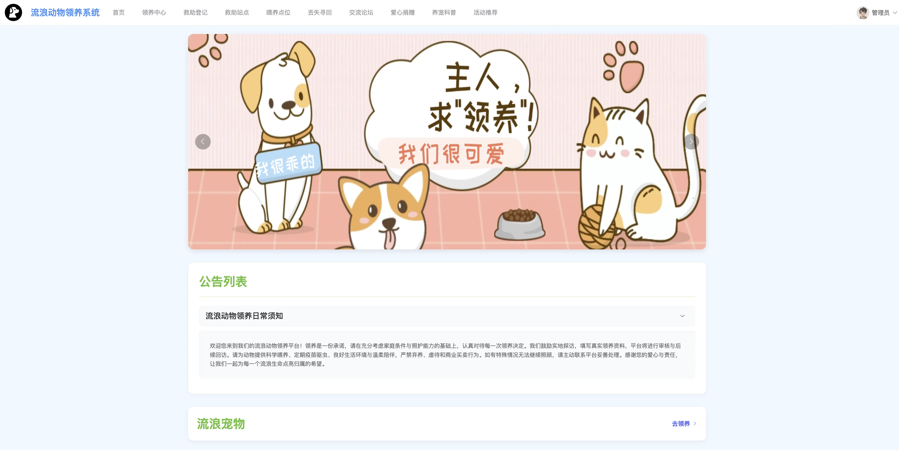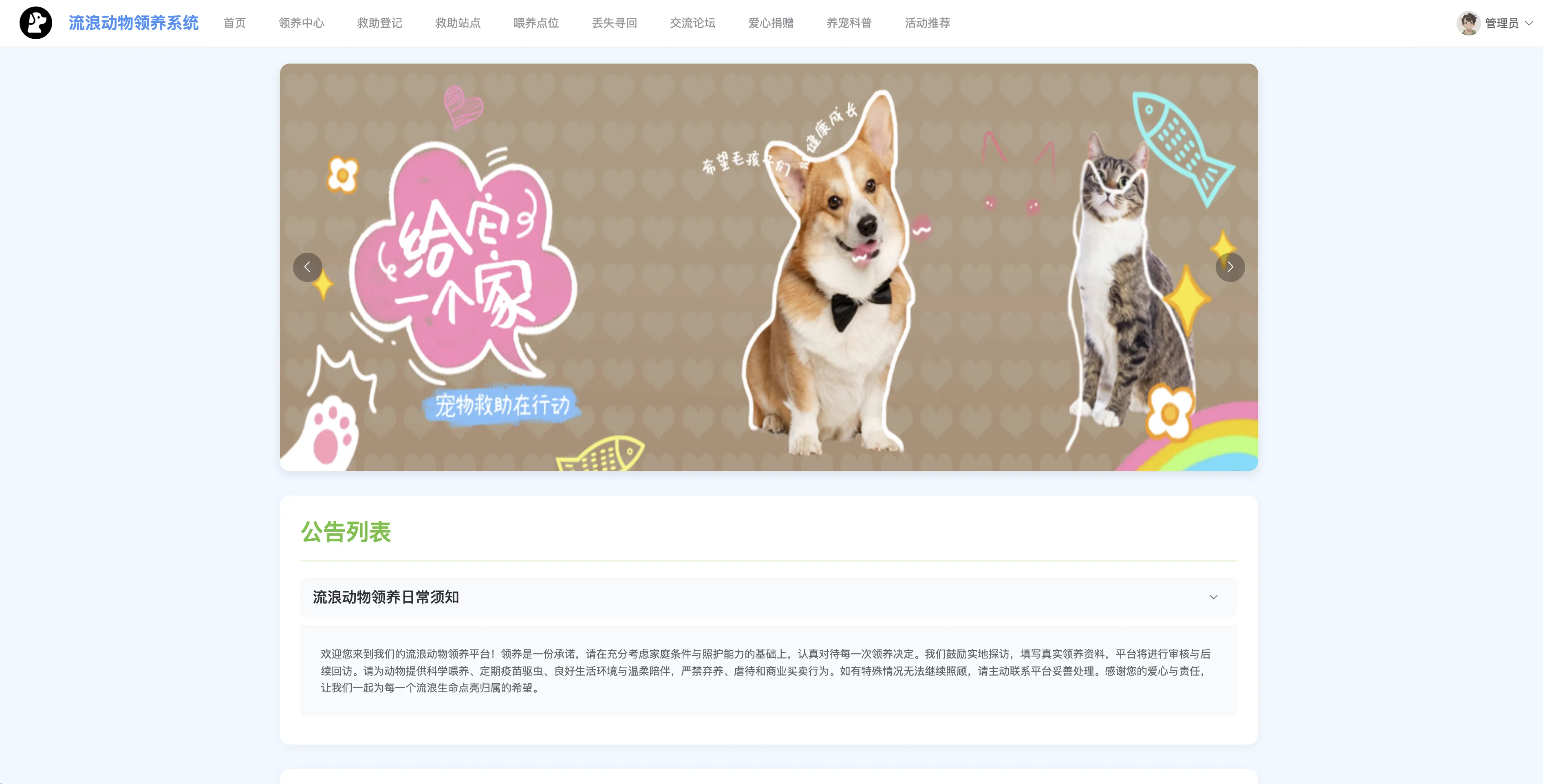 本系统功能全面、界面友好、数据结构清晰,适用于公益组织、宠物救助站点等机构的信息化建设需求,也非常适合作为高校软件工程、计算机应用等专业的毕业设计或综合课程设计选题。