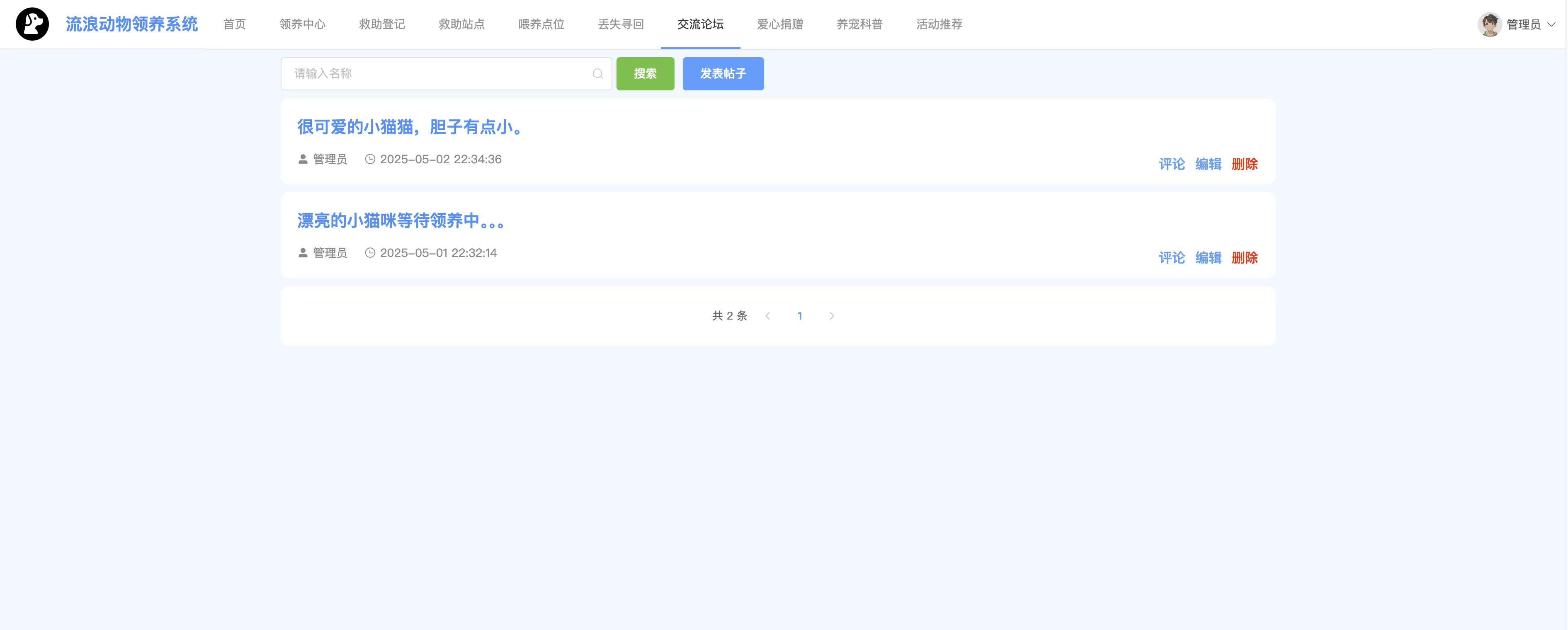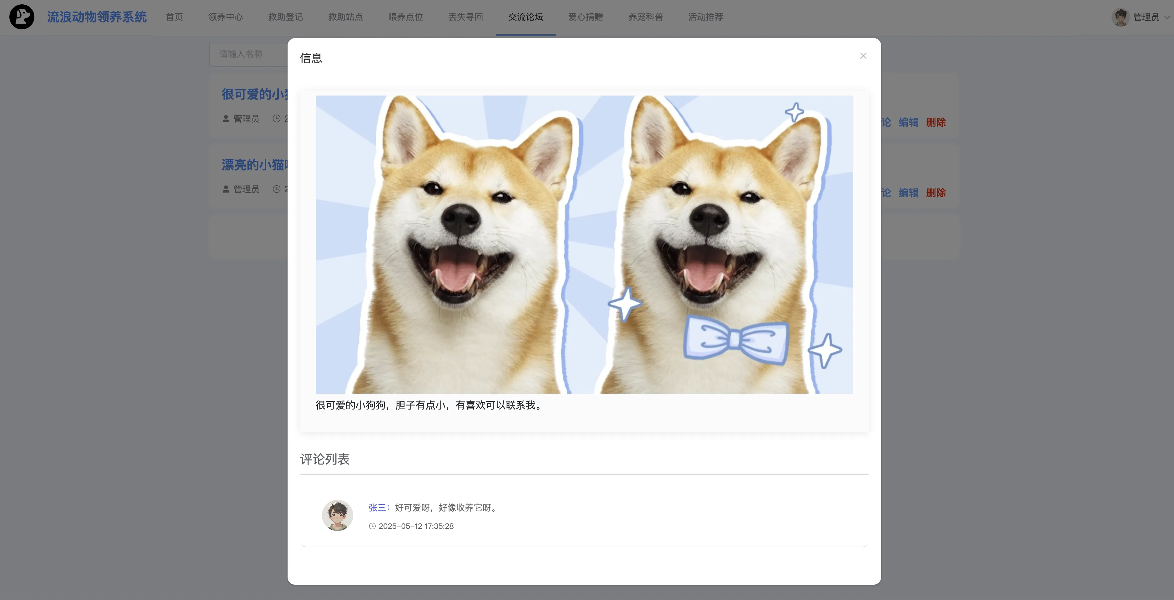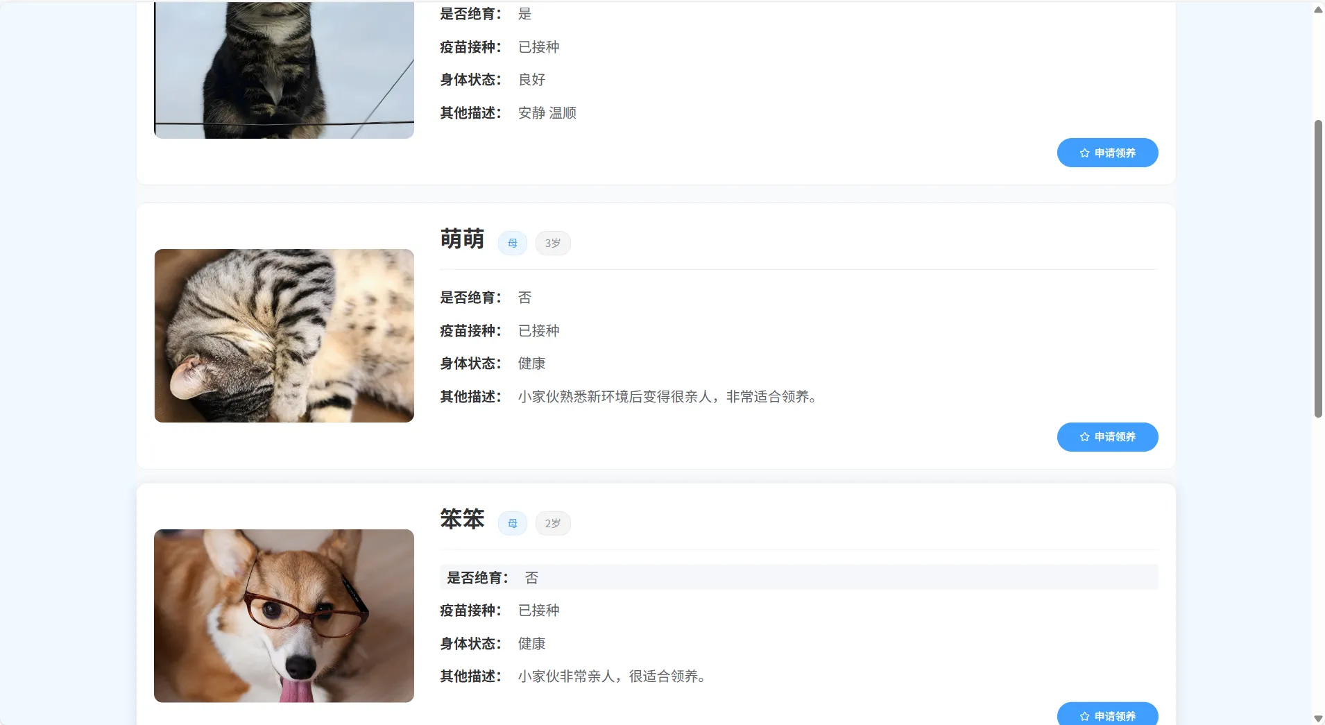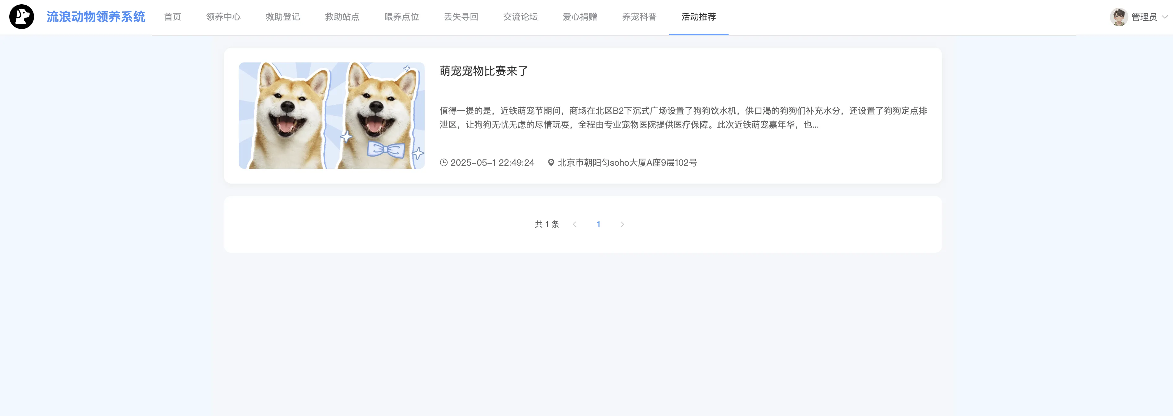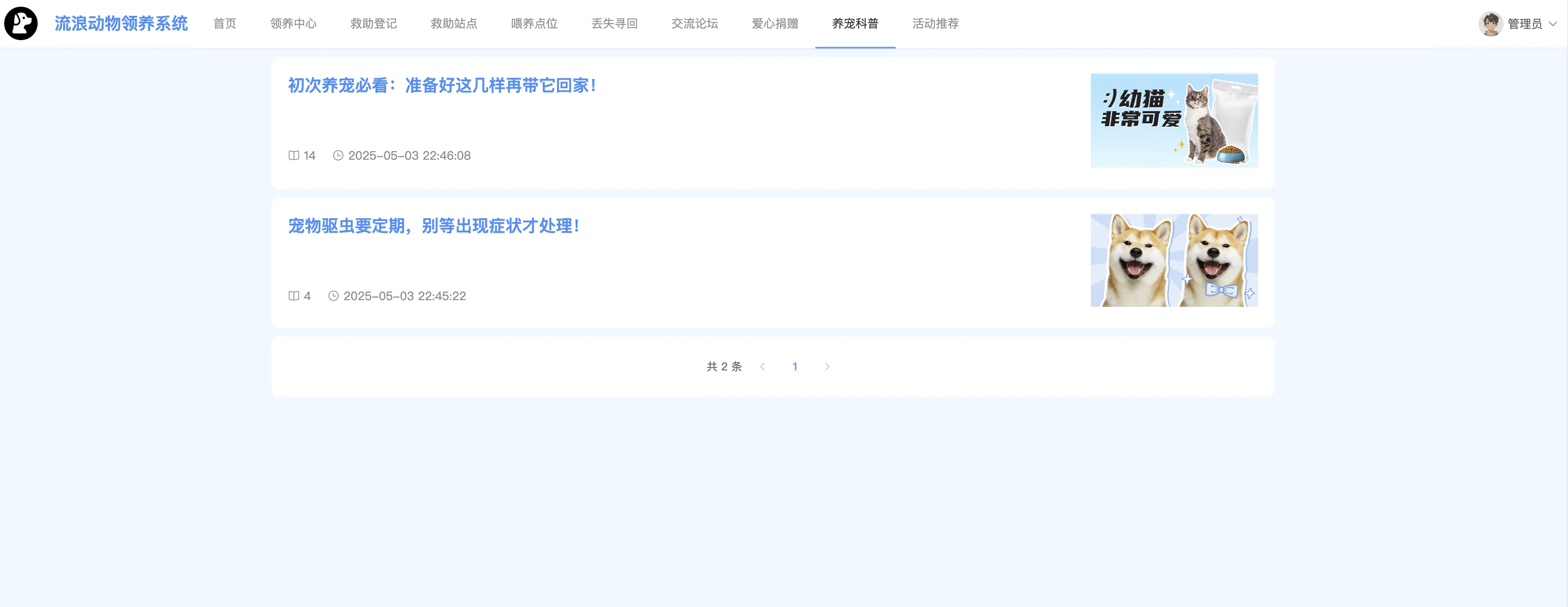 本系统功能全面、界面友好、数据结构清晰,适用于公益组织、宠物救助站点等机构的信息化建设需求,也非常适合作为高校软件工程、计算机应用等专业的毕业设计或综合课程设计选题。