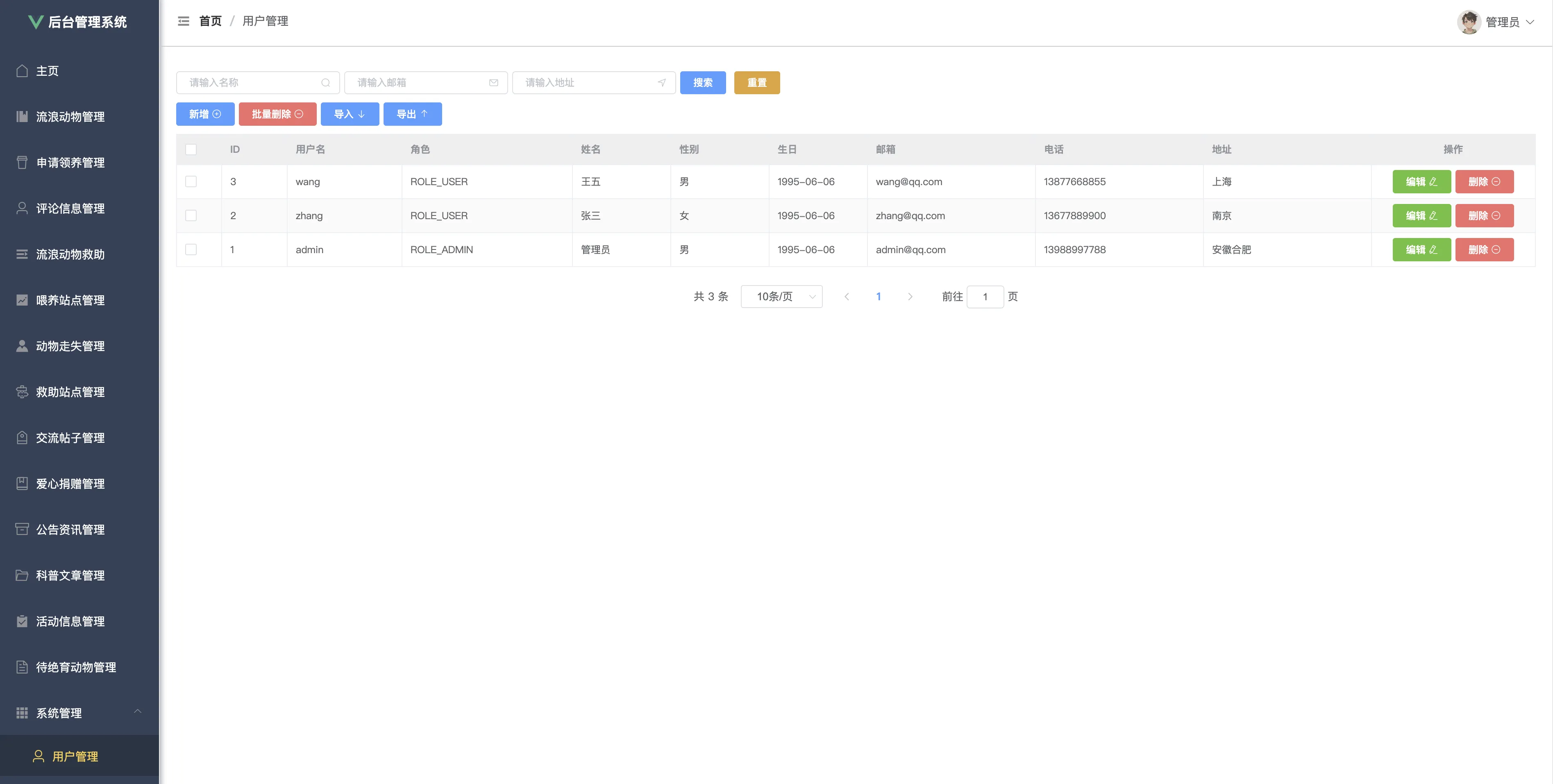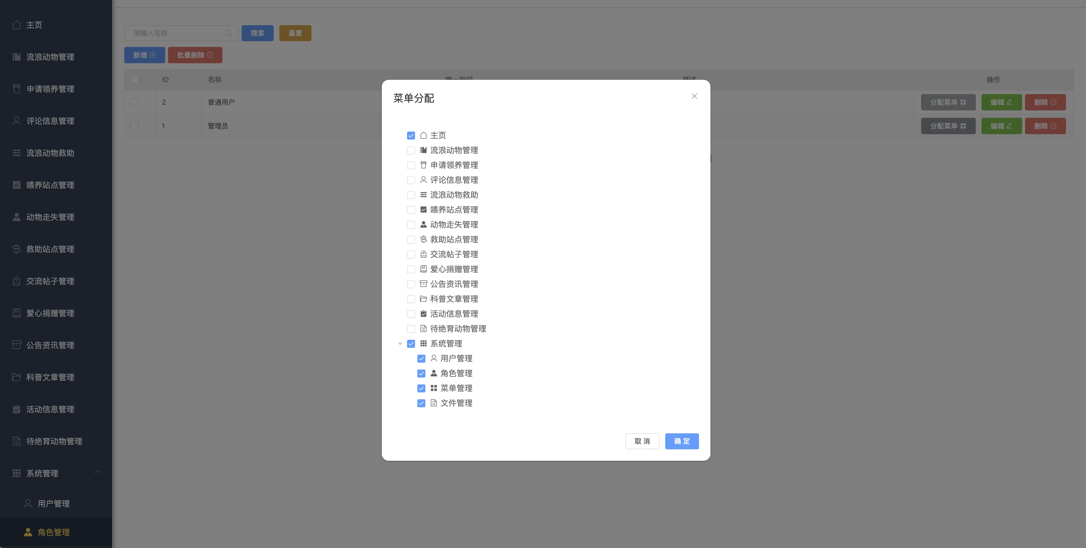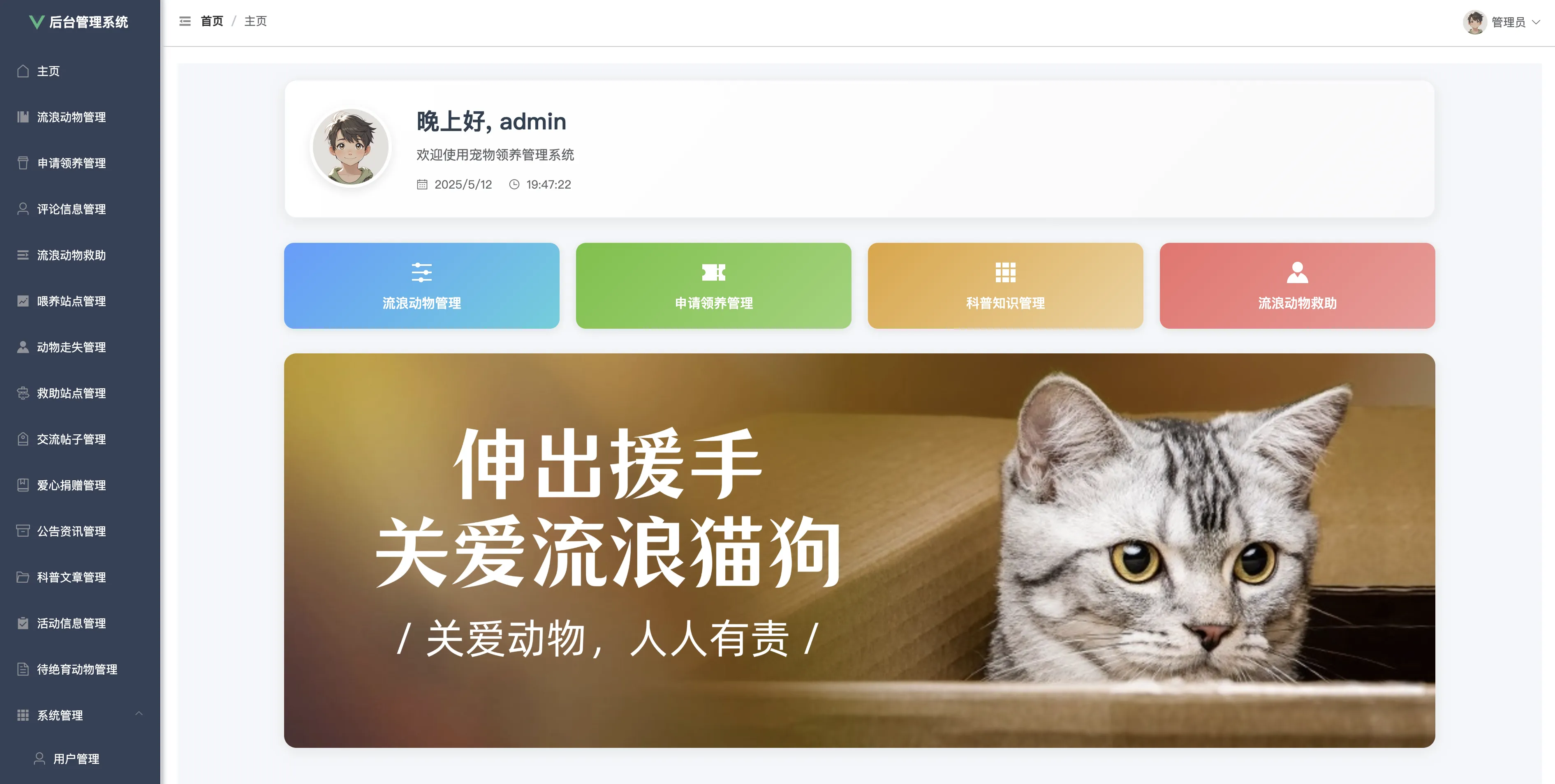 本系统设有两类用户角色:管理员与普通用户。其中用户可通过系统实现宠物领养申请、救助信息登记、喂养点位查看、动物走失上报、公益活动参与、宠物科普阅读、在线论坛交流、爱心捐赠等功能。而管理员则负责全平台的数据维护与信息审核,包括流浪动物管理、领养申请审批、救助站与喂养点管理、信息发布(公告、科普、活动)、用户管理、角色与权限配置等。