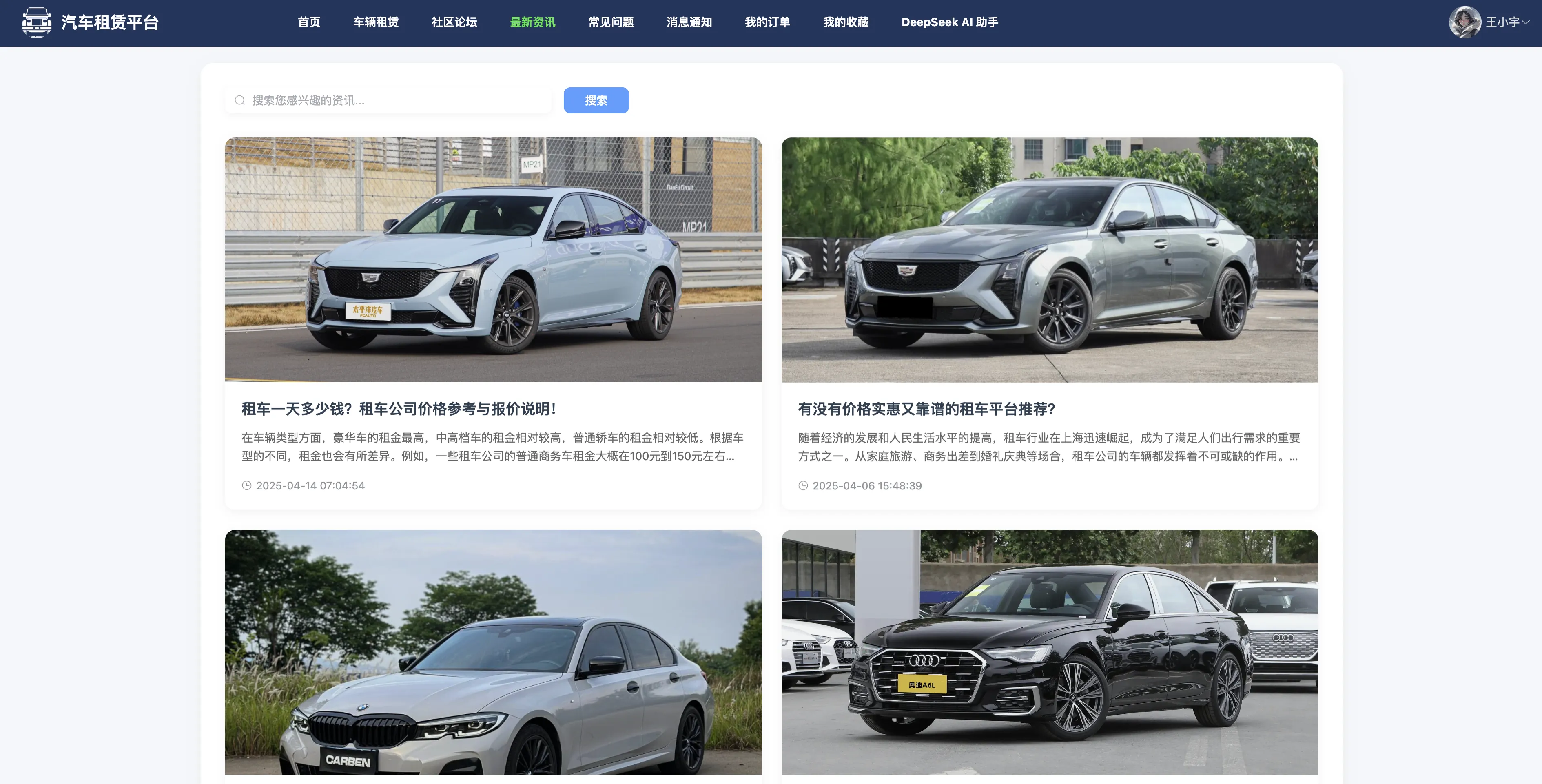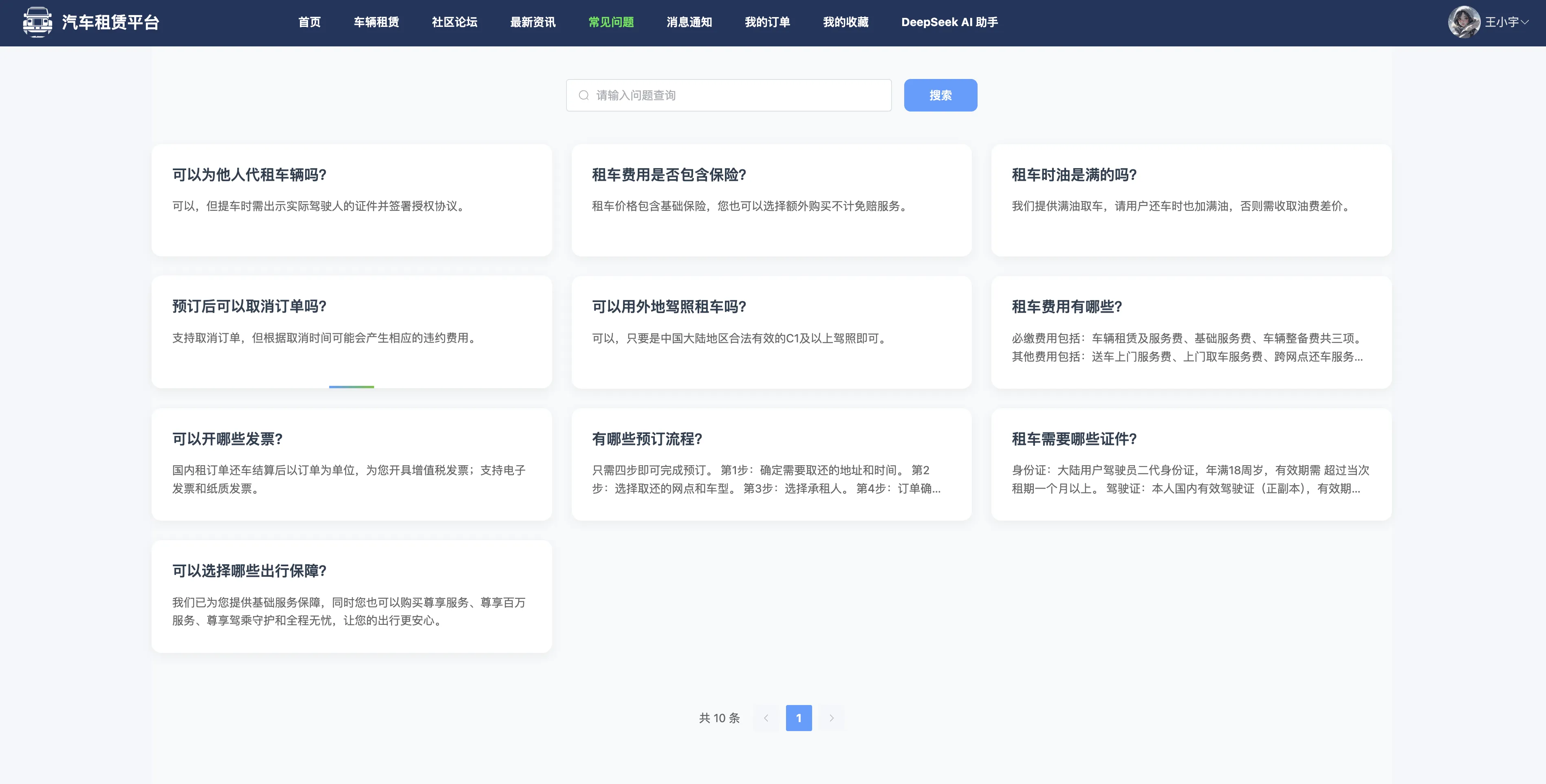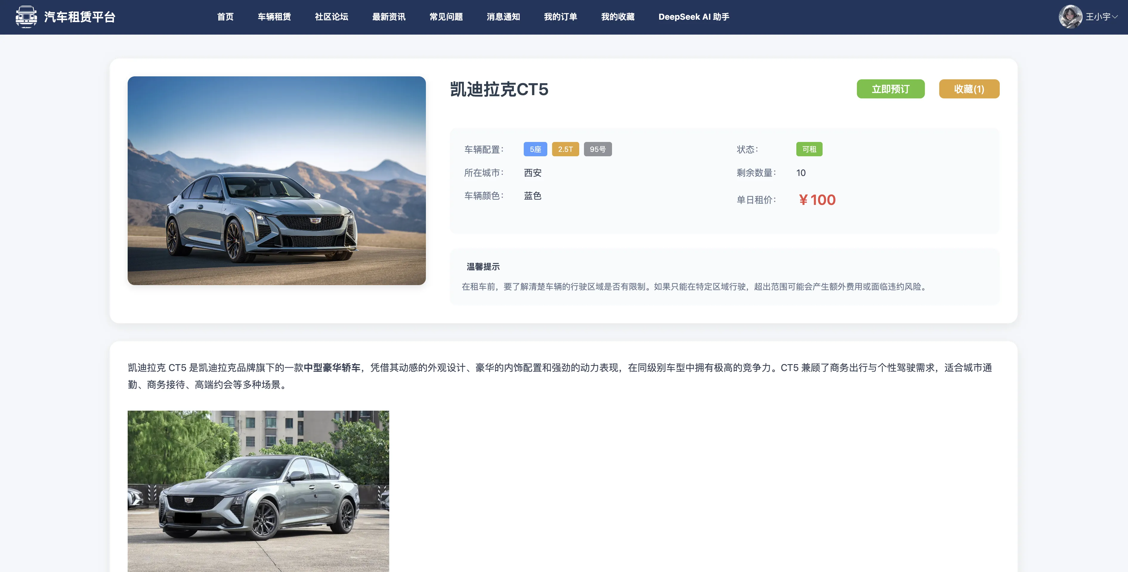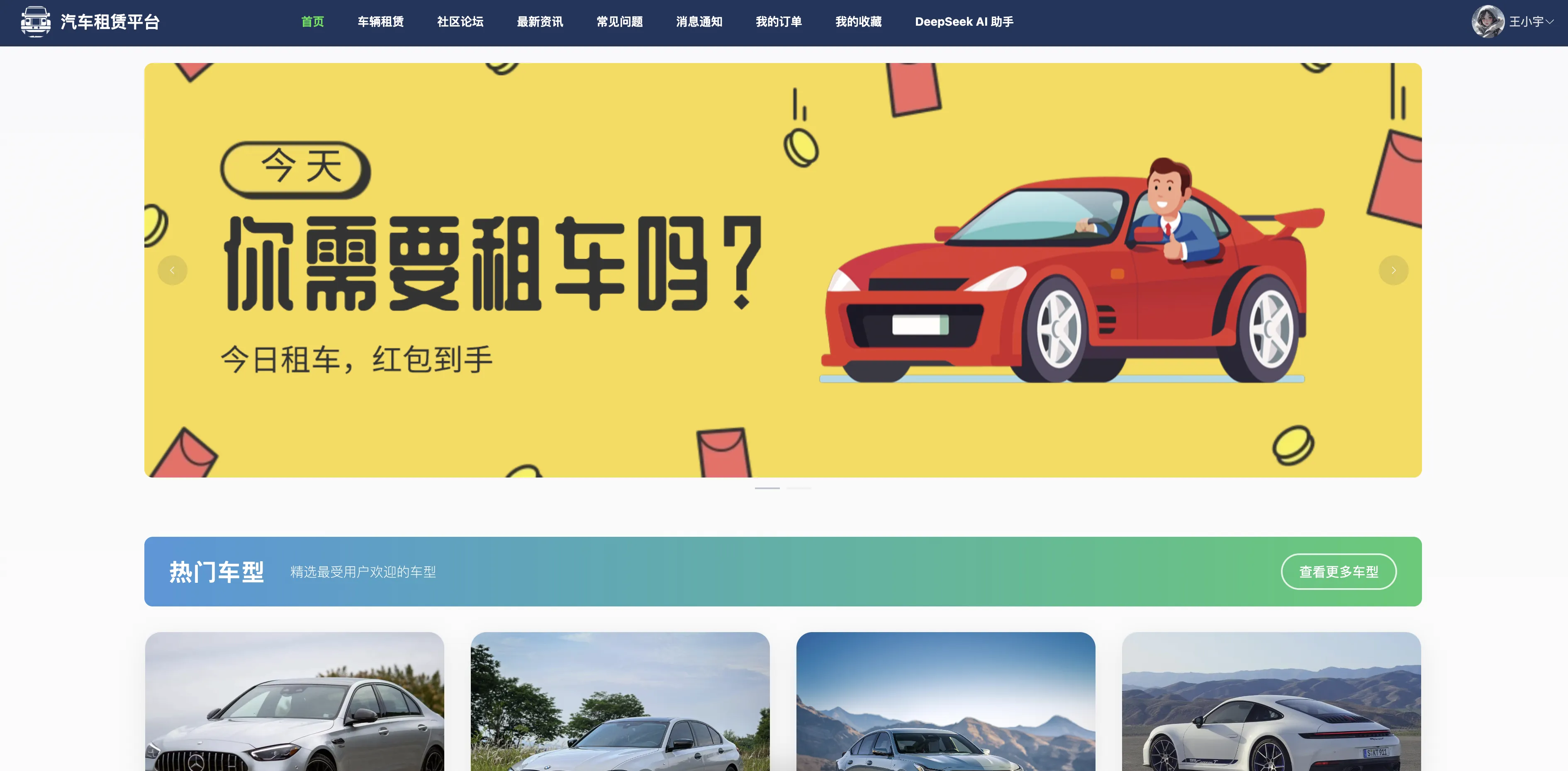 本系统还设计了通用评论体系,适配多模块统一评论交互;并接入 DeepSeek AI 智能助手,为用户提供智能问答支持与租车引导服务,全面提升系统的智能化水平与用户服务体验。整体系统功能丰富、结构清晰、安全稳定,具有良好的扩展性与应用推广前景,能够有效支撑中小型汽车租赁平台的运营需求。