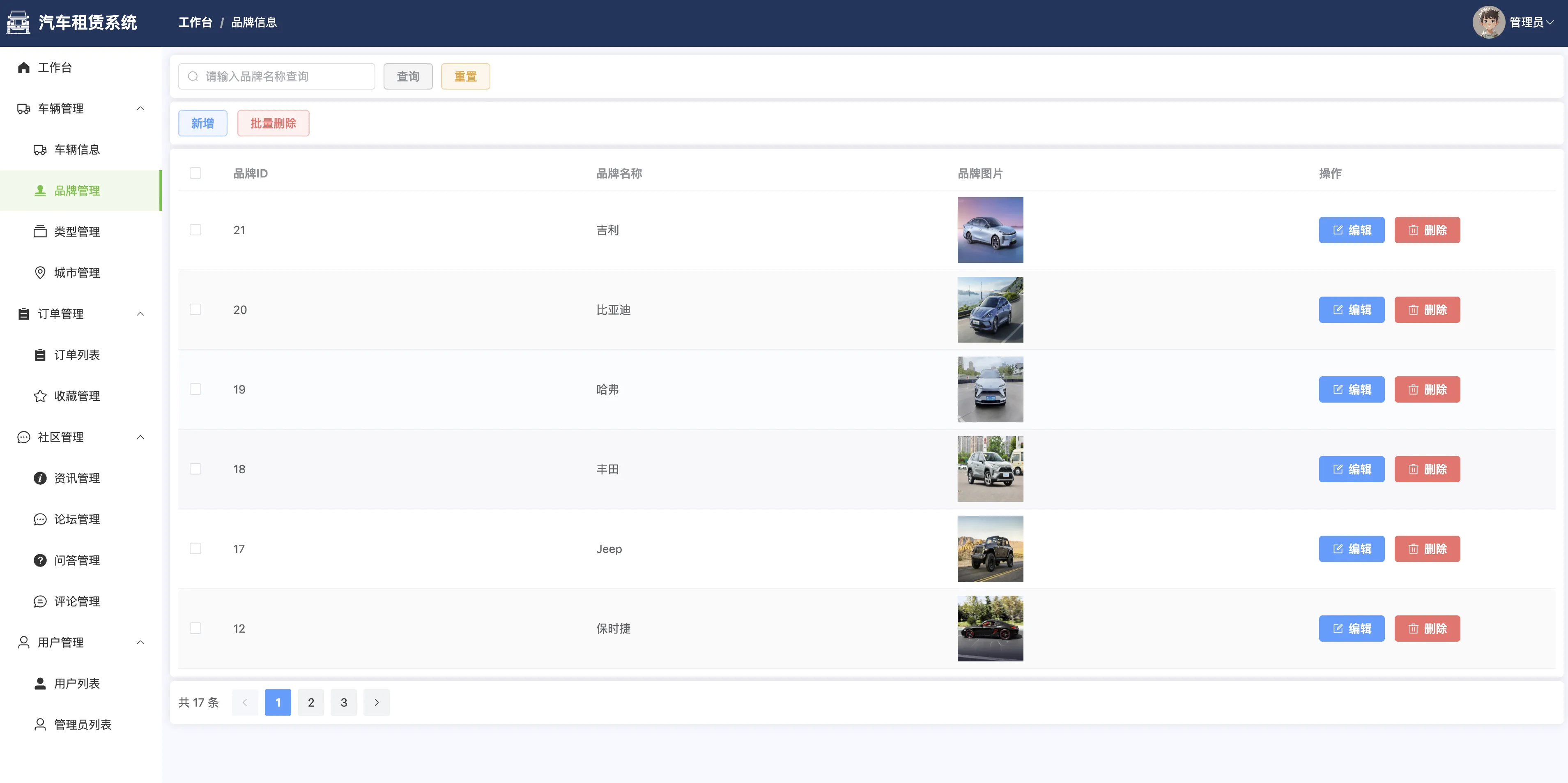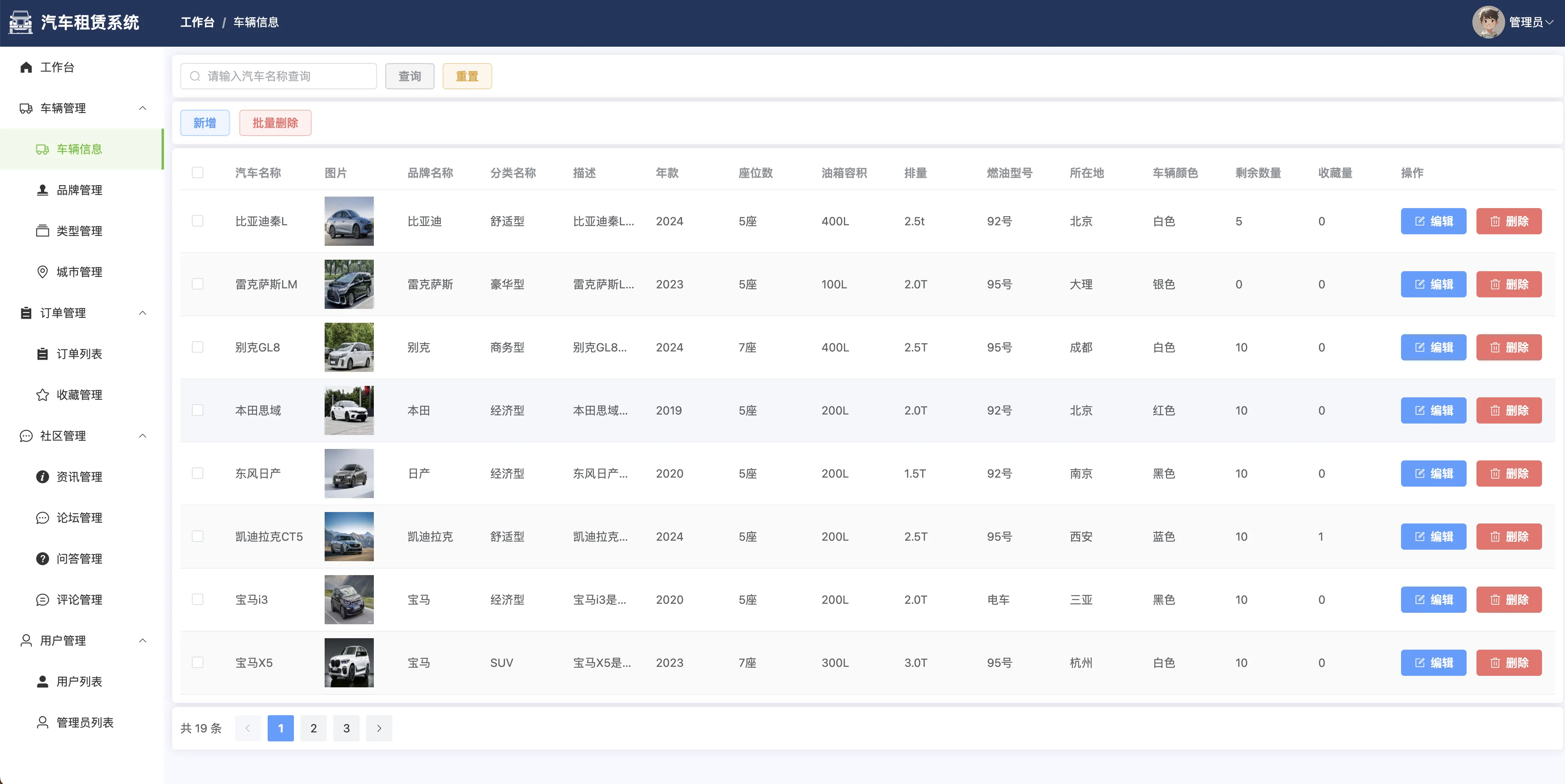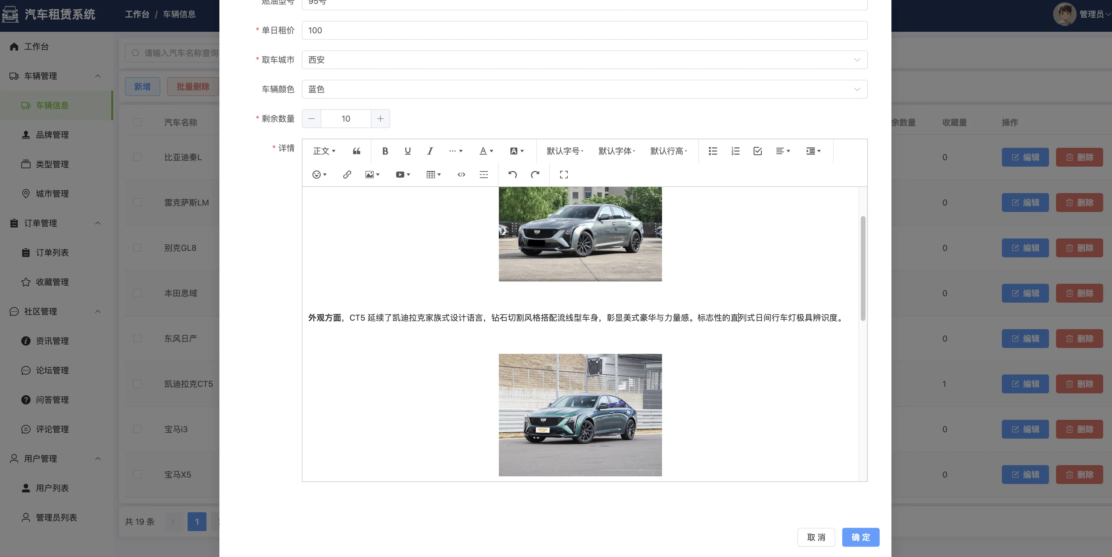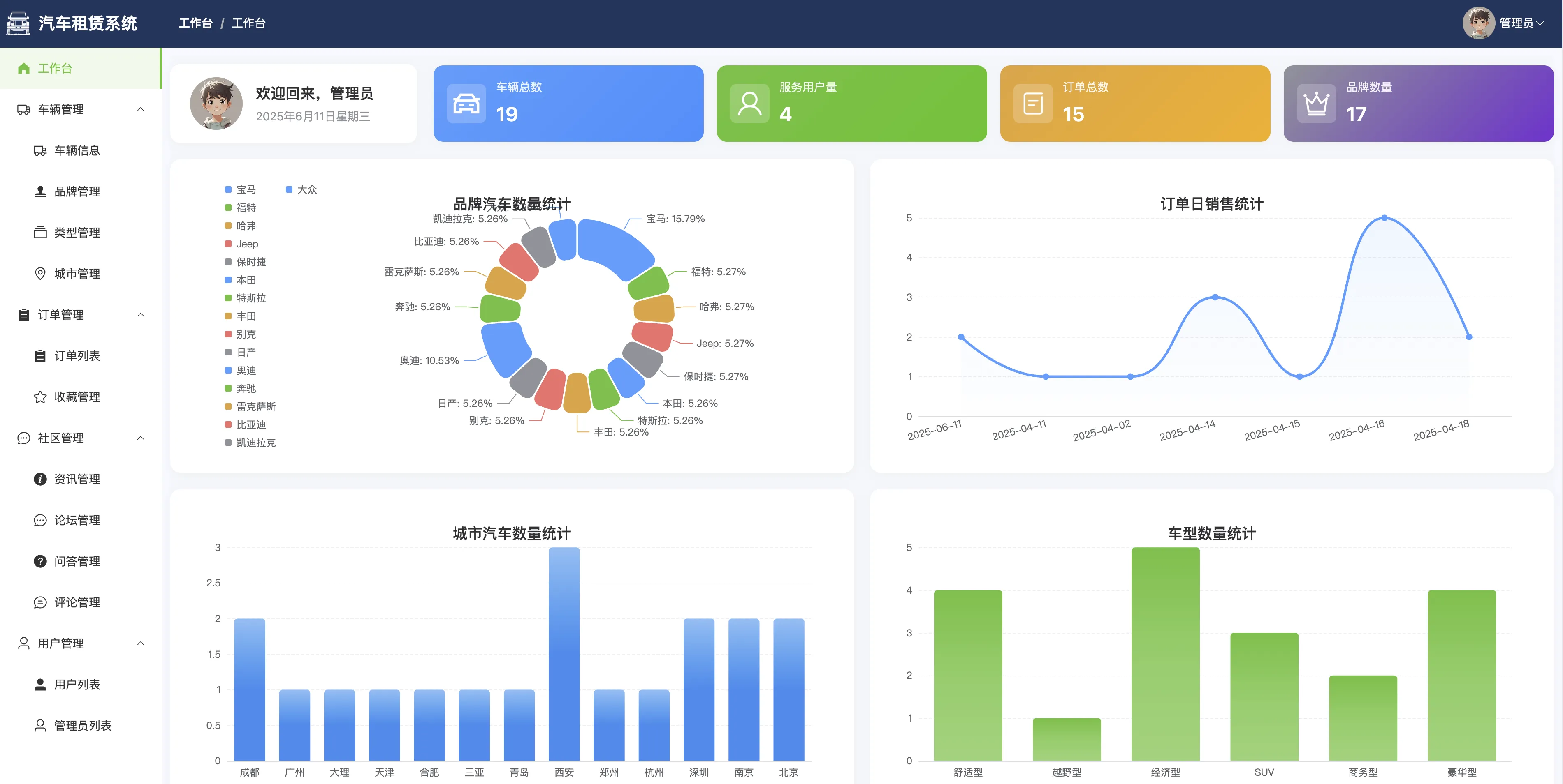 管理员端包括系统登录、个人信息管理、密码修改等基本功能,并通过数据可视化工作台实现品牌数量、订单趋势、城市分布、车型统计等多维度业务监控。核心功能涵盖汽车与类型管理、租赁订单审批、品牌与城市维护、用户与管理员信息管理,同时提供论坛审核、问答回复、评论与收藏管理、反馈信息处理等多项内容运营支持。系统还集成富文本编辑器(wangeditor),提升资讯发布与论坛管理的图文处理能力。