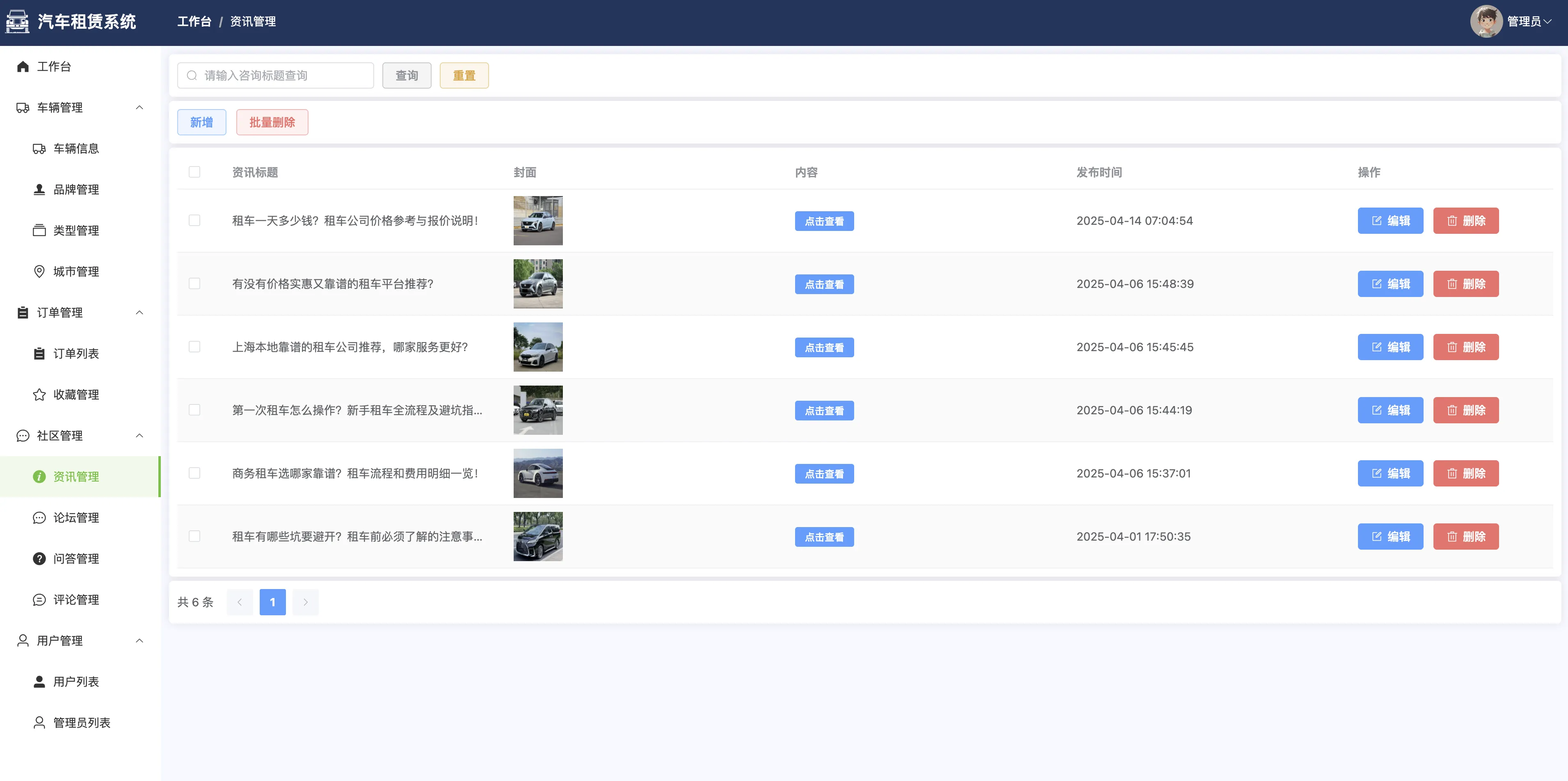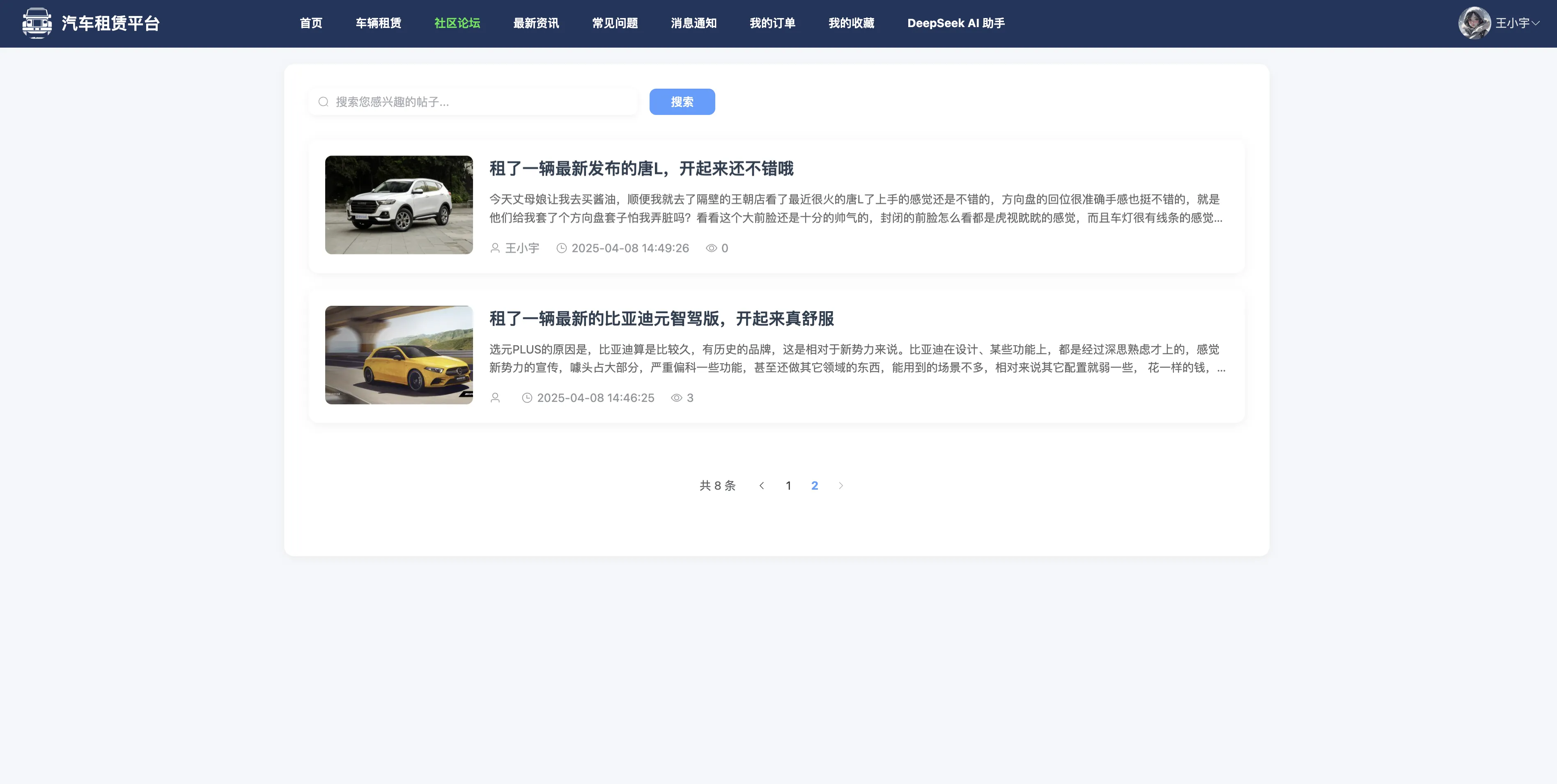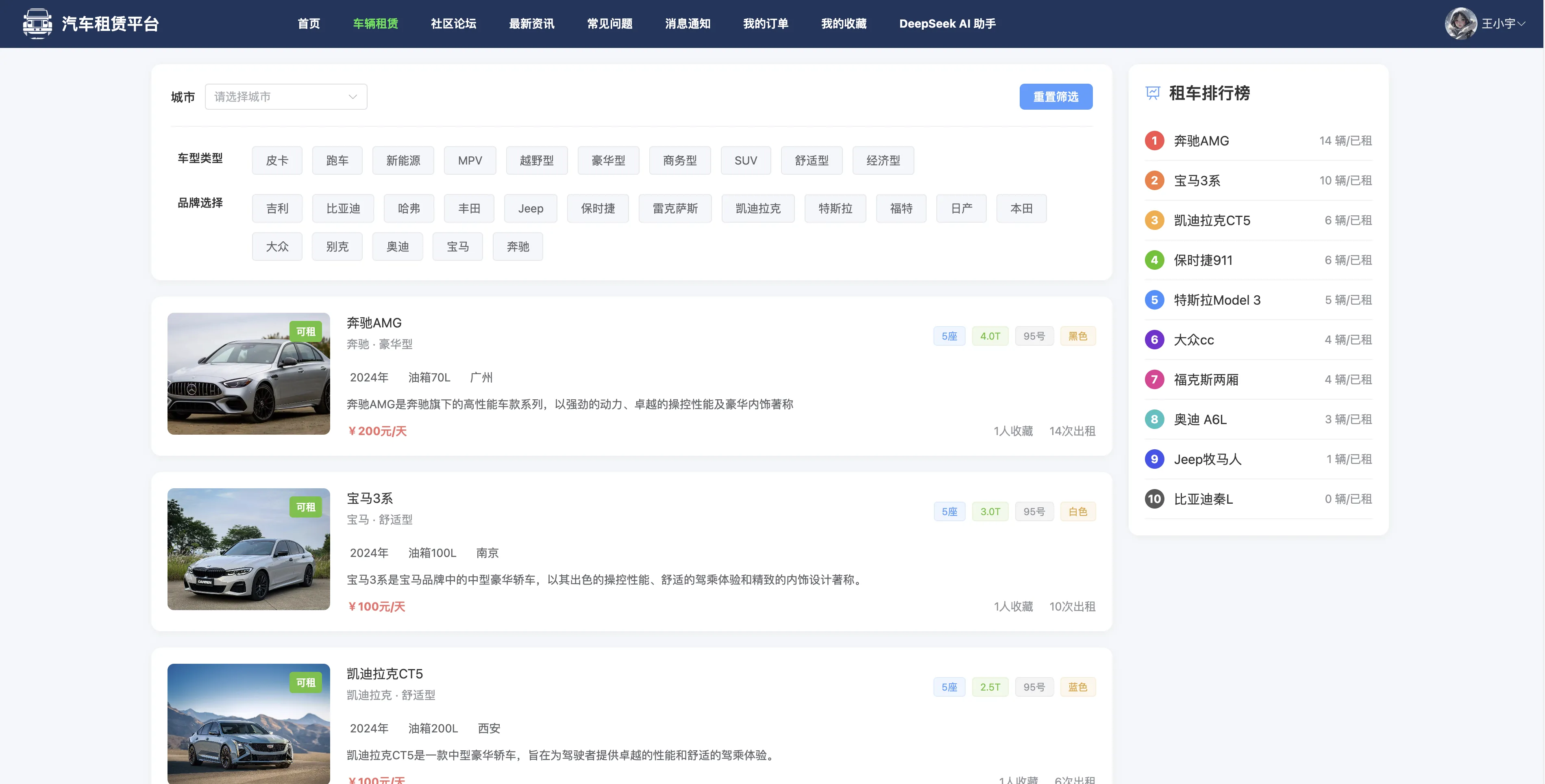 用户端提供首页轮播展示、热门推荐、资讯浏览、问答互动、车辆检索与租赁下单等功能,支持城市、品牌、车型等多维筛选,并引入热门车辆排行榜与社区论坛,增强互动性和实用性。用户可在“我的”模块中管理订单、反馈、发帖、提问、收藏、个人信息等,形成完整的租赁业务闭环体验。
