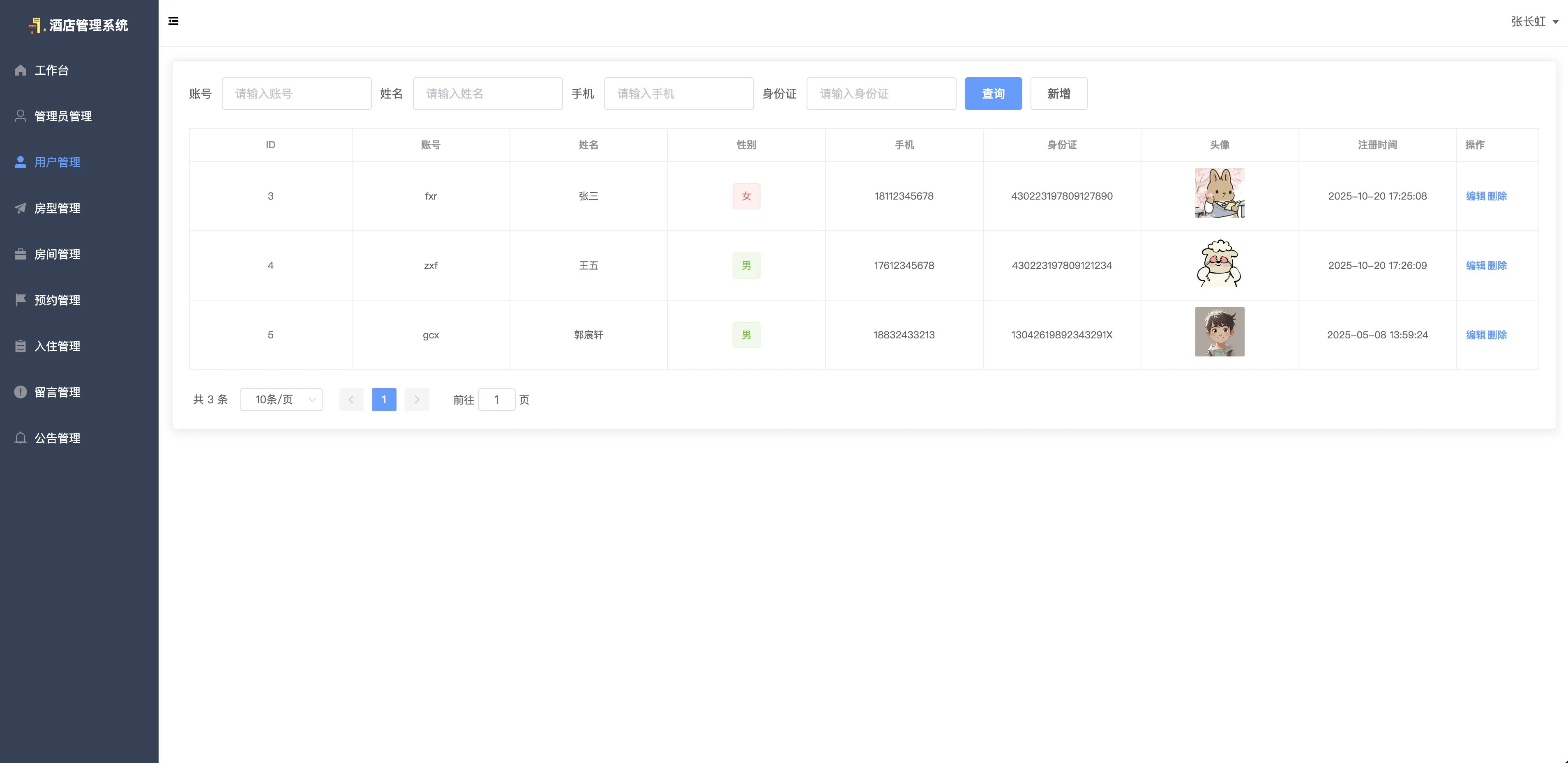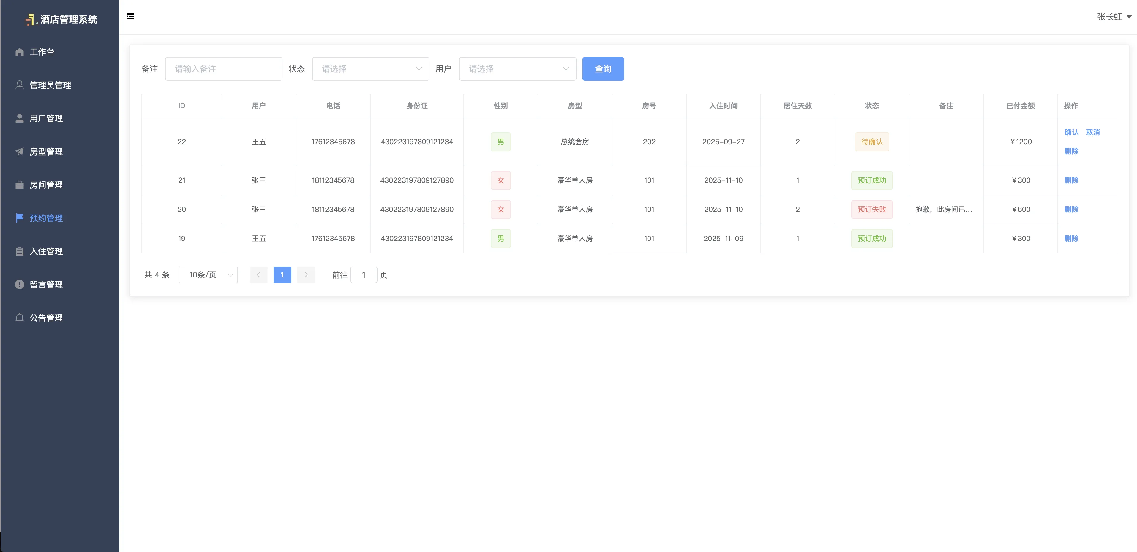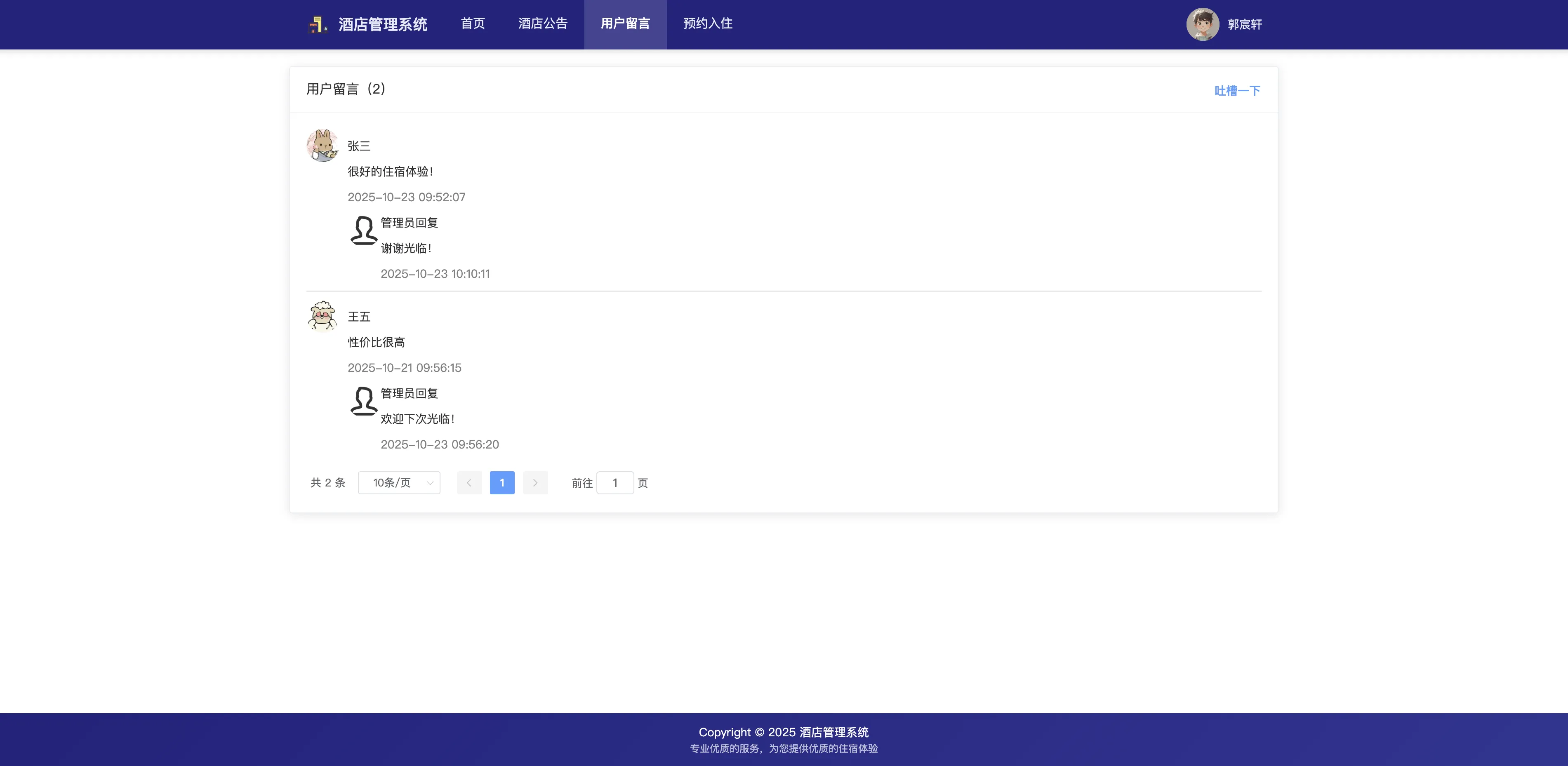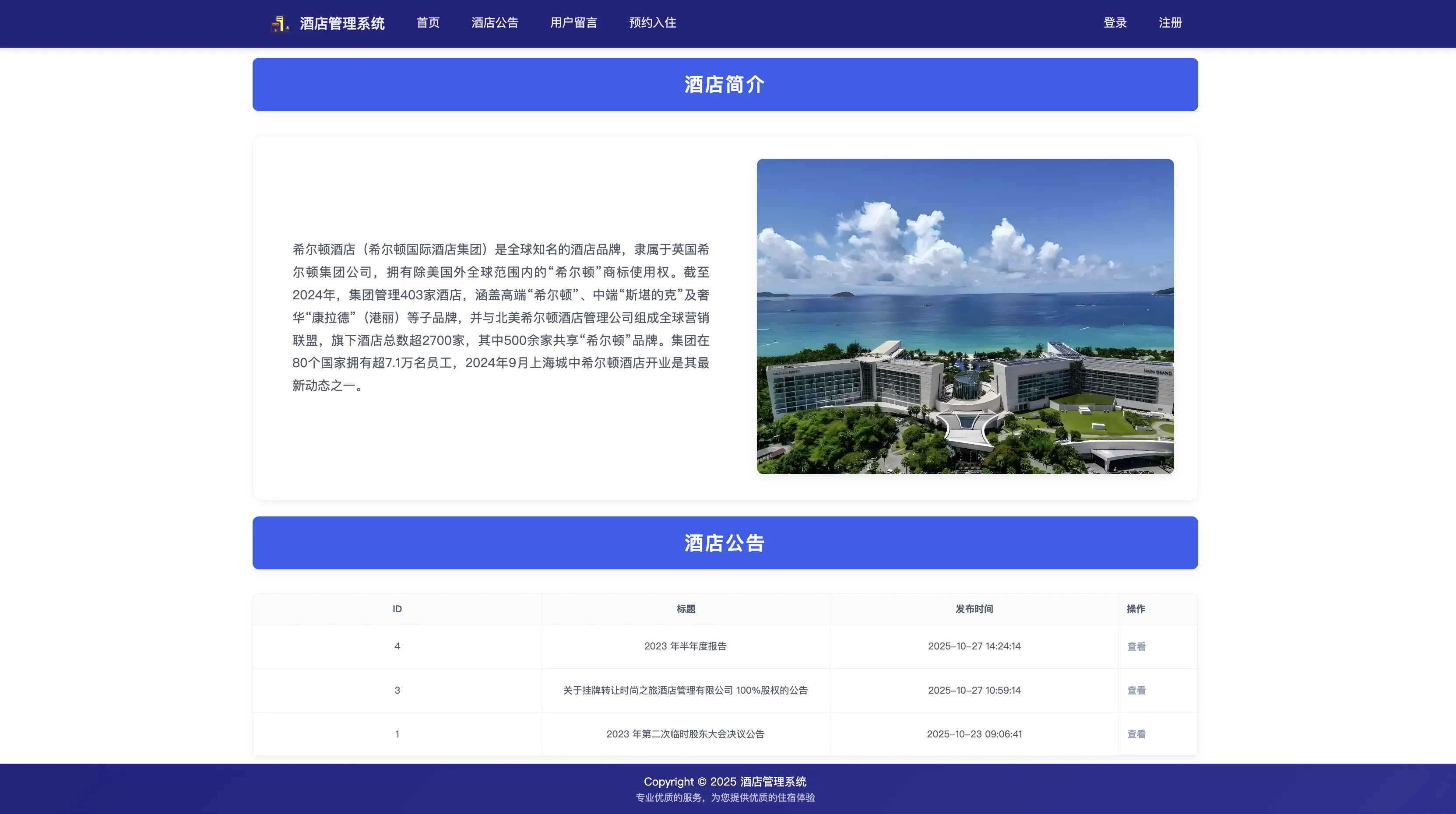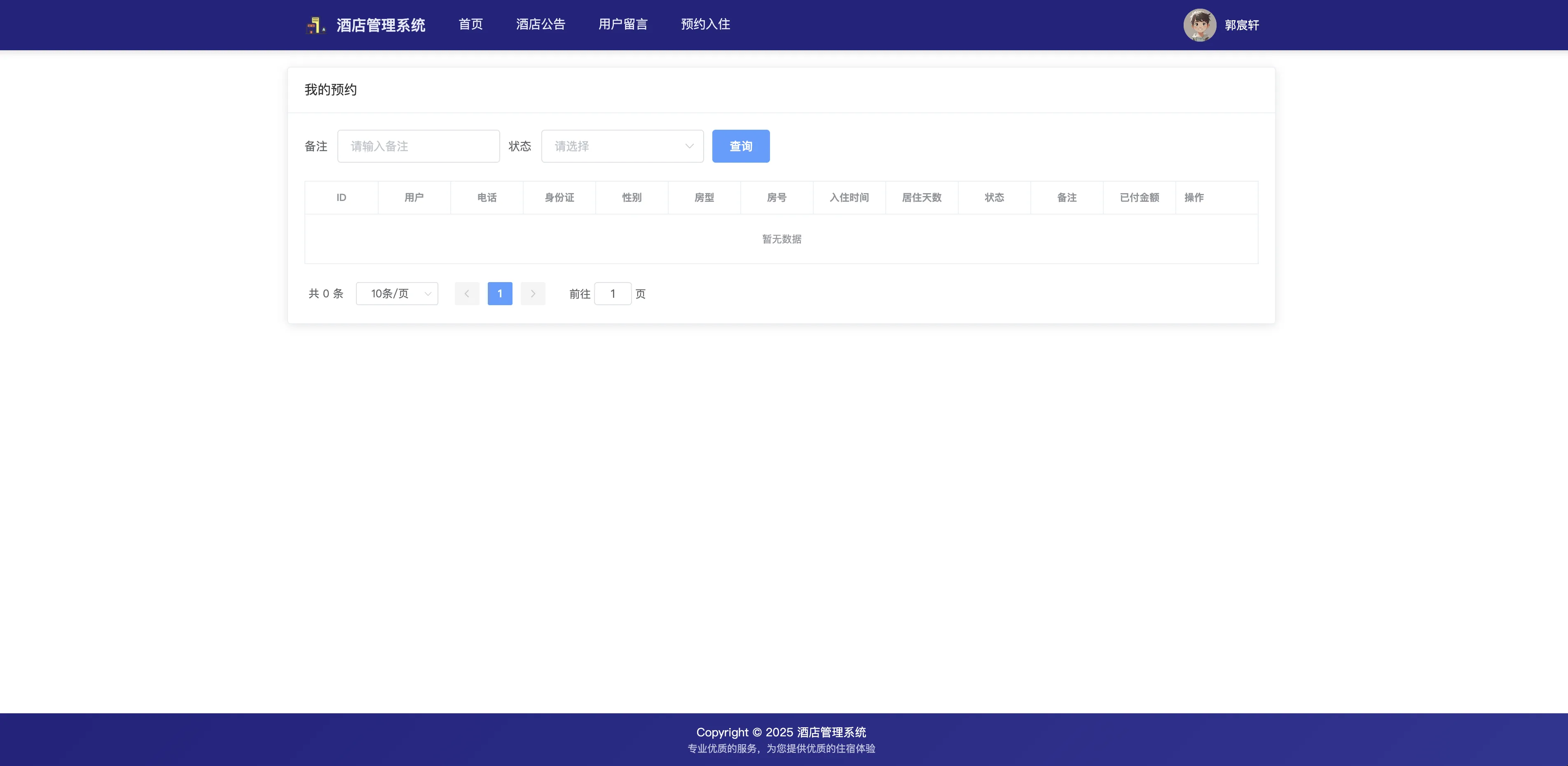 本系统设有两种角色:管理员与用户。管理员可对用户信息、房型与房间、预约与入住记录、留言与公告等进行全流程管理;用户则可在线查看酒店公告、提交留言、预约房间、查看和管理自己的入住与预约记录等。通过系统的引入,能够显著提升酒店客户服务效率、简化前台接待流程,并支持多角色、全流程、全数据链条管理。