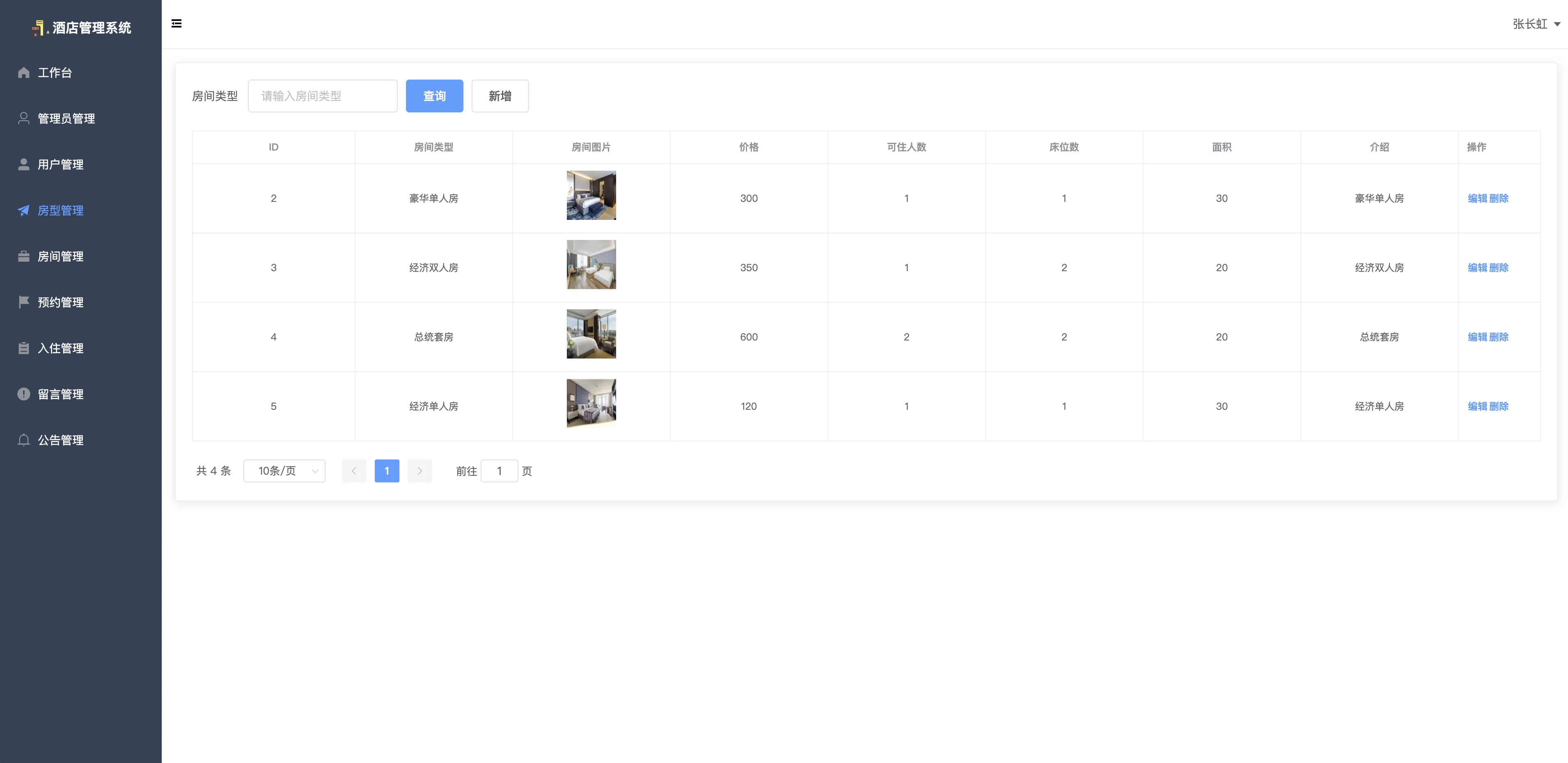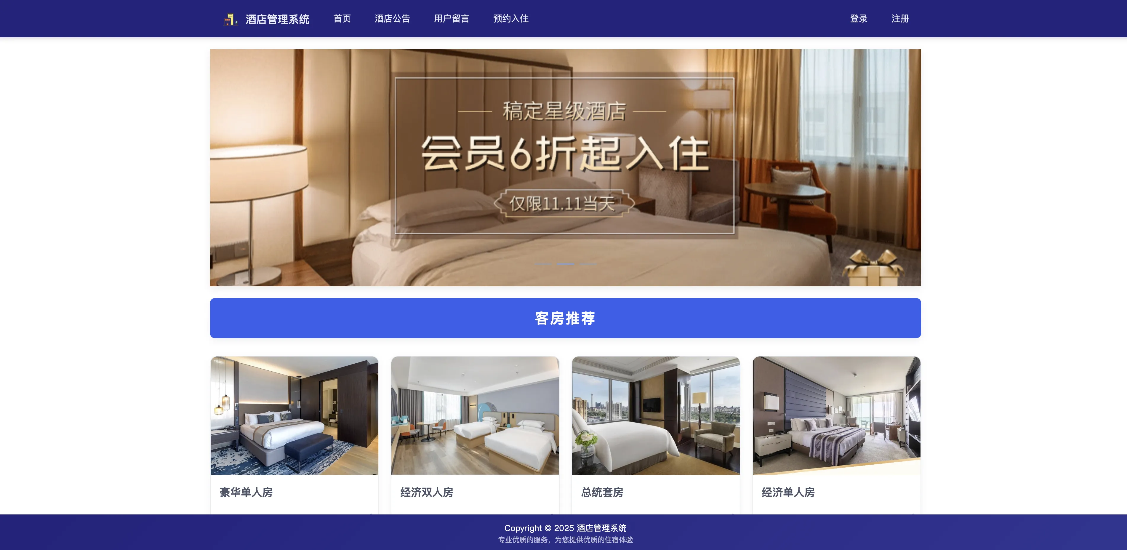 本项目是一个基于 SpringBoot 与 Vue 实现的酒店管理系统,采用前后端分离开发模式,本系统整体采用 B/S 架构设计,MySQL 数据库作为主要数据存储支撑。本系统围绕酒店客房预约与入住流程为核心,集成了房型管理、房间管理、用户留言、公告发布等多个功能模块,致力于实现酒店业务的线上化与信息化管理。