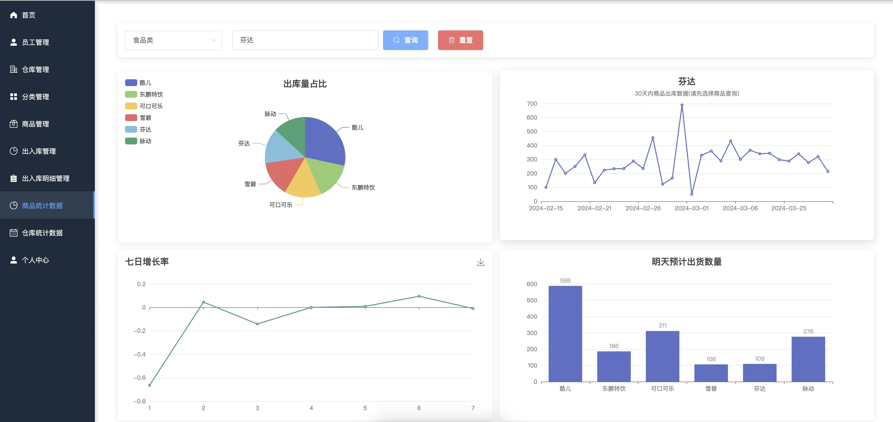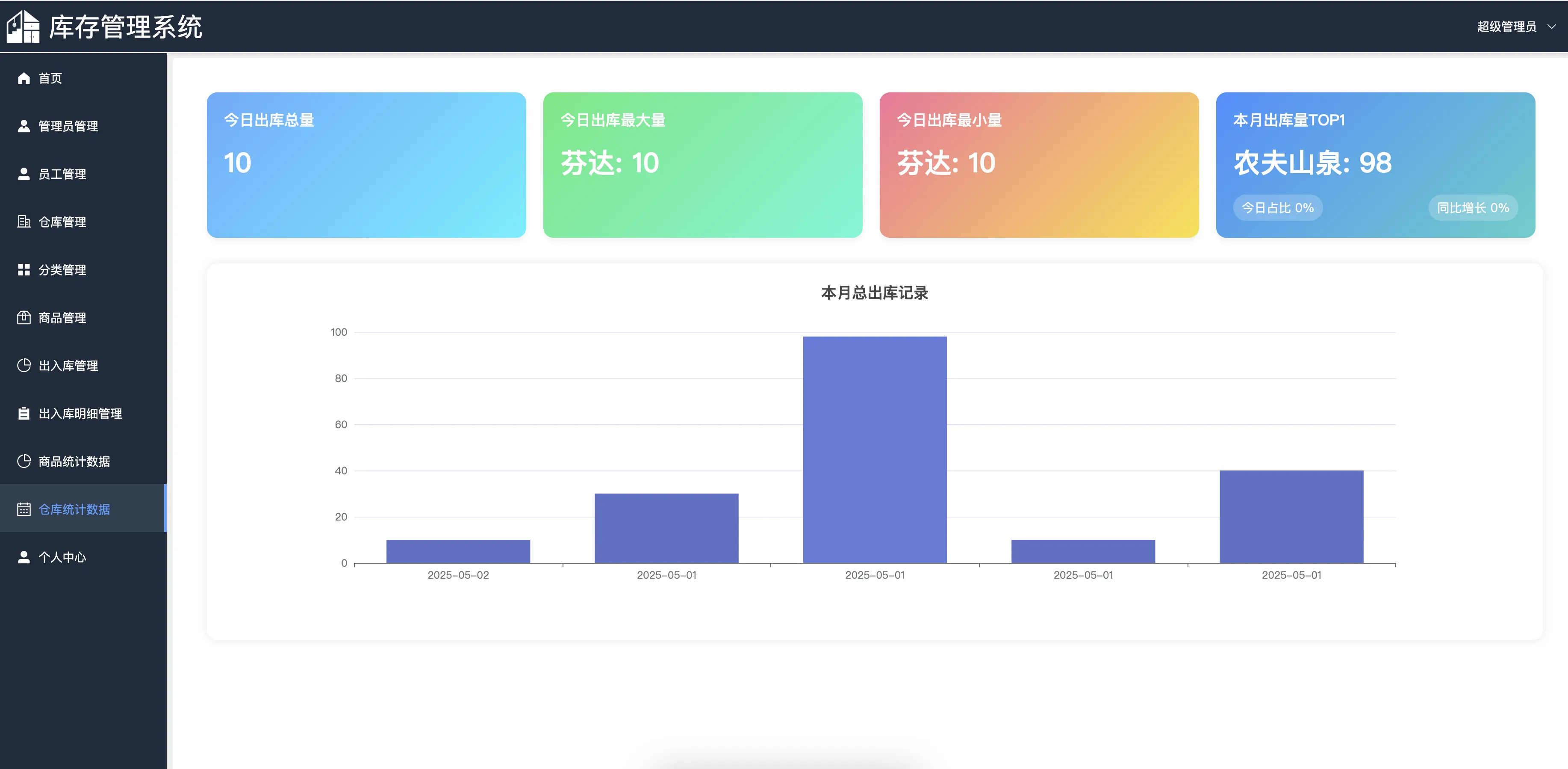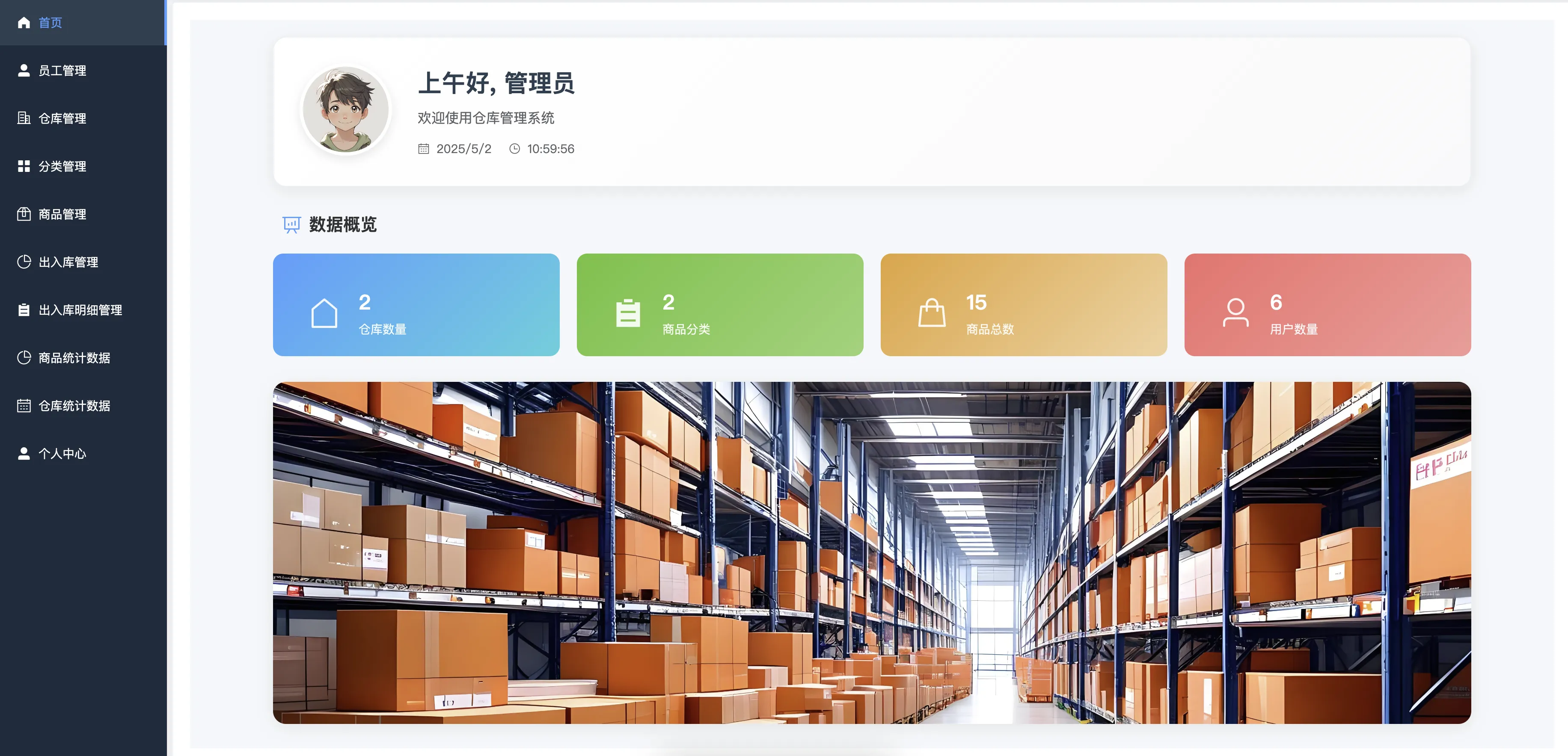 本系统主要包括登录模块、仓库管理、分类管理、商品管理、出入库管理、出入库明细、商品统计、仓库统计、管理员管理、员工管理以及个人中心等多个功能模块。通过对商品出入库的精准记录与数据统计,系统能够帮助企业实现库存信息的动态掌控和数据可视化展示,提升库存管理效率与准确性。