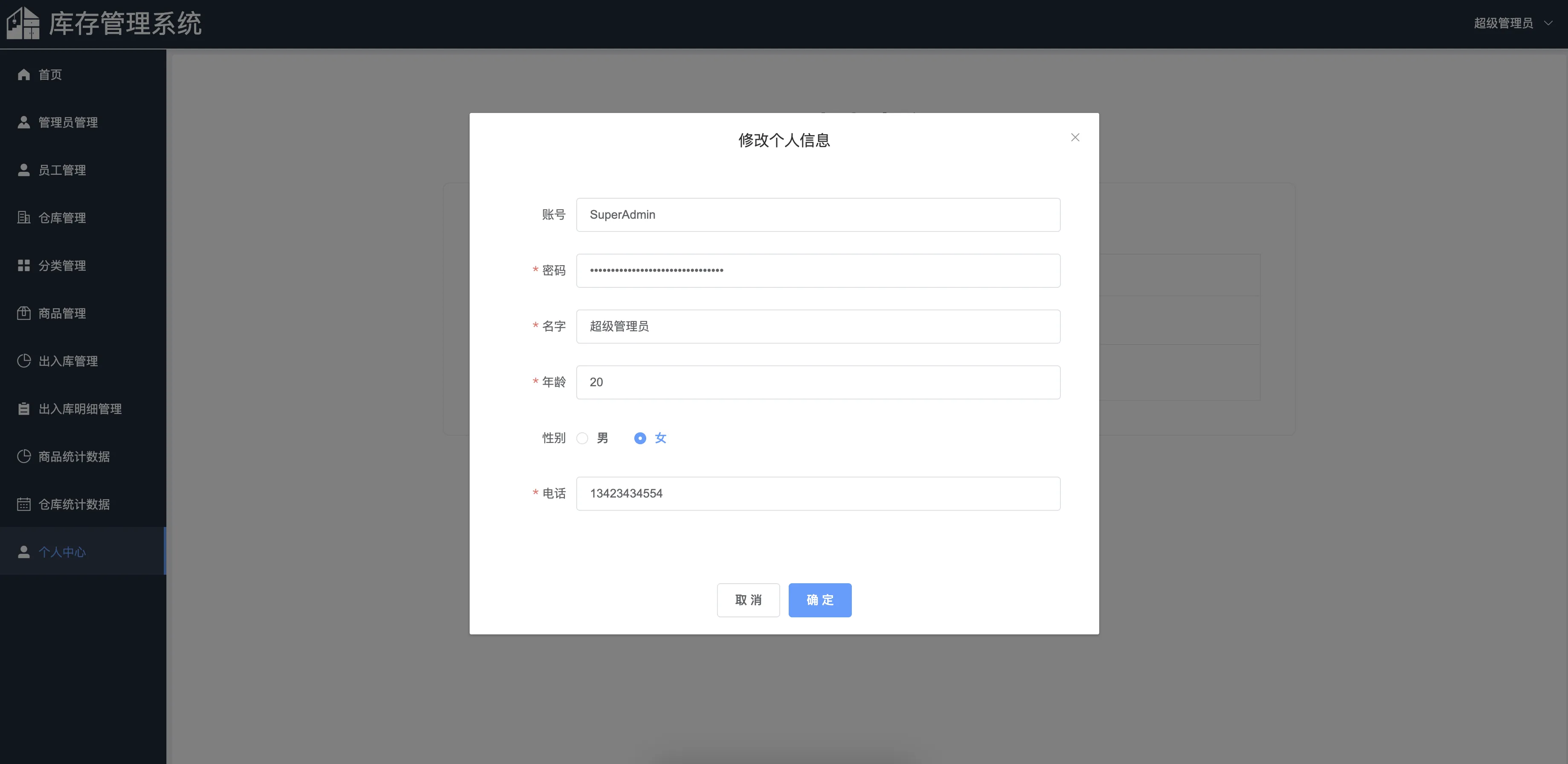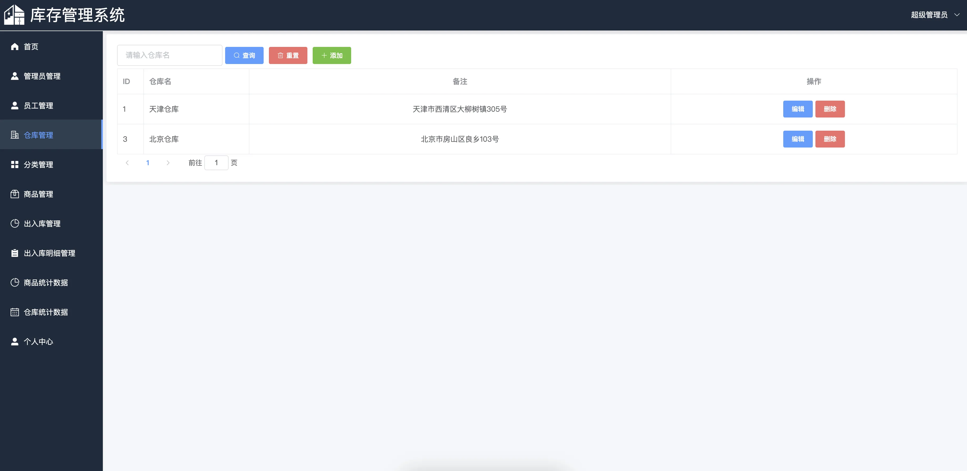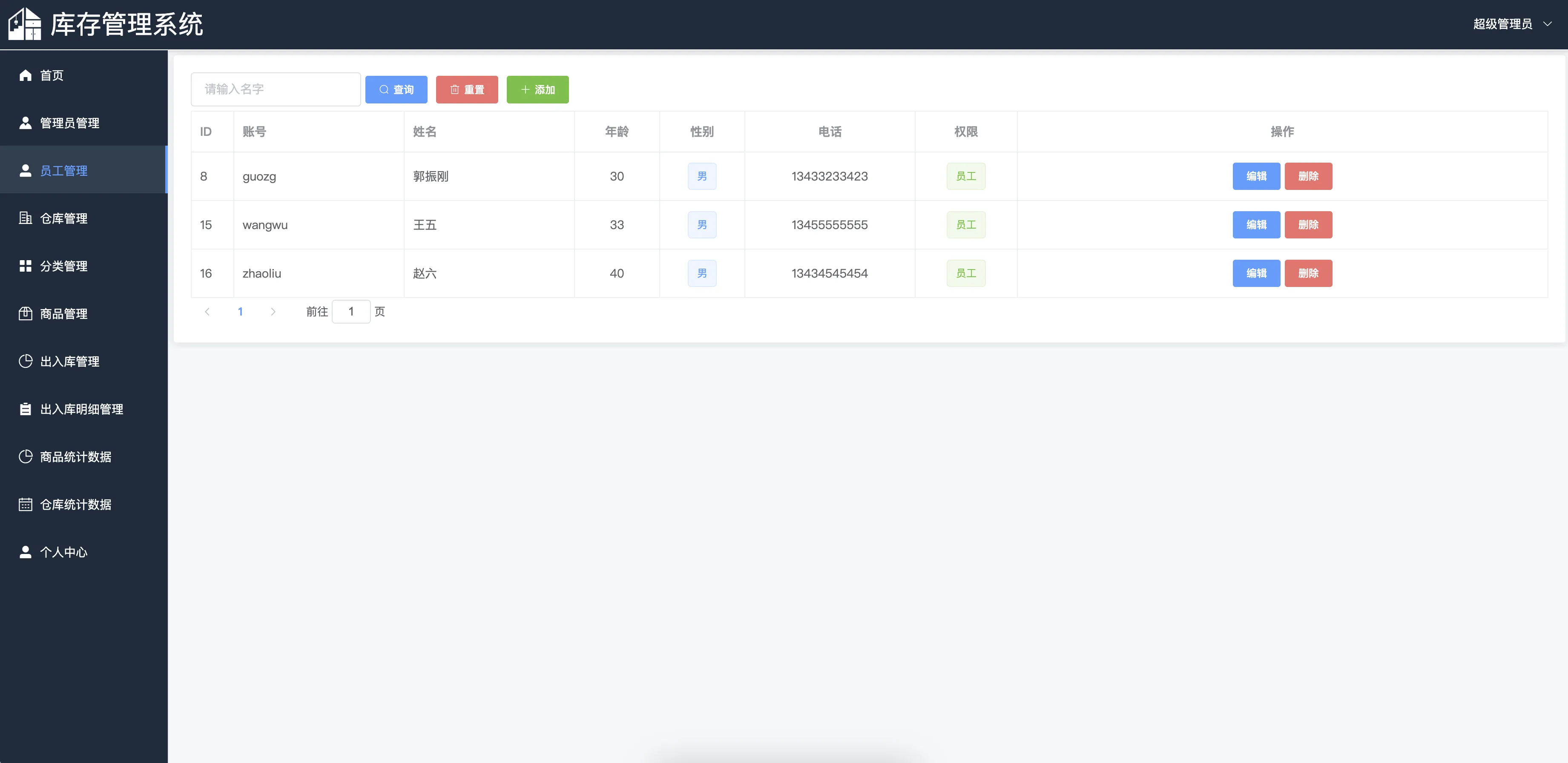 本系统主要包括登录模块、仓库管理、分类管理、商品管理、出入库管理、出入库明细、商品统计、仓库统计、管理员管理、员工管理以及个人中心等多个功能模块,主要涉及超级管理员、管理员、员工三种角色,每种用户角色拥有不同的功能权限。