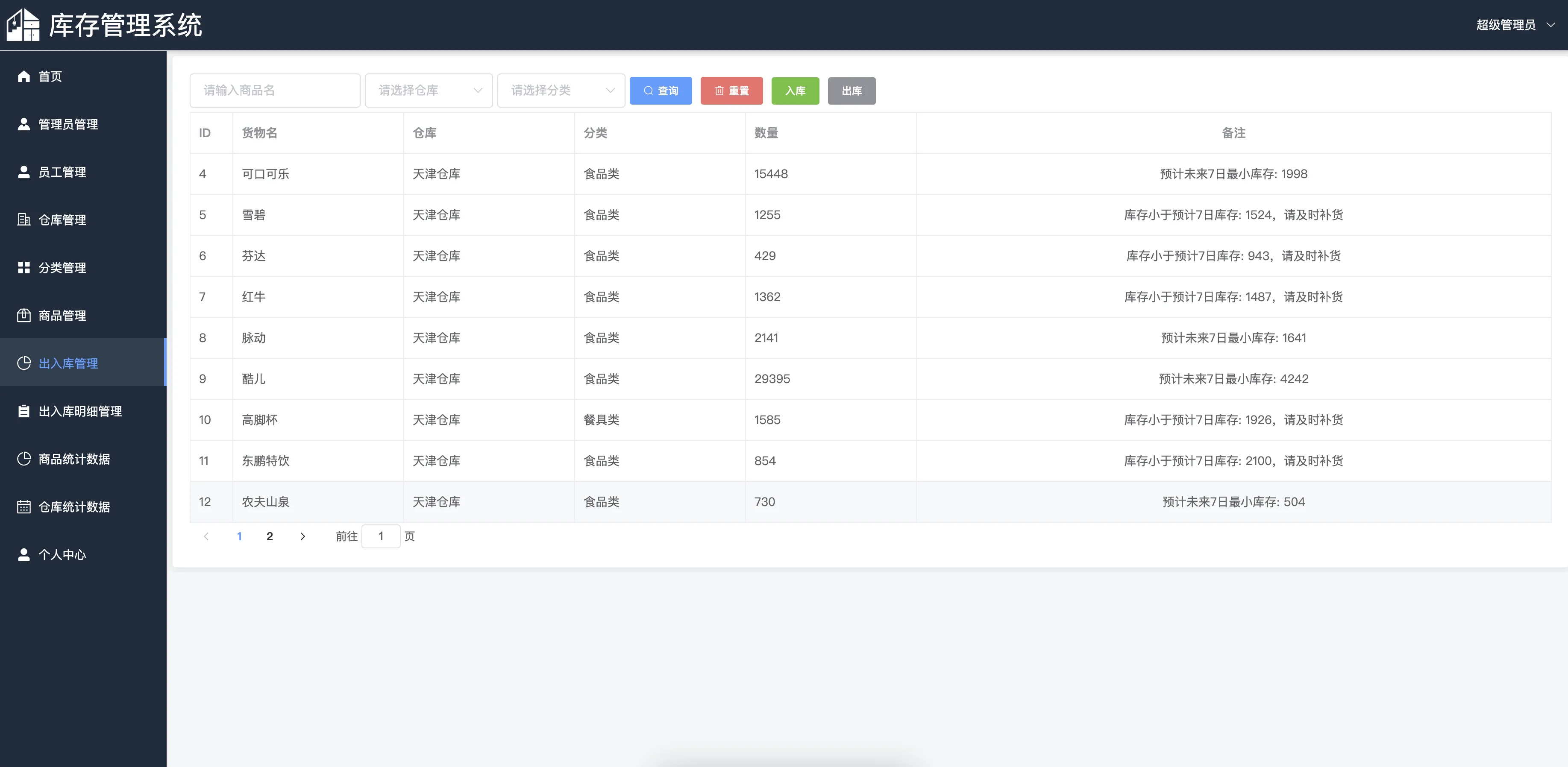 本项目是一个基于SpringBoot和Vue实现的前后端分离式库存管理系统,采用B/S架构设计,MySQL作为主数据库存储,旨在为电商企业提供高效、智能、实用的库存管理解决方案。系统分为超级管理员、管理员和员工三种角色,不同角色根据权限划分拥有不同的功能操作范围,实现了系统的权限精细化管理。
