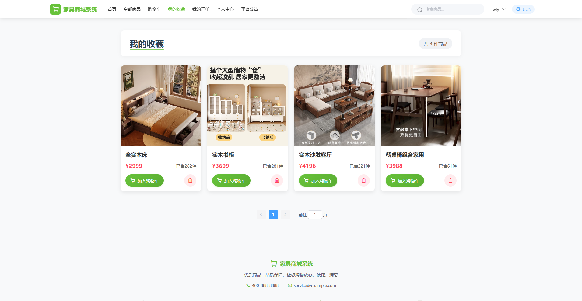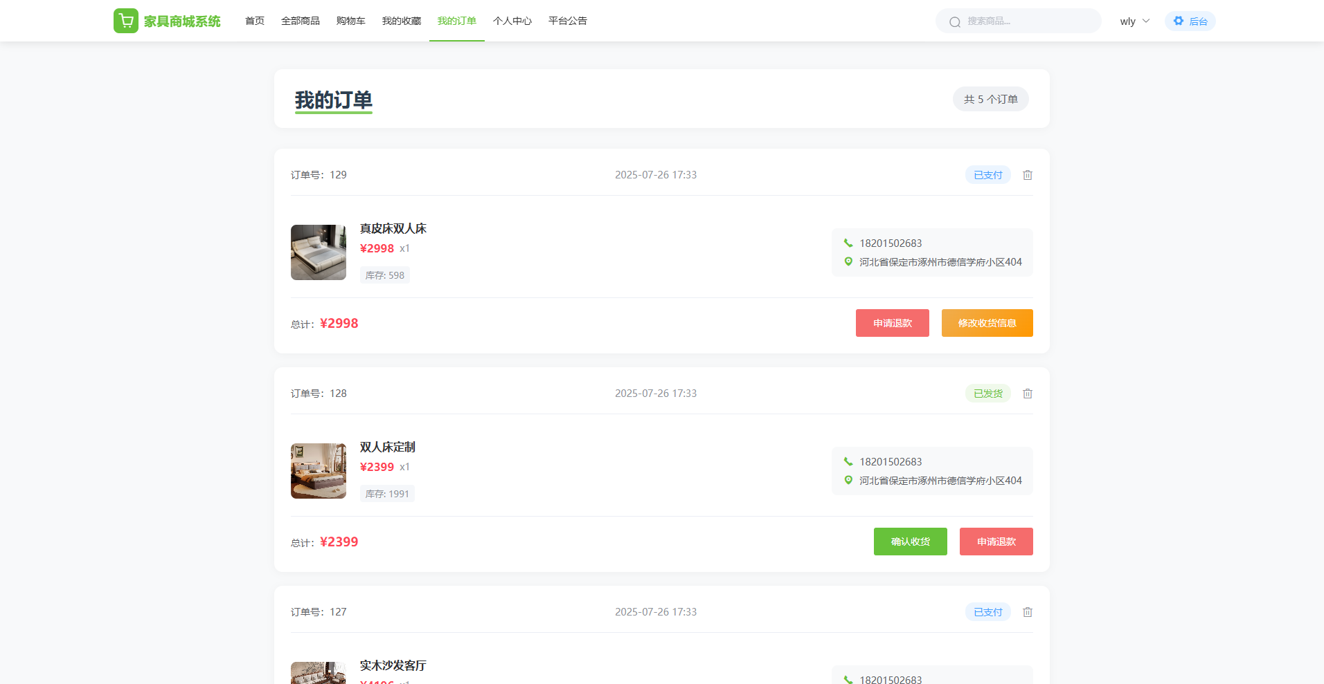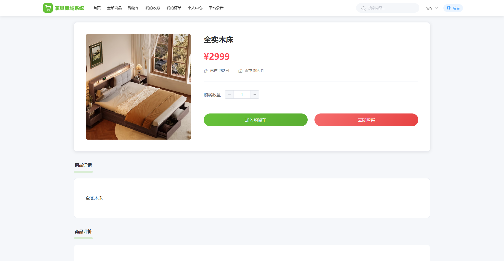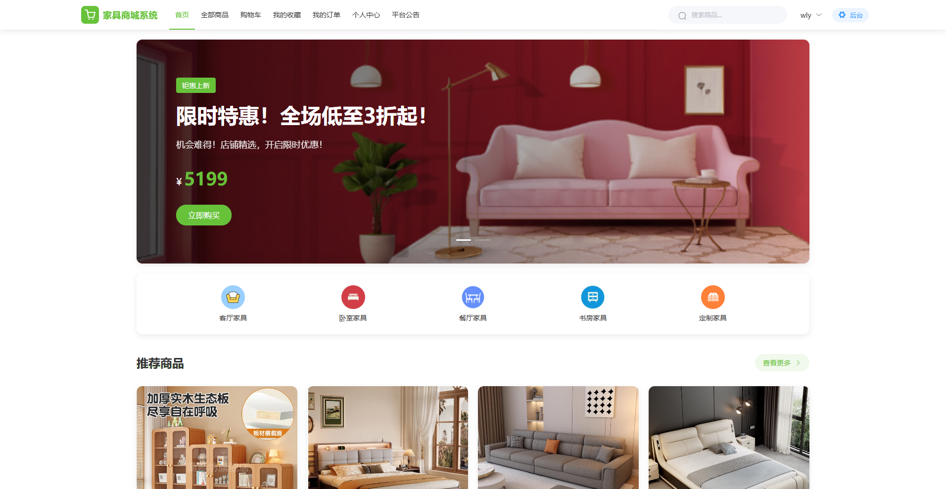 用户端:面向普通用户,支持多品类商品浏览、下单购买、购物车管理、订单追踪、地址管理、商品评价、收藏管理、公告查看、个人中心等功能,并通过协同过滤算法实现个性化商品推荐,打造涵盖家具选购、交易、服务的完整用户闭环,提升用户满意度与平台粘性。