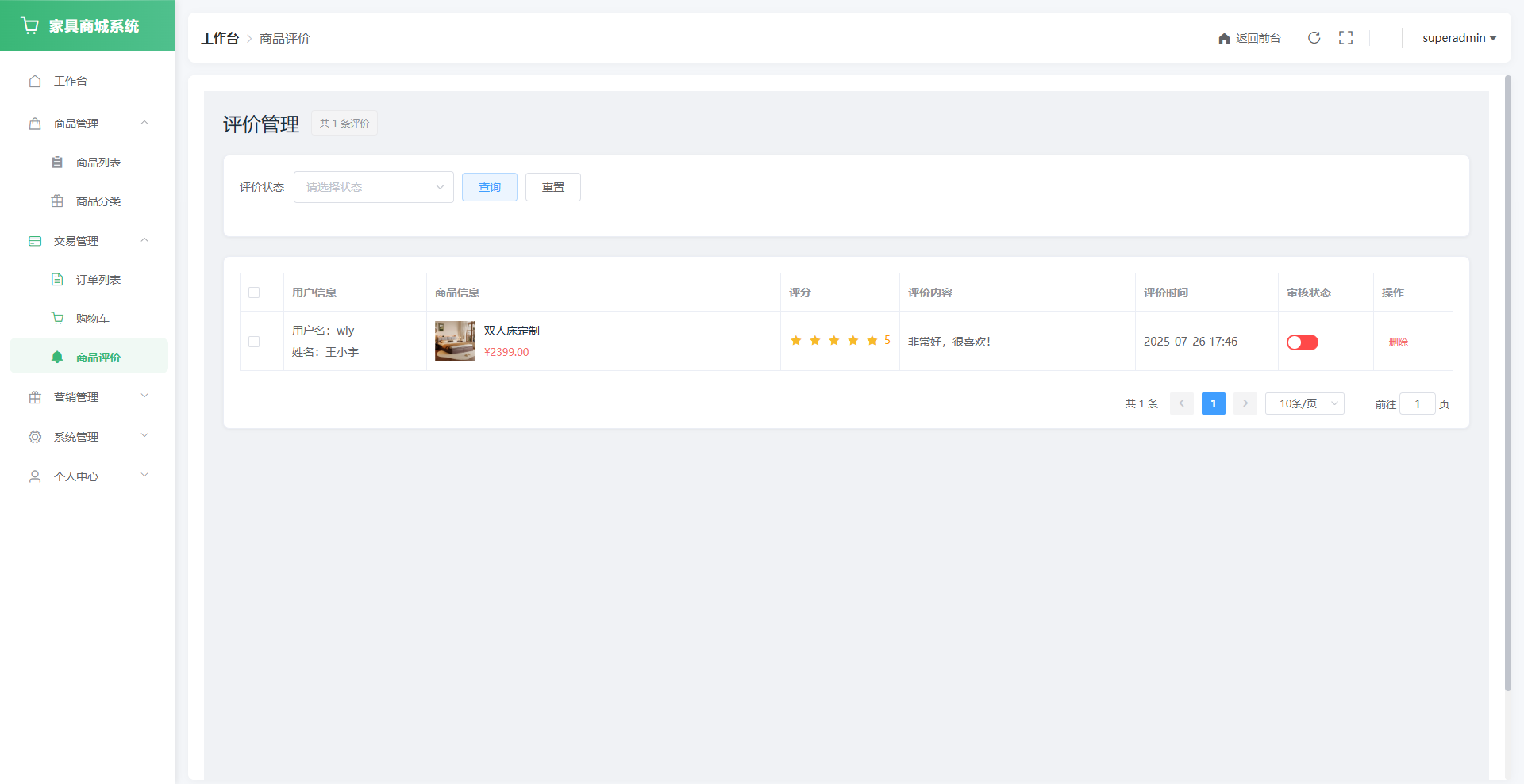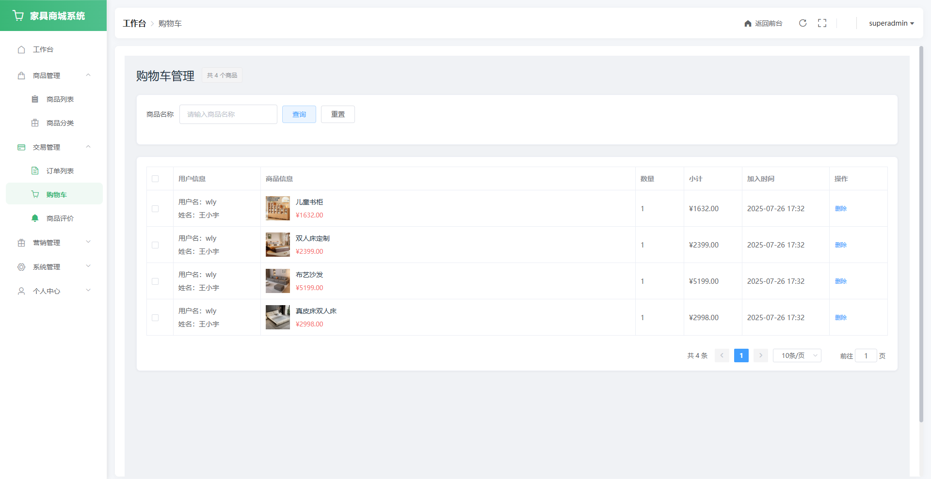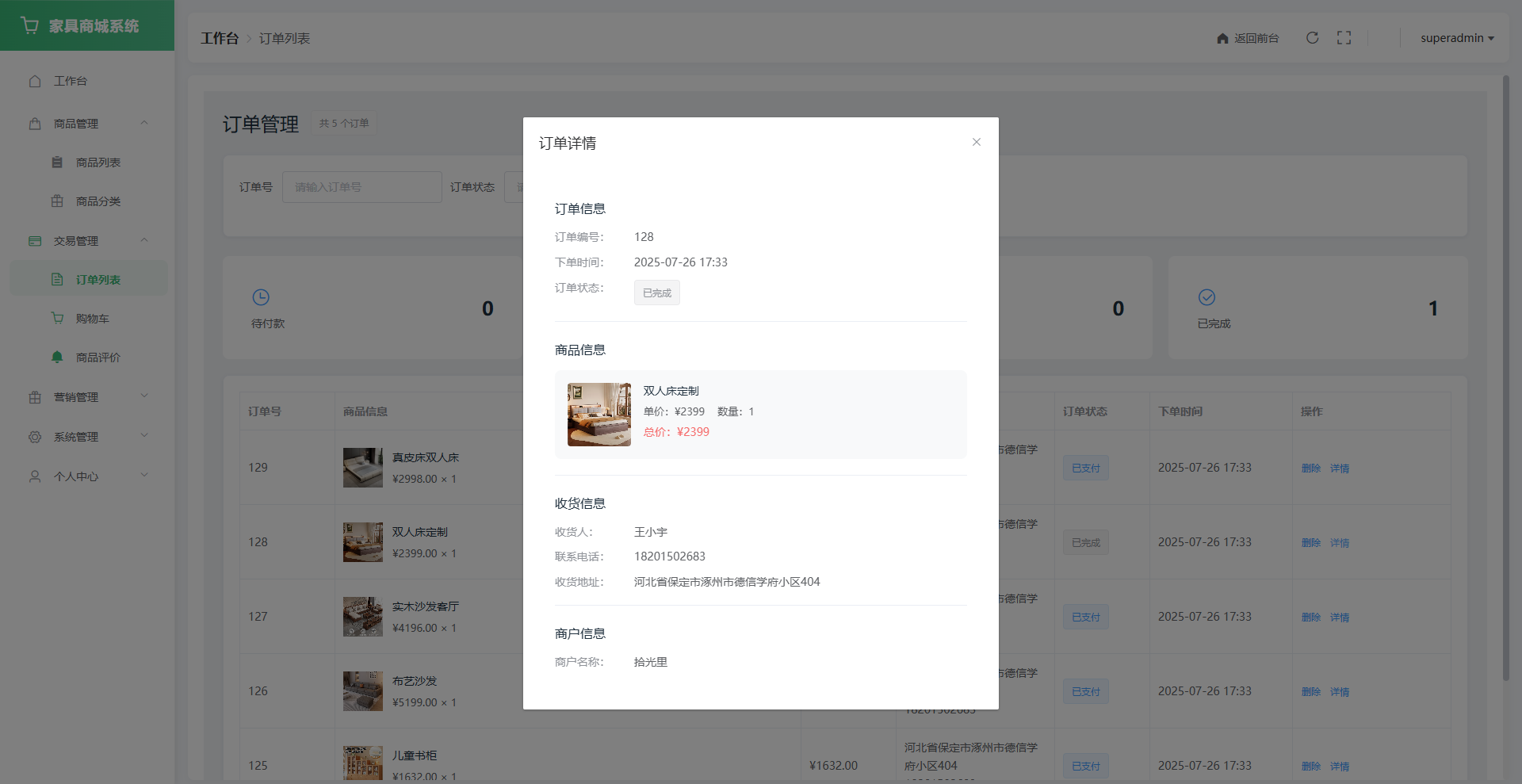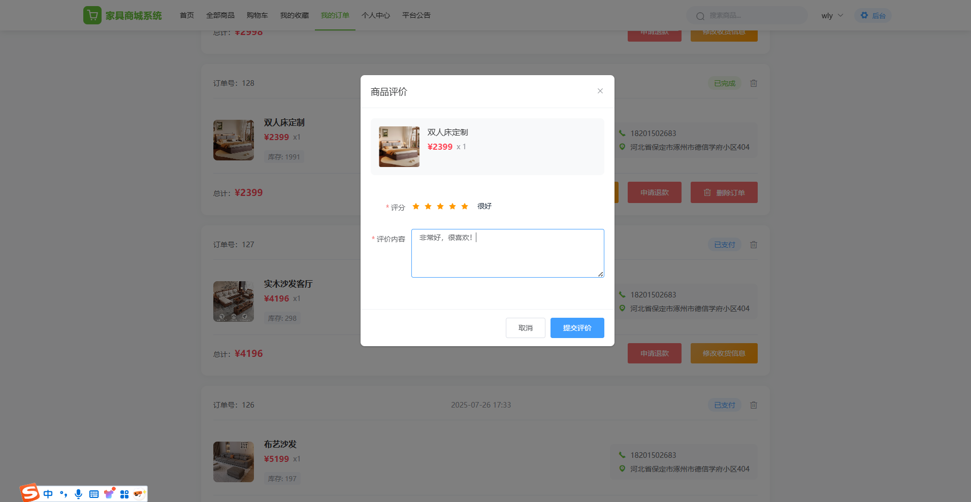 用户端:面向普通用户,支持多品类商品浏览、下单购买、购物车管理、订单追踪、地址管理、商品评价、收藏管理、公告查看、个人中心等功能,并通过协同过滤算法实现个性化商品推荐,打造涵盖家具选购、交易、服务的完整用户闭环,提升用户满意度与平台粘性。