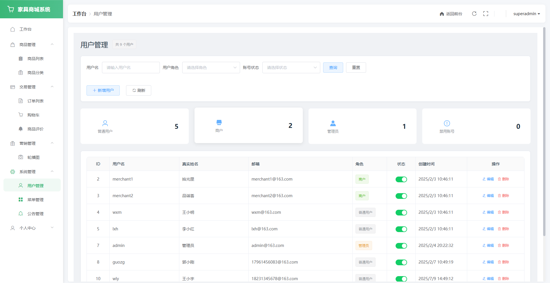 后端采用Spring Boot框架,集成Spring Security与JWT实现接口级别的权限控制与安全认证,使用MyBatis Plus提升数据访问效率,数据库采用MySQL进行业务数据持久化。本系统实现了基于RBAC的多角色权限管理(支持超级管理员、管理员、商户、普通用户)。