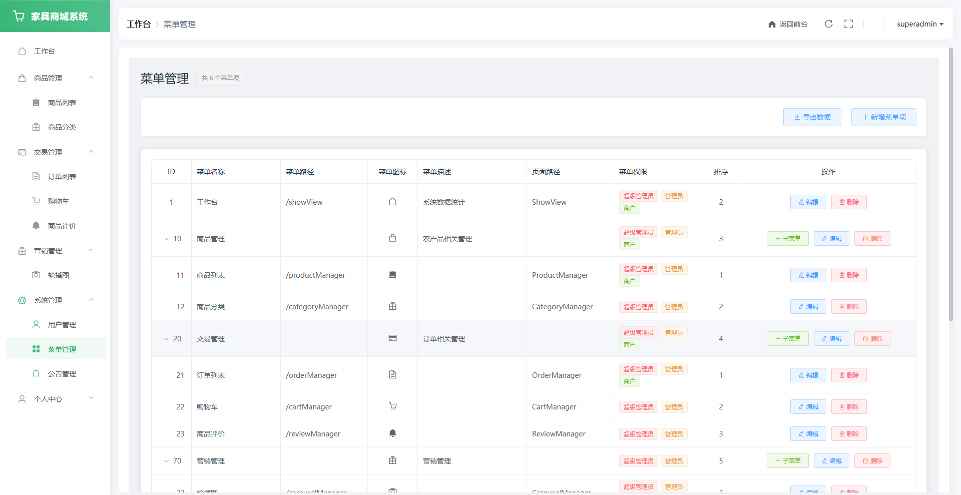 管理员与商家工作台支持订单、销售等多维数据可视化分析;RBAC权限模型确保多角色操作边界清晰,平台数据安全可靠。