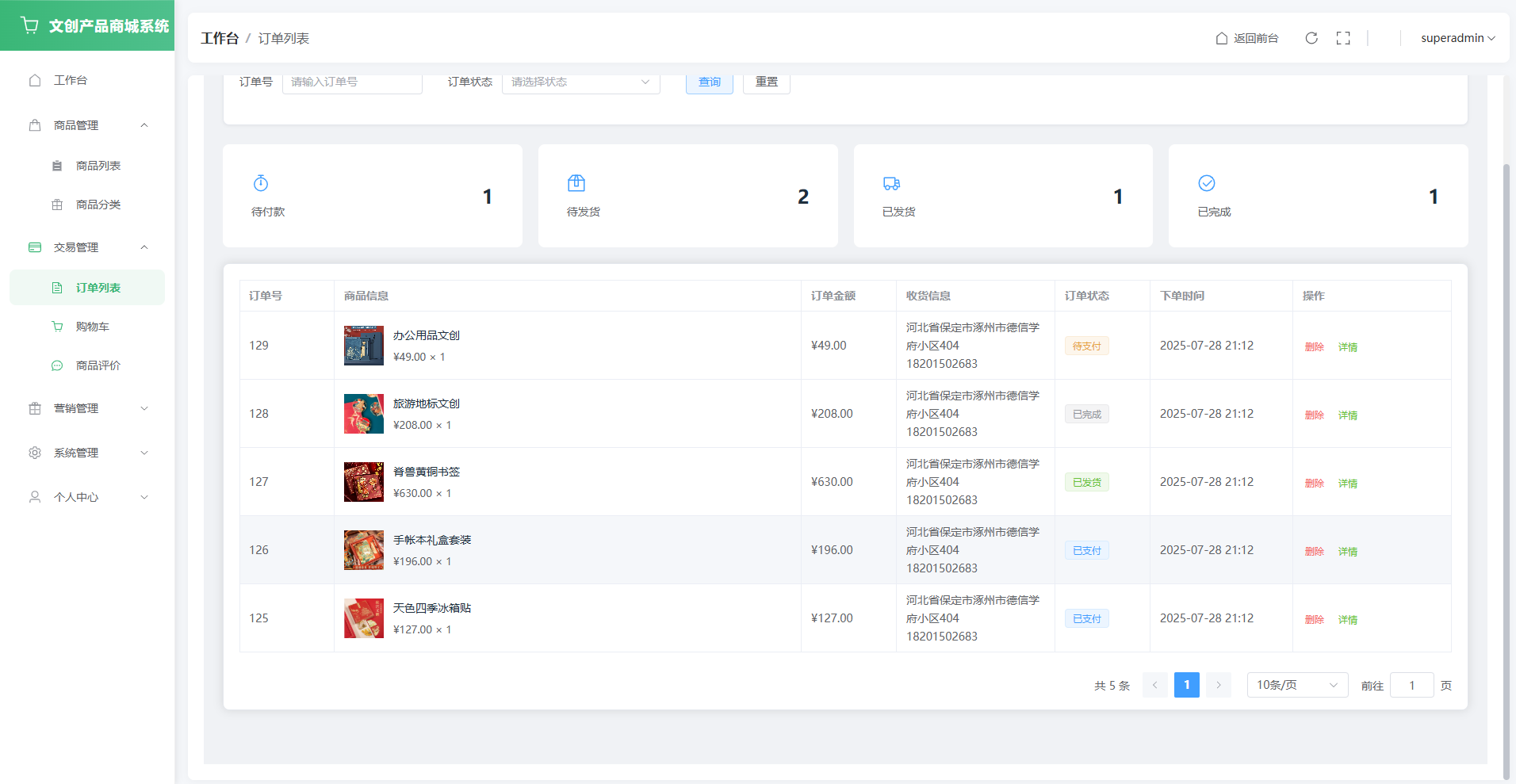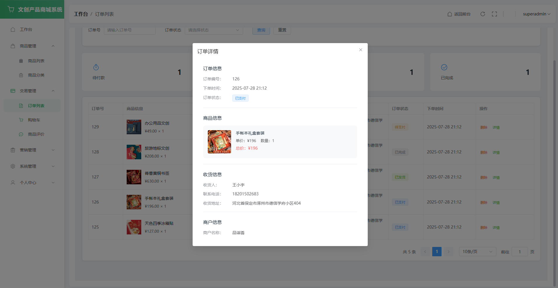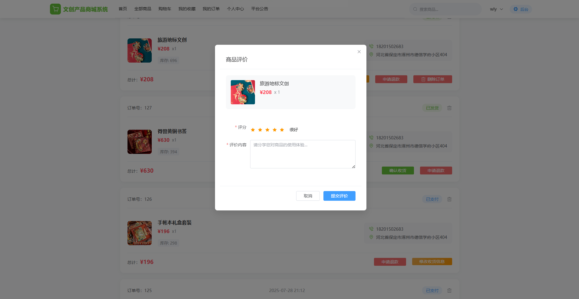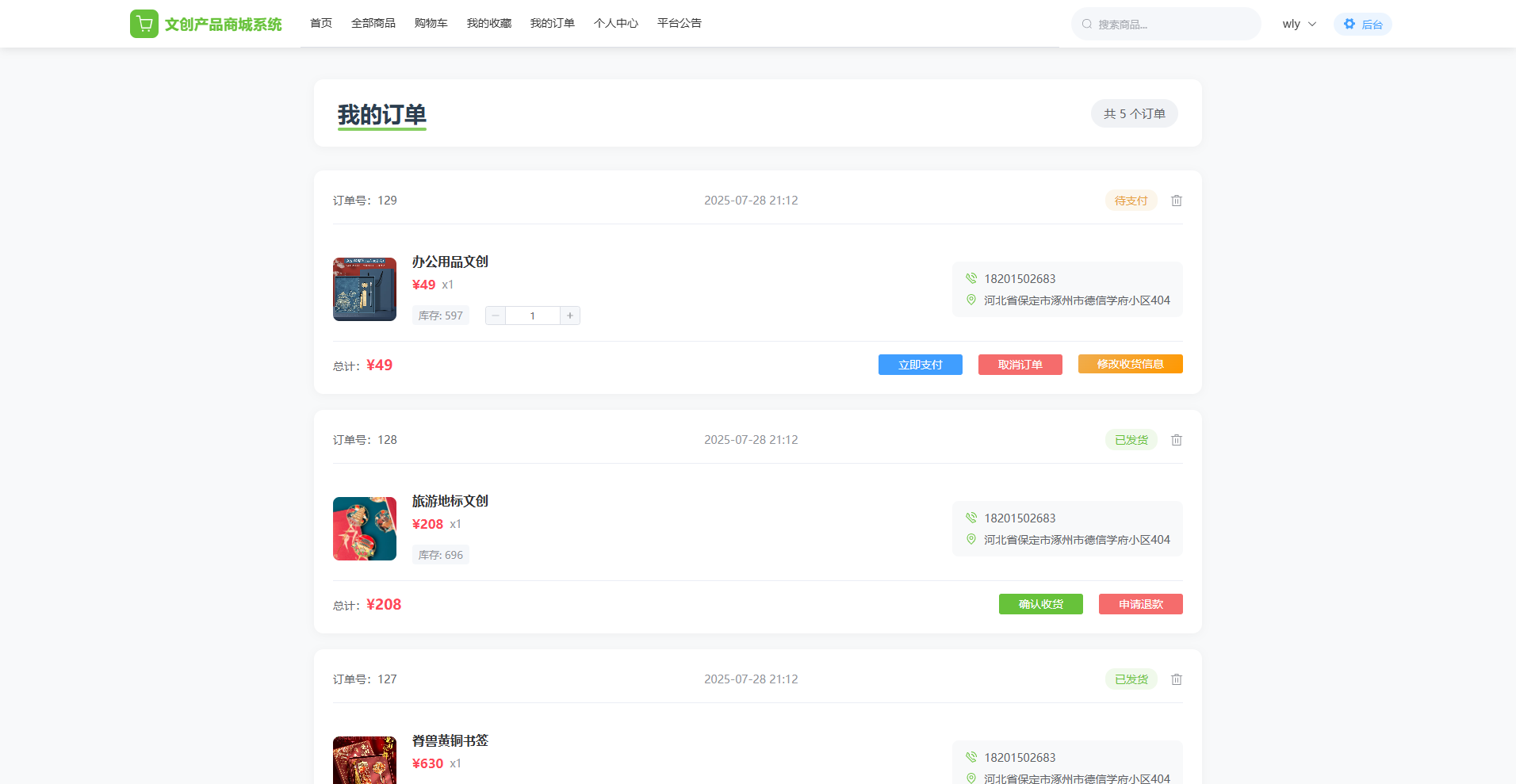 用户端:面向普通用户,支持多品类商品浏览、下单购买、购物车管理、订单追踪、地址管理、商品评价、收藏管理、公告查看、个人中心等功能,并通过协同过滤算法实现个性化商品推荐,打造涵盖文创产品选购、交易、服务的完整用户闭环,提升用户满意度与平台粘性。