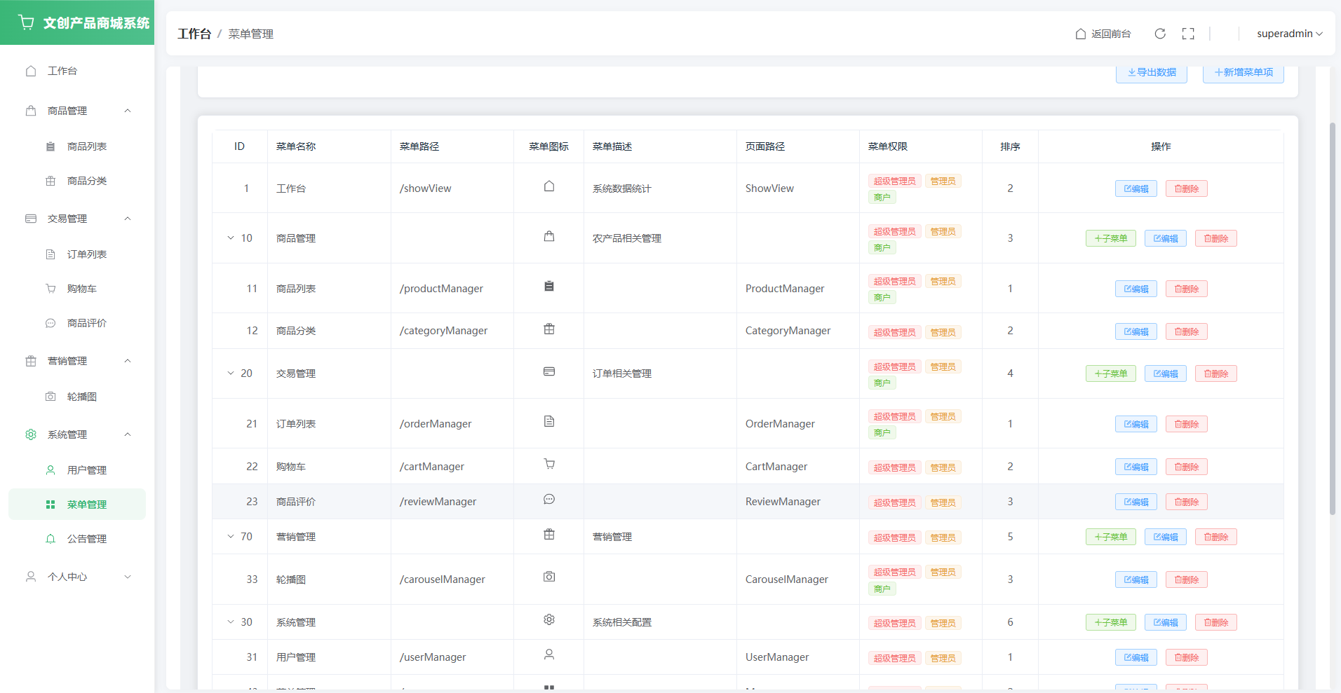 管理员与商家工作台支持订单、销售等多维数据可视化分析;RBAC权限模型确保多角色操作边界清晰,平台数据安全可靠。