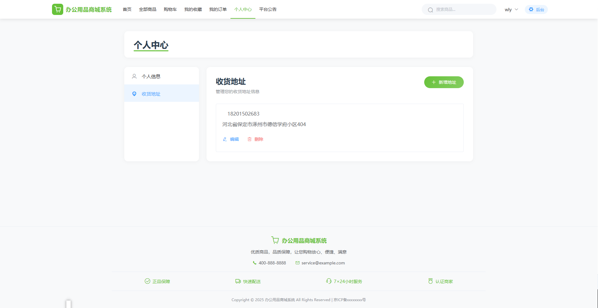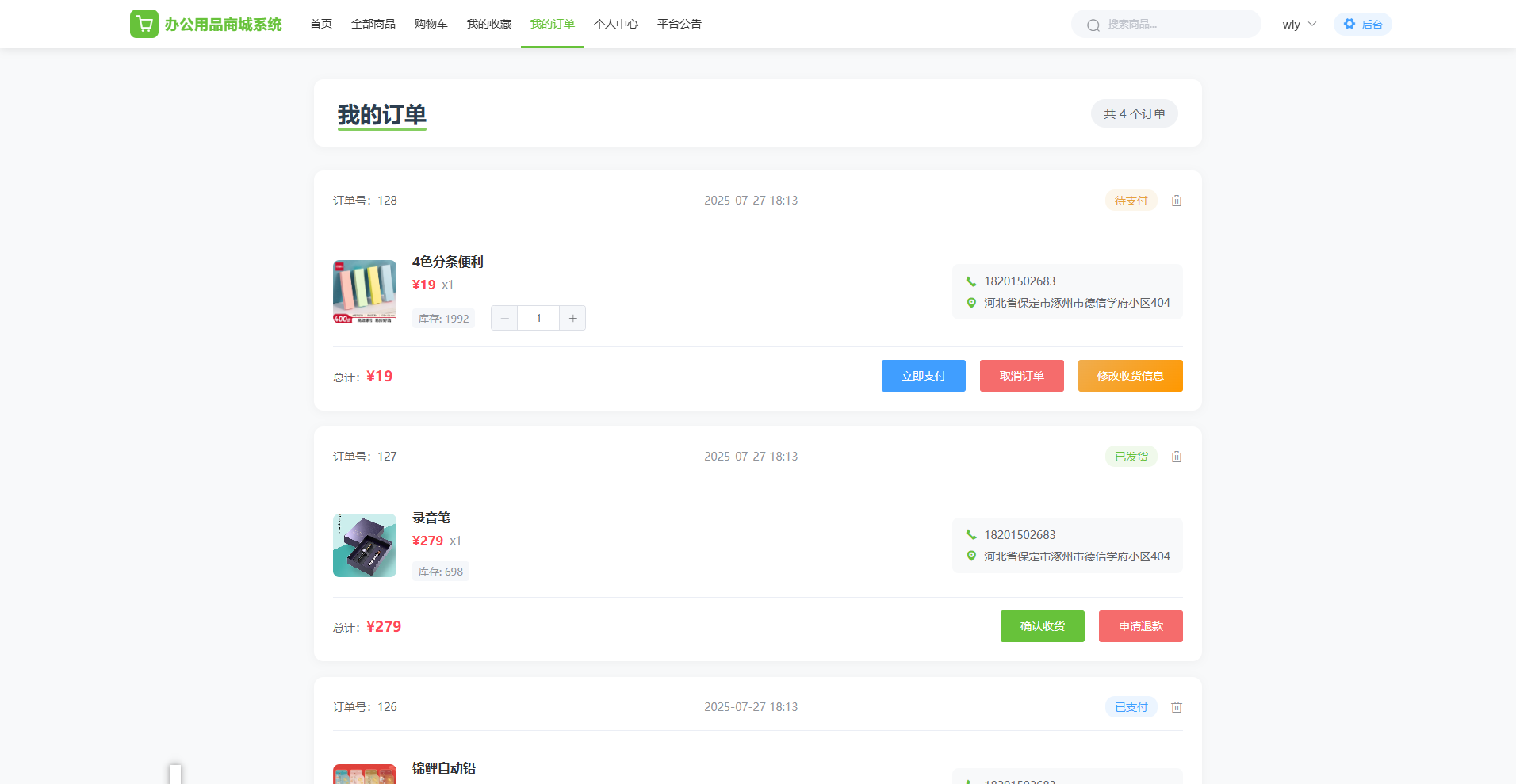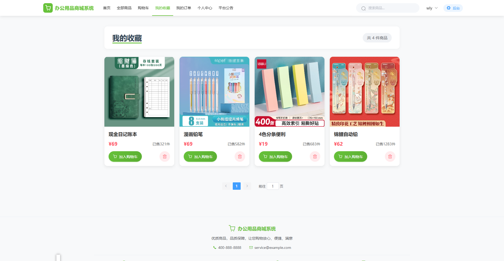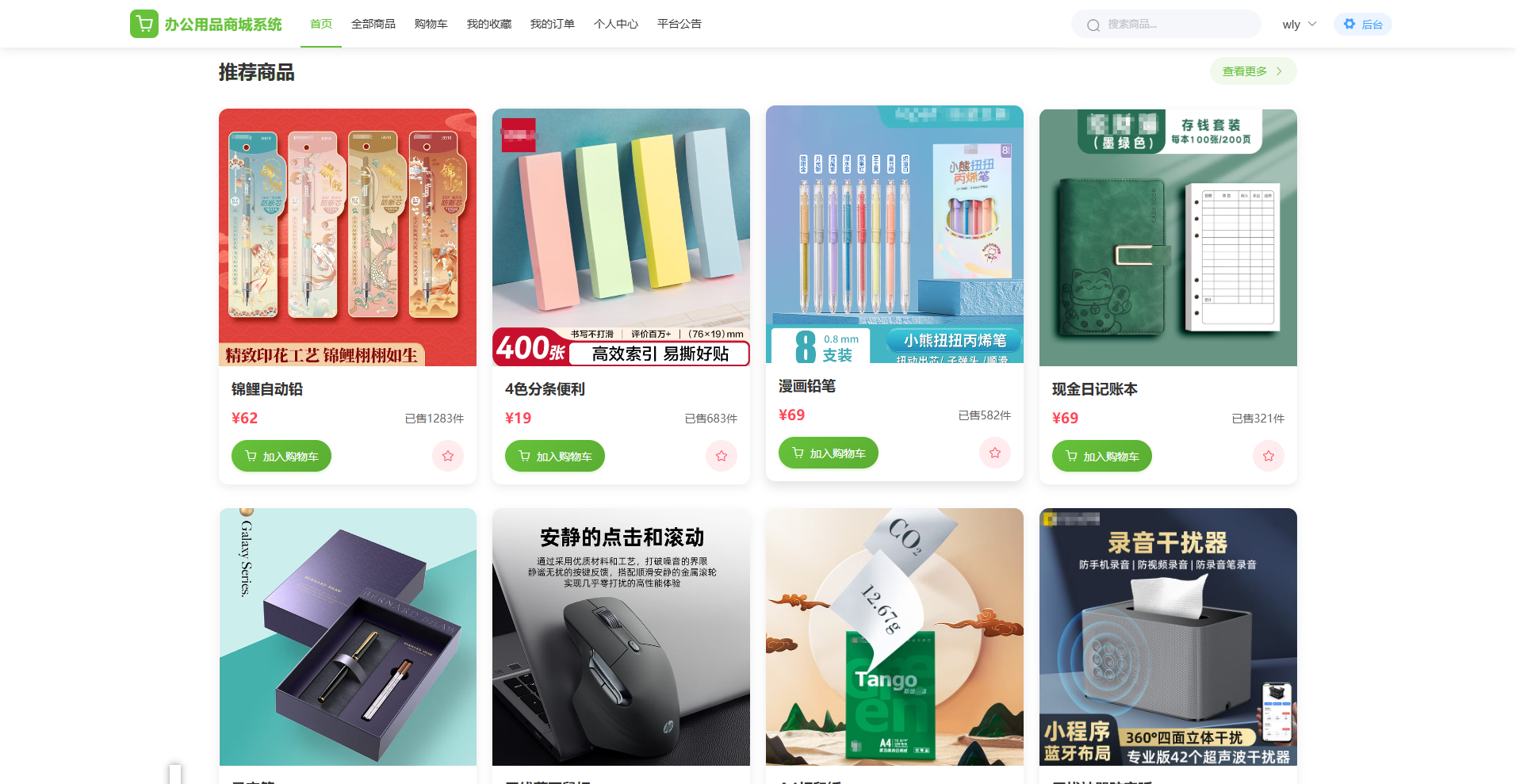 用户端:面向普通用户,支持多品类商品浏览、下单购买、购物车管理、订单追踪、地址管理、商品评价、收藏管理、公告查看、个人中心等功能,并通过协同过滤算法实现个性化商品推荐,打造涵盖办公用品选购、交易、服务的完整用户闭环,提升用户满意度与平台粘性。