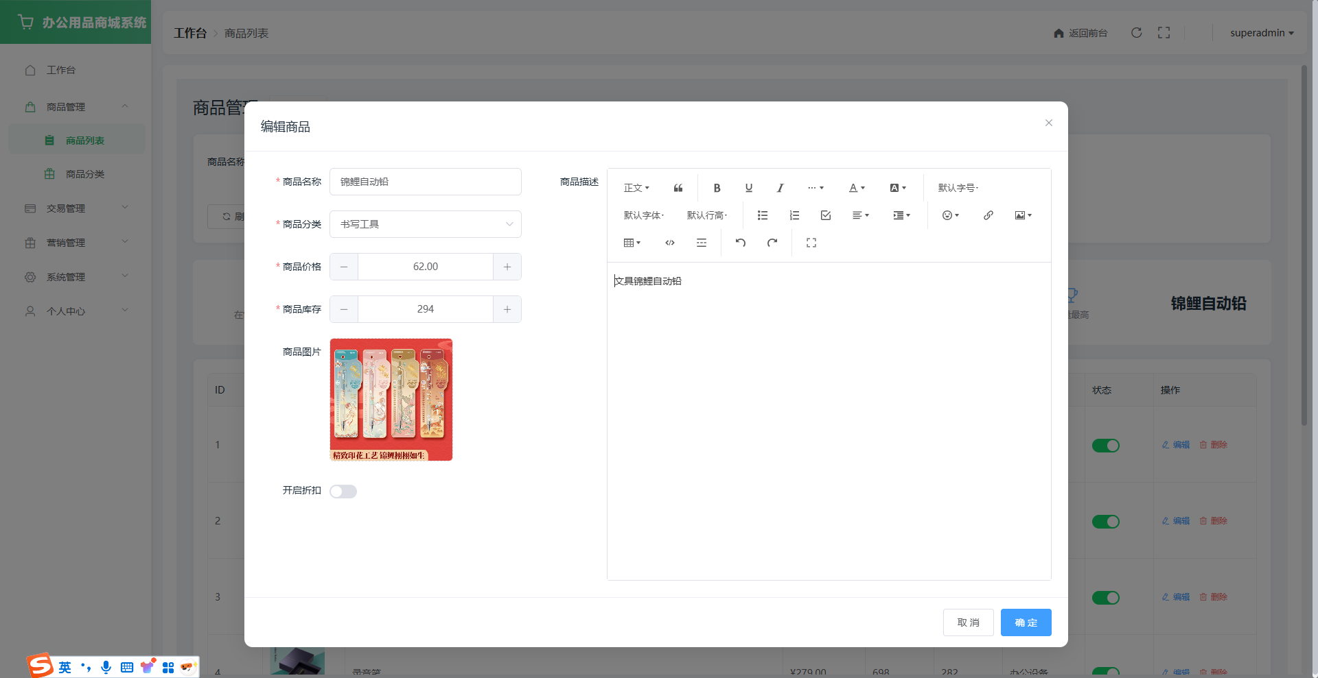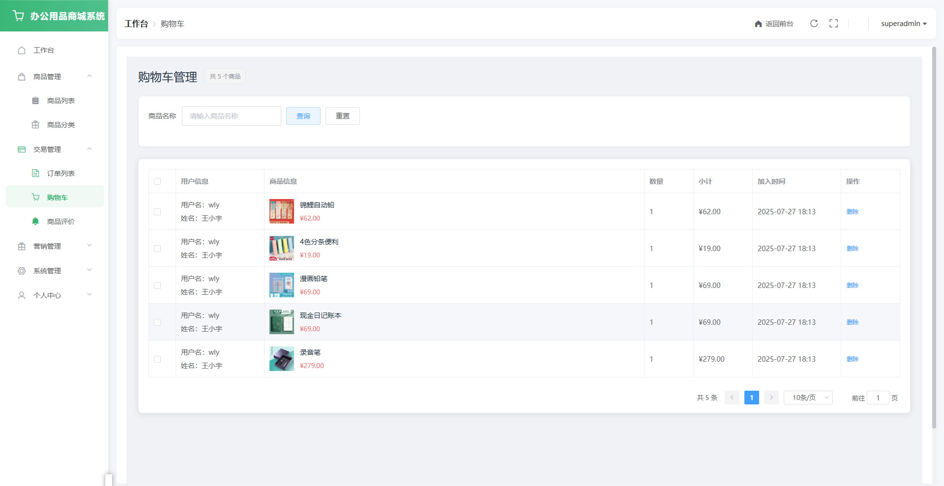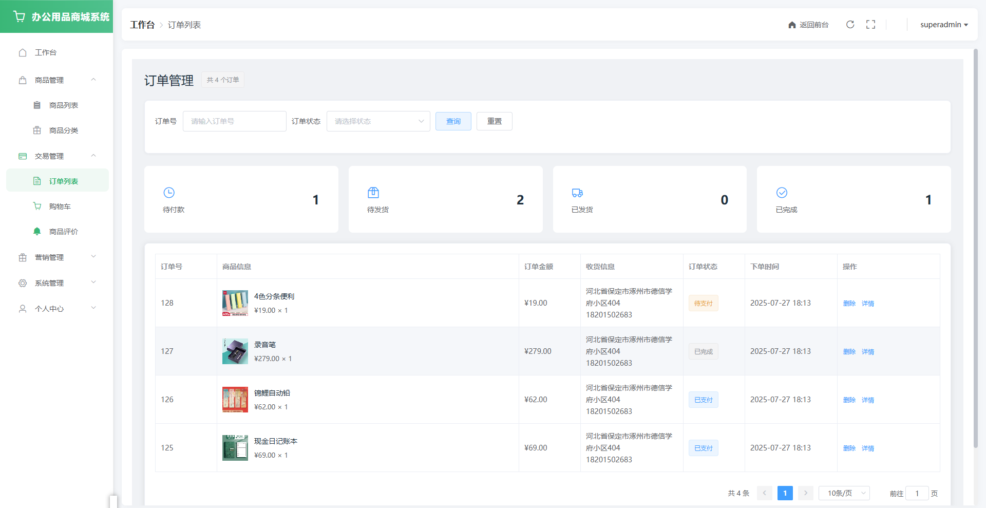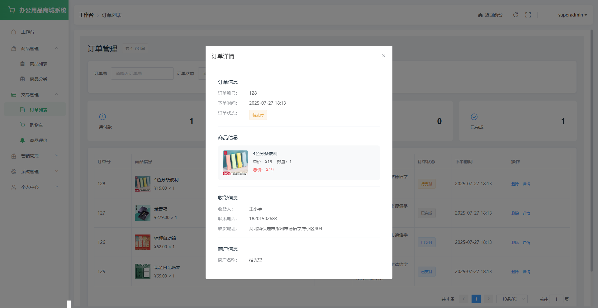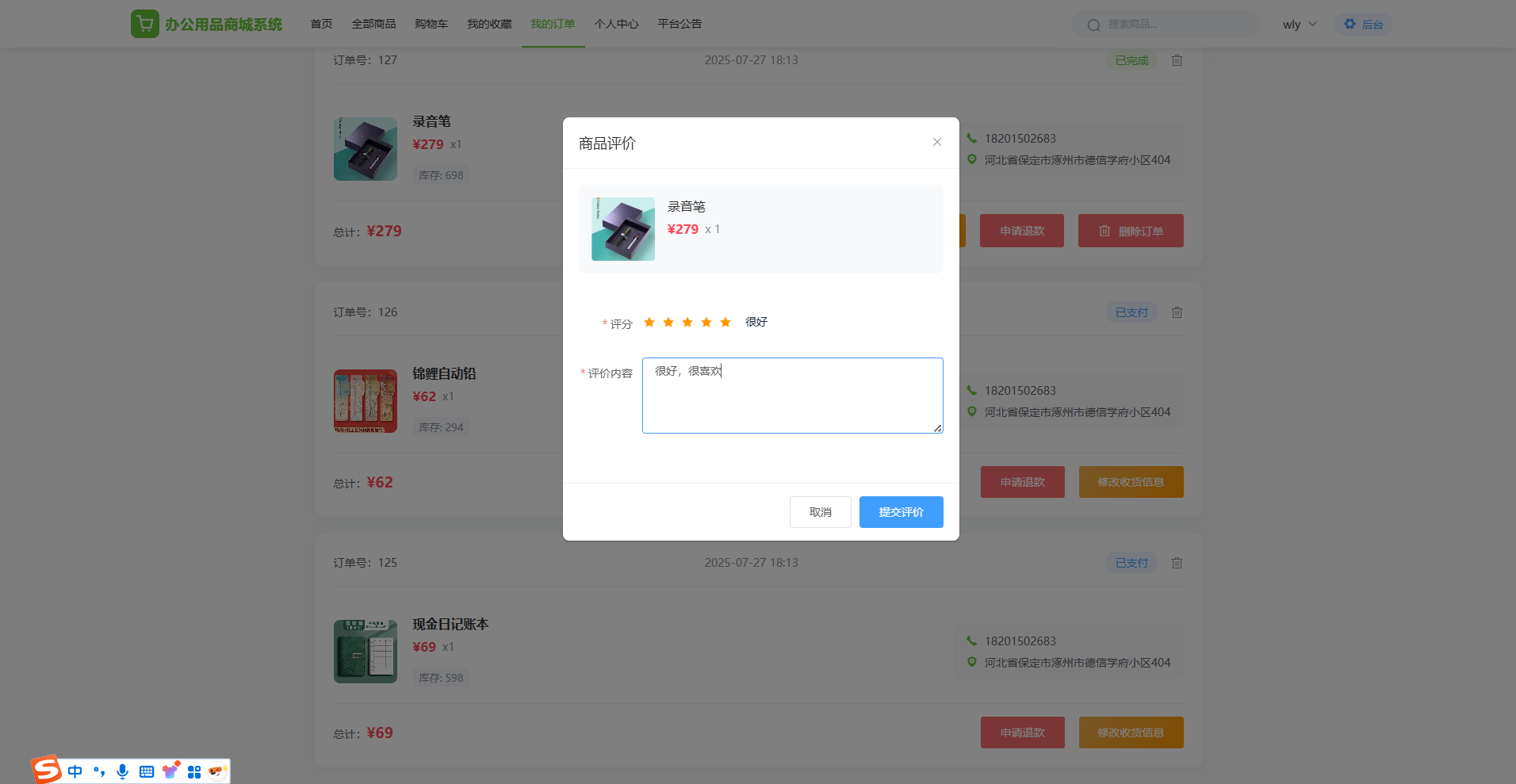 用户端:面向普通用户,支持多品类商品浏览、下单购买、购物车管理、订单追踪、地址管理、商品评价、收藏管理、公告查看、个人中心等功能,并通过协同过滤算法实现个性化商品推荐,打造涵盖办公用品选购、交易、服务的完整用户闭环,提升用户满意度与平台粘性。
