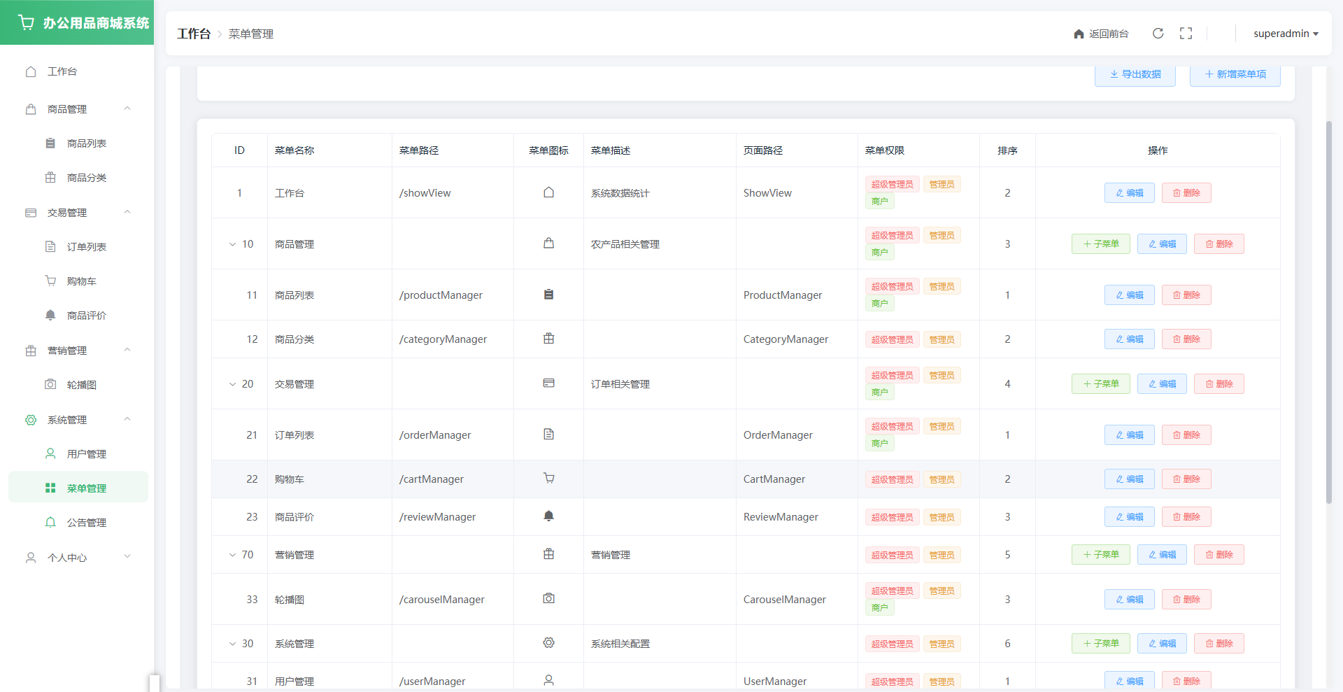 管理端:面向平台运营人员和各入驻商户,提供工作台、商品管理、分类管理、订单管理、购物车管理、评价管理、公告管理、轮播图管理、用户管理、菜单管理、个人中心等模块。通过ECharts实现销售、用户等多维数据的可视化,便于运营者实时掌控业务动态。