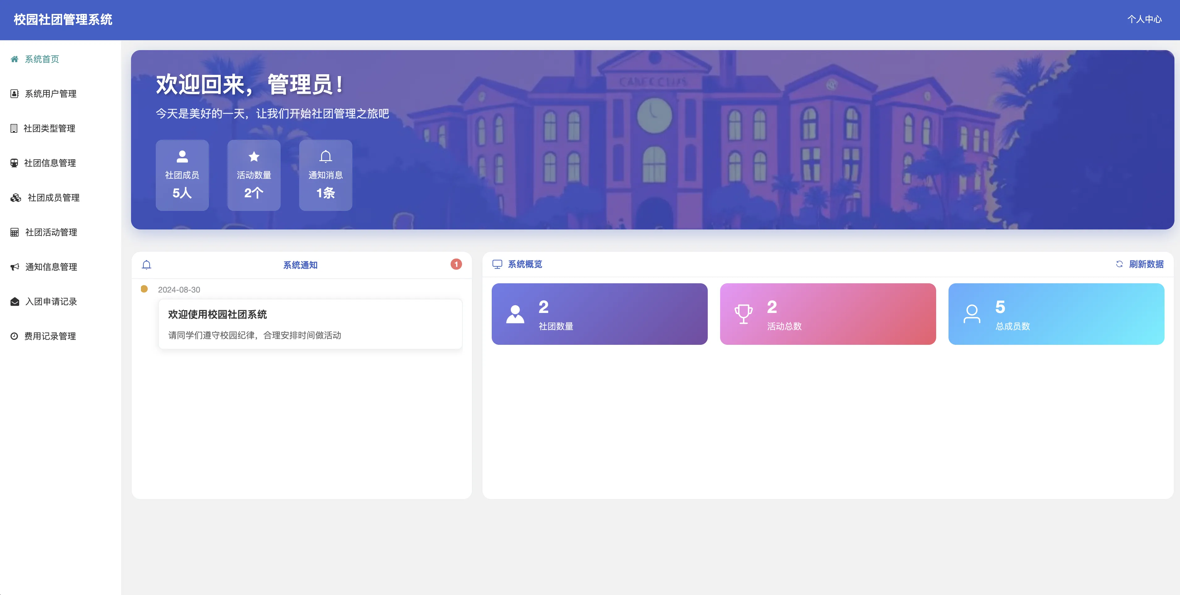 - 系统首页:展示社团数量、活动数量、成员数量、系统通知等信息。