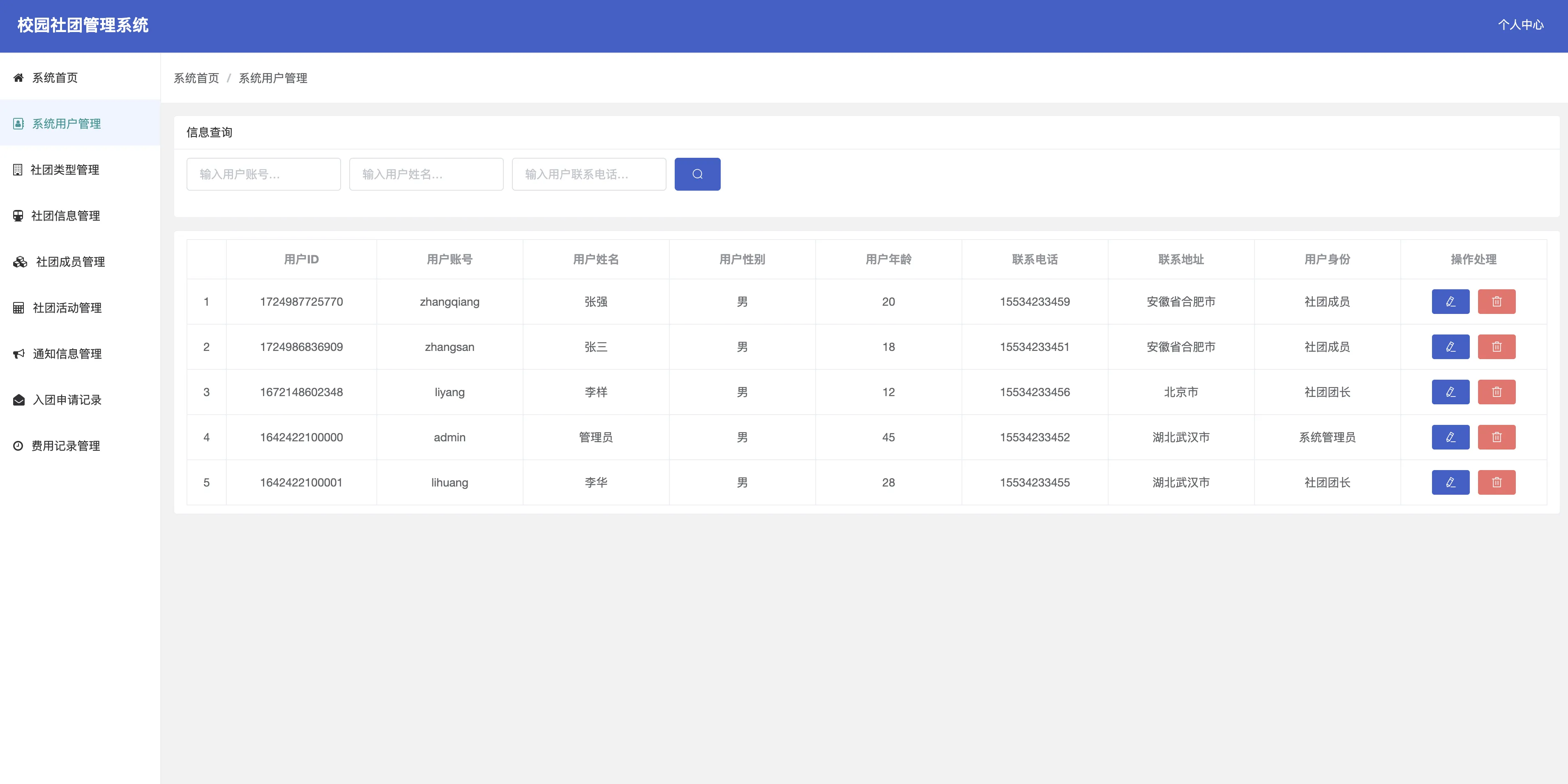 - 社团信息管理:展示所有社团信息,支持新增、编辑、删除社团。