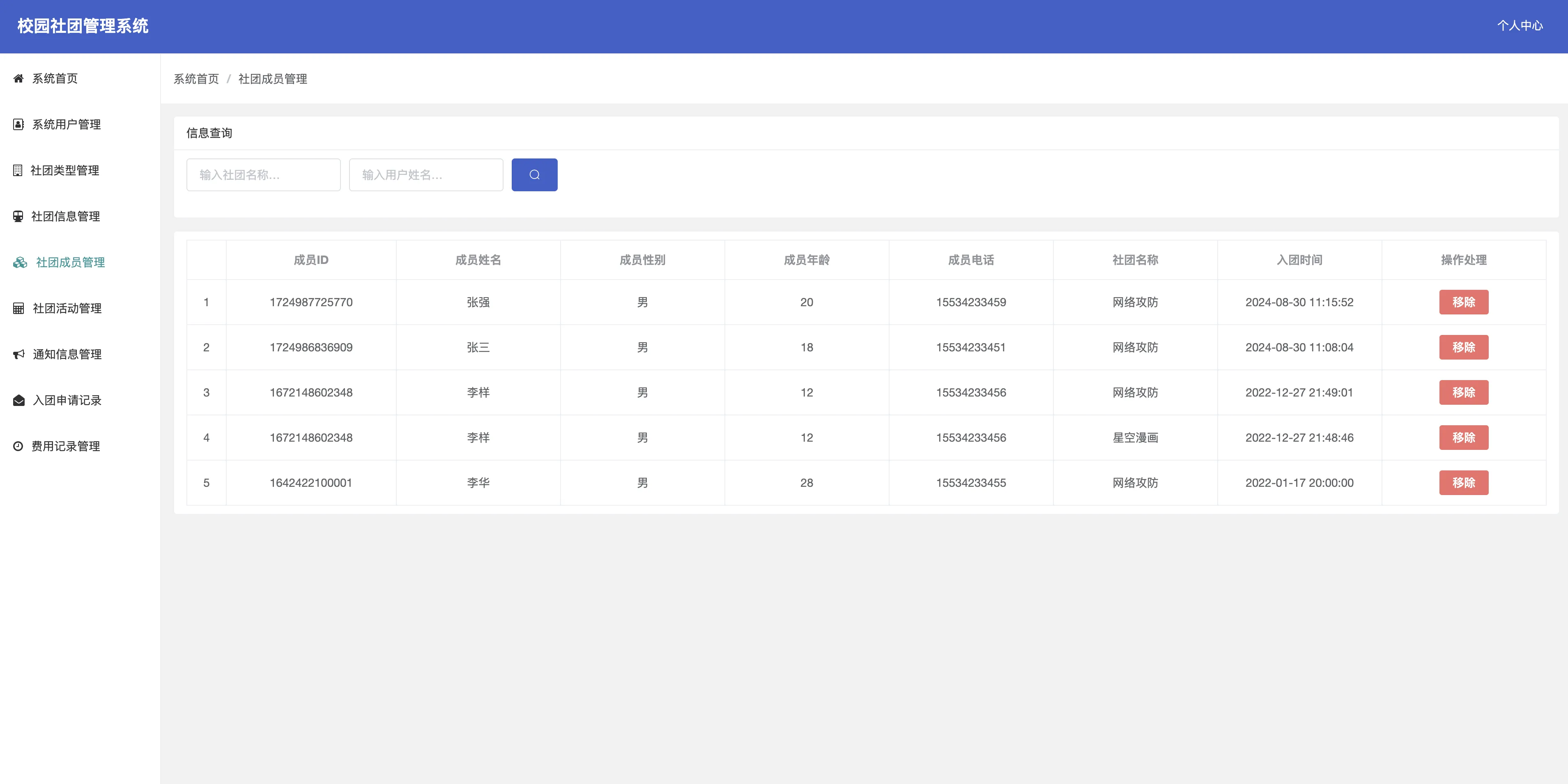 - 社团成员管理:管理各社团成员,支持成员的添加、移除等。