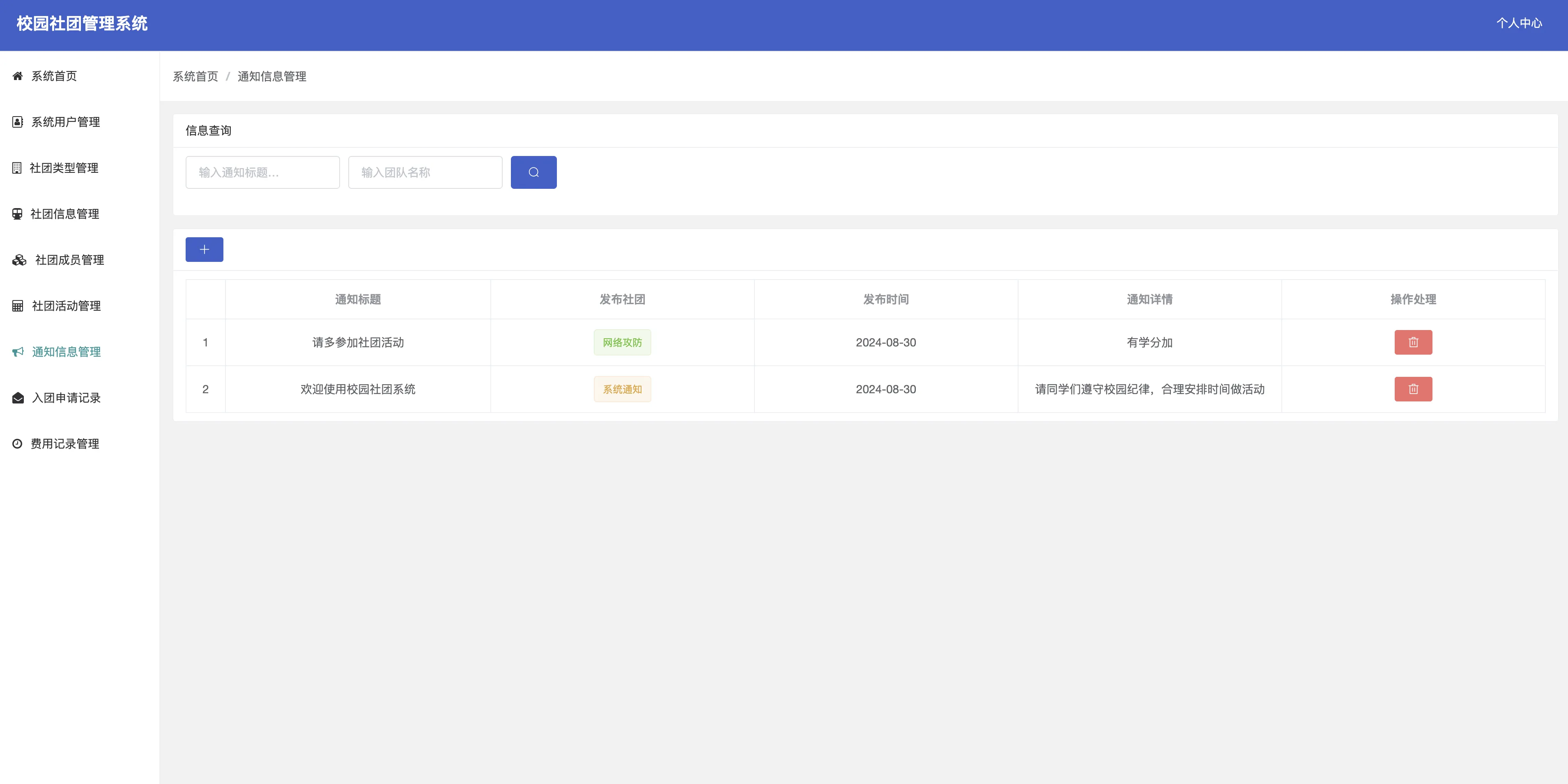 - 通知信息管理:管理系统通知与社团通知。