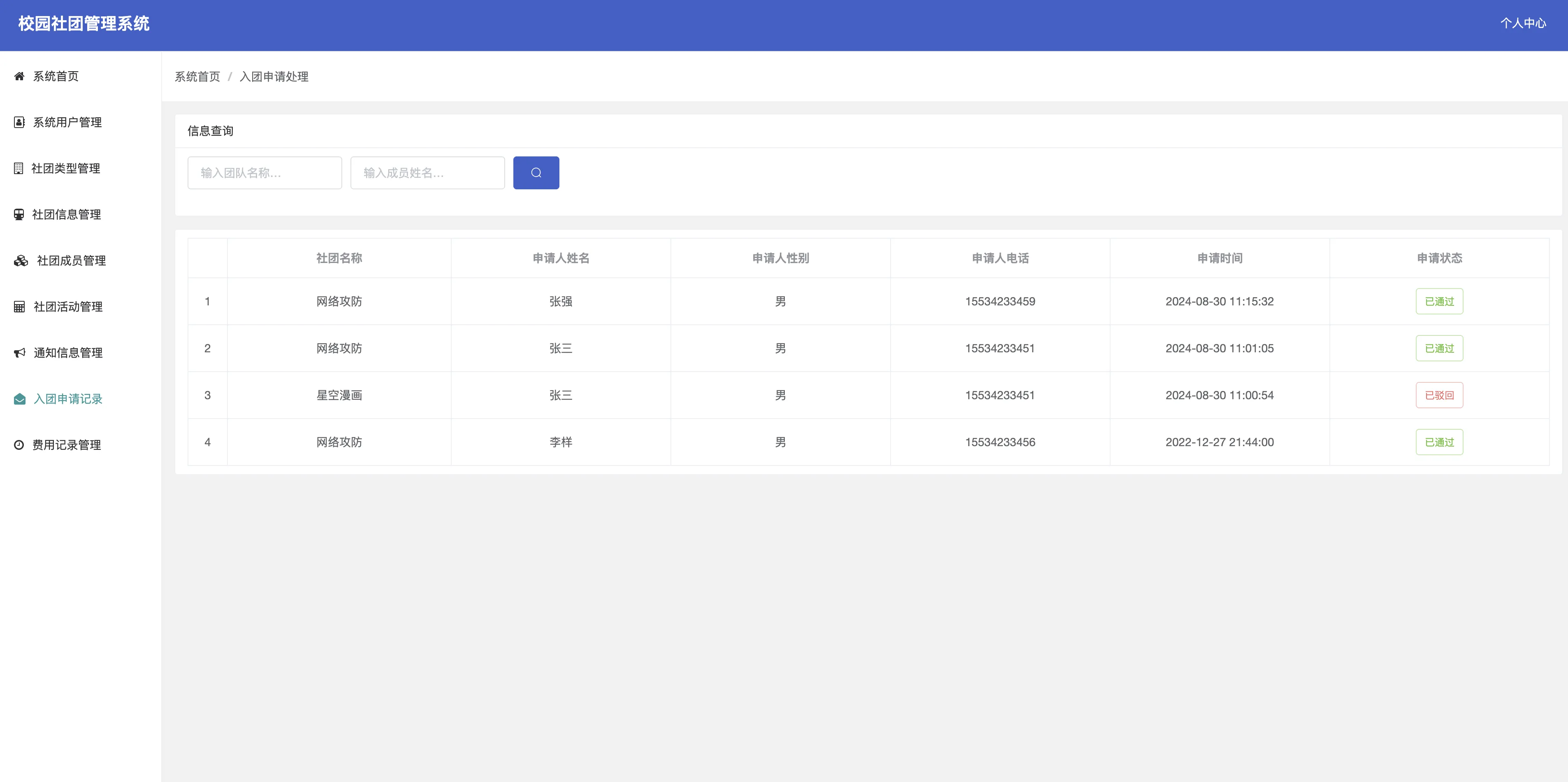 - 入团申请记录:支持成员报名活动,管理员审核报名信息。