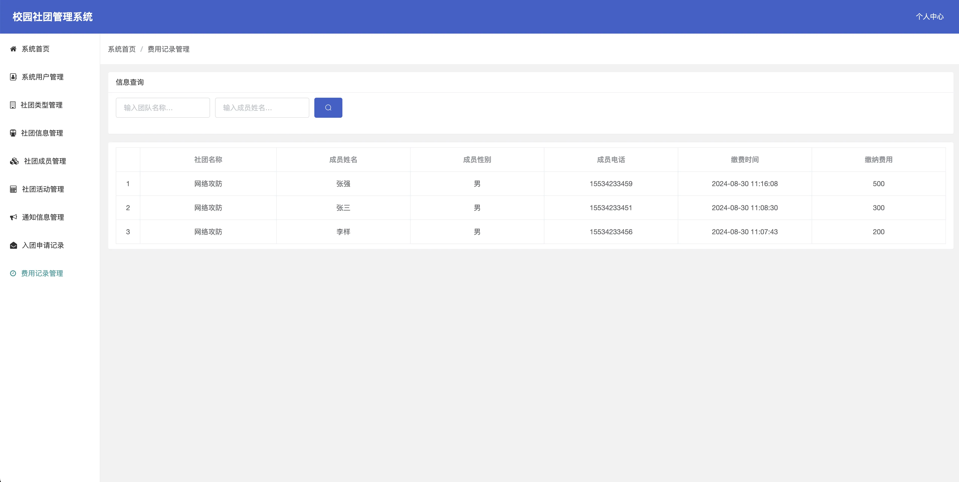 - 费用申请记录:展示社团成员缴纳费用记录信息。