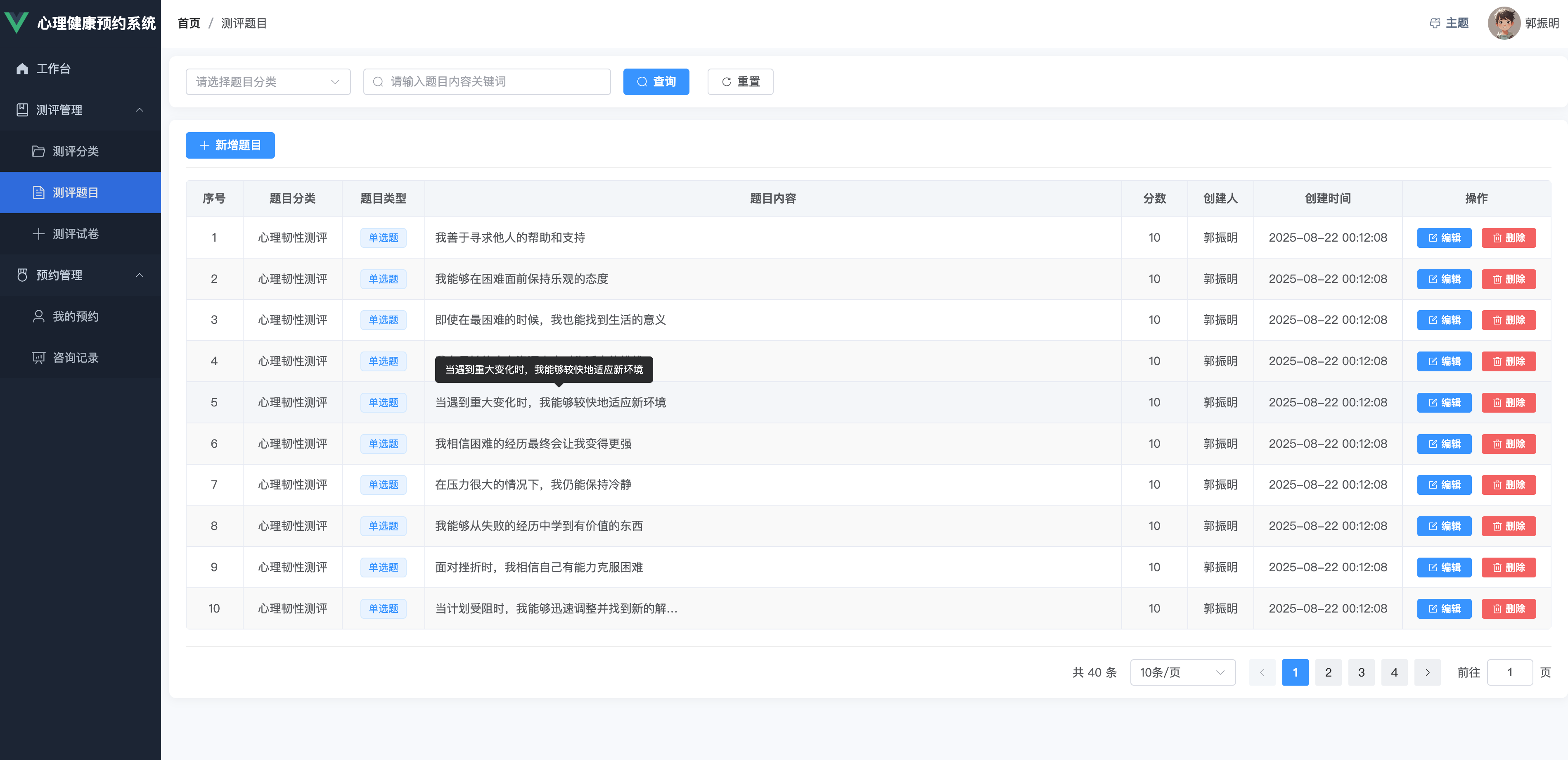 系统采用B/S架构与前后端分离模式:前端使用Vue3 + Element Plus构建现代化交互界面,后端基于Spring Boot3 + MyBatis Plus实现高效业务处理,数据库采用MySQL 8存储核心数据。整体架构充分考虑了系统的扩展性、可维护性和安全性。在专业性方面,系统集成了多种国际标准化心理测评量表,包括William Zung于1971年编制的焦虑自评量表(SAS)和抑郁自评量表(SDS)、Cohen等人开发的压力感知量表(PSS)以及心理韧性量表等专业评估工具。通过运用李克特量表计分方法、反向计分处理技术和专业评分标准,实现了标准化的心理状态评估和智能化的专业报告生成,为用户提供科学准确的心理健康评估服务。